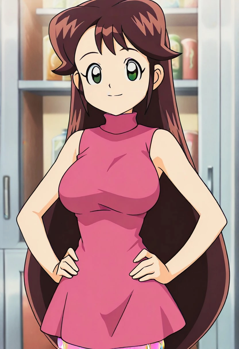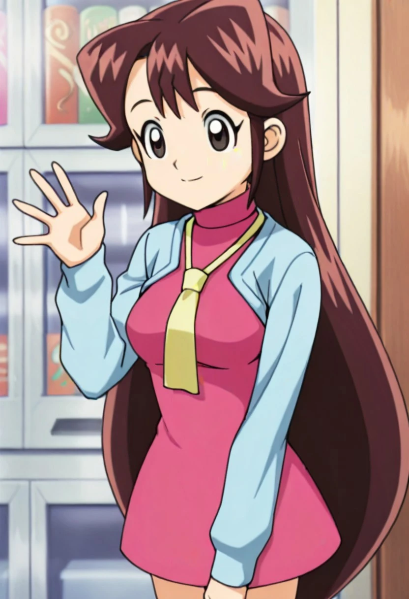 pink dress, turtleneck dress, minidress, blue sweater, long sleeves, yellow necktie