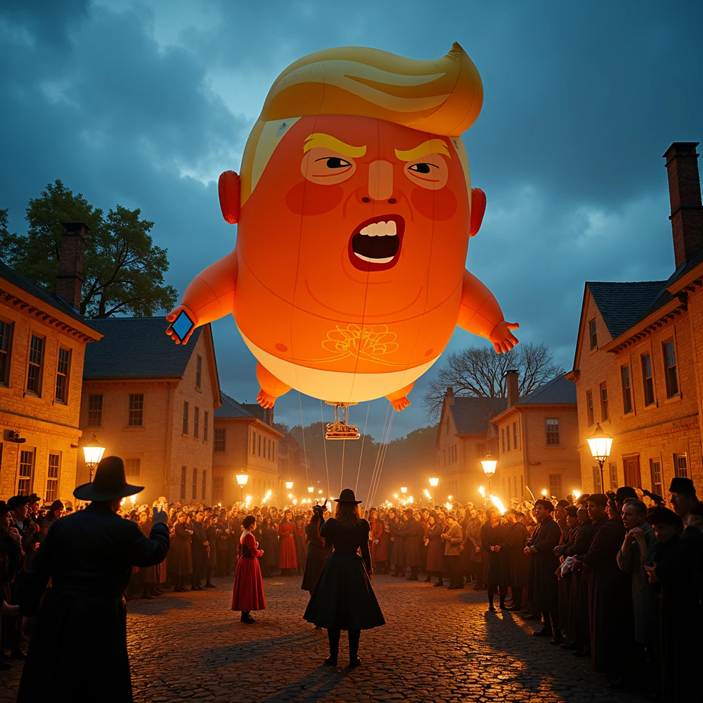 848yt helium parade balloon featuring a caricature of an angry man with exaggerated facial features, orange skin with a yellow hairdo, holding a cell phone, floating above the Salem Witch Trials