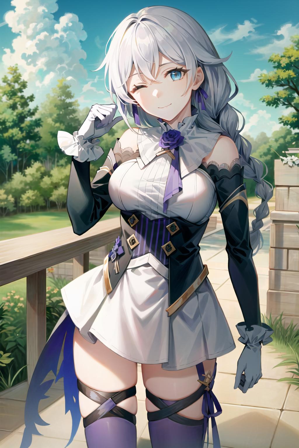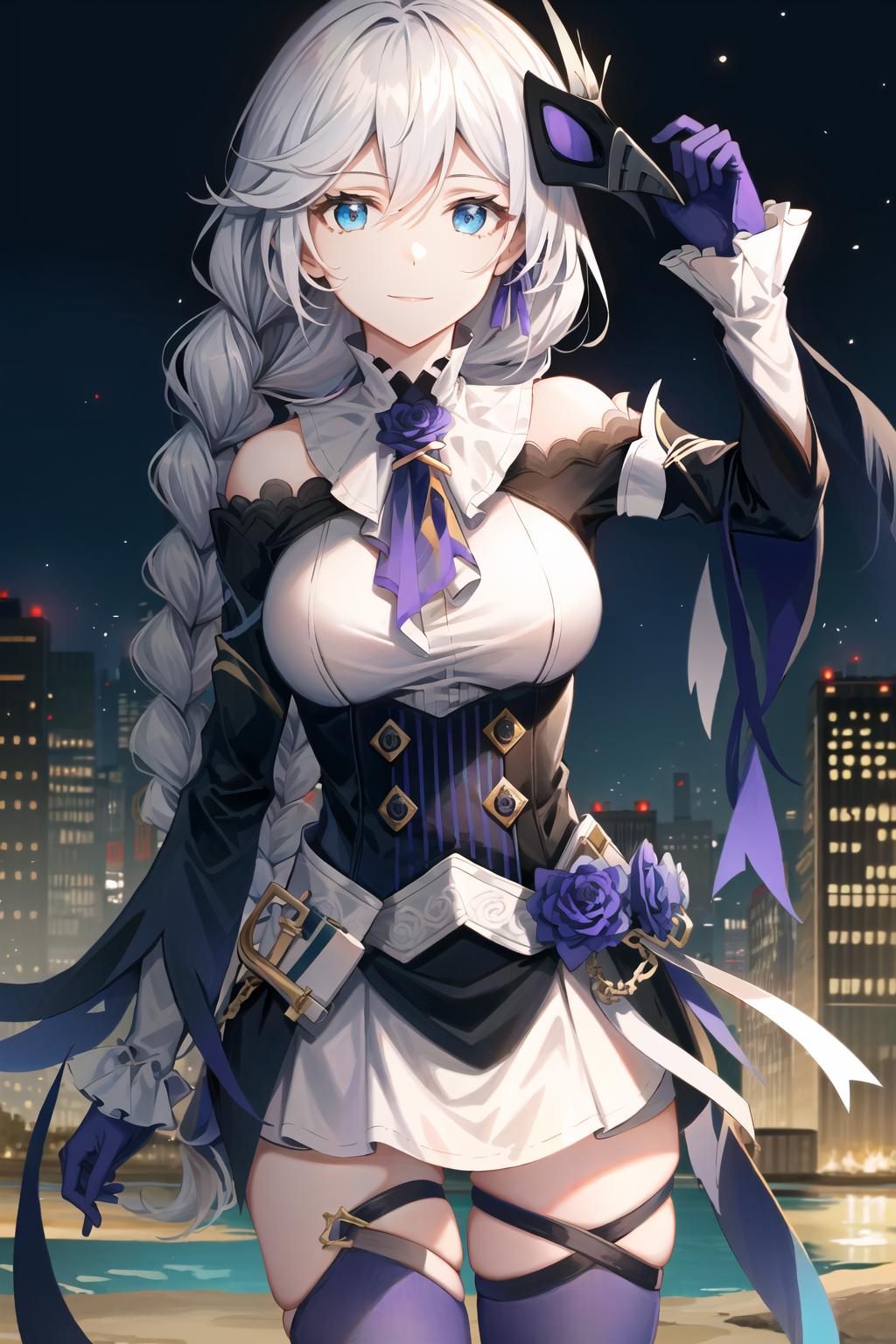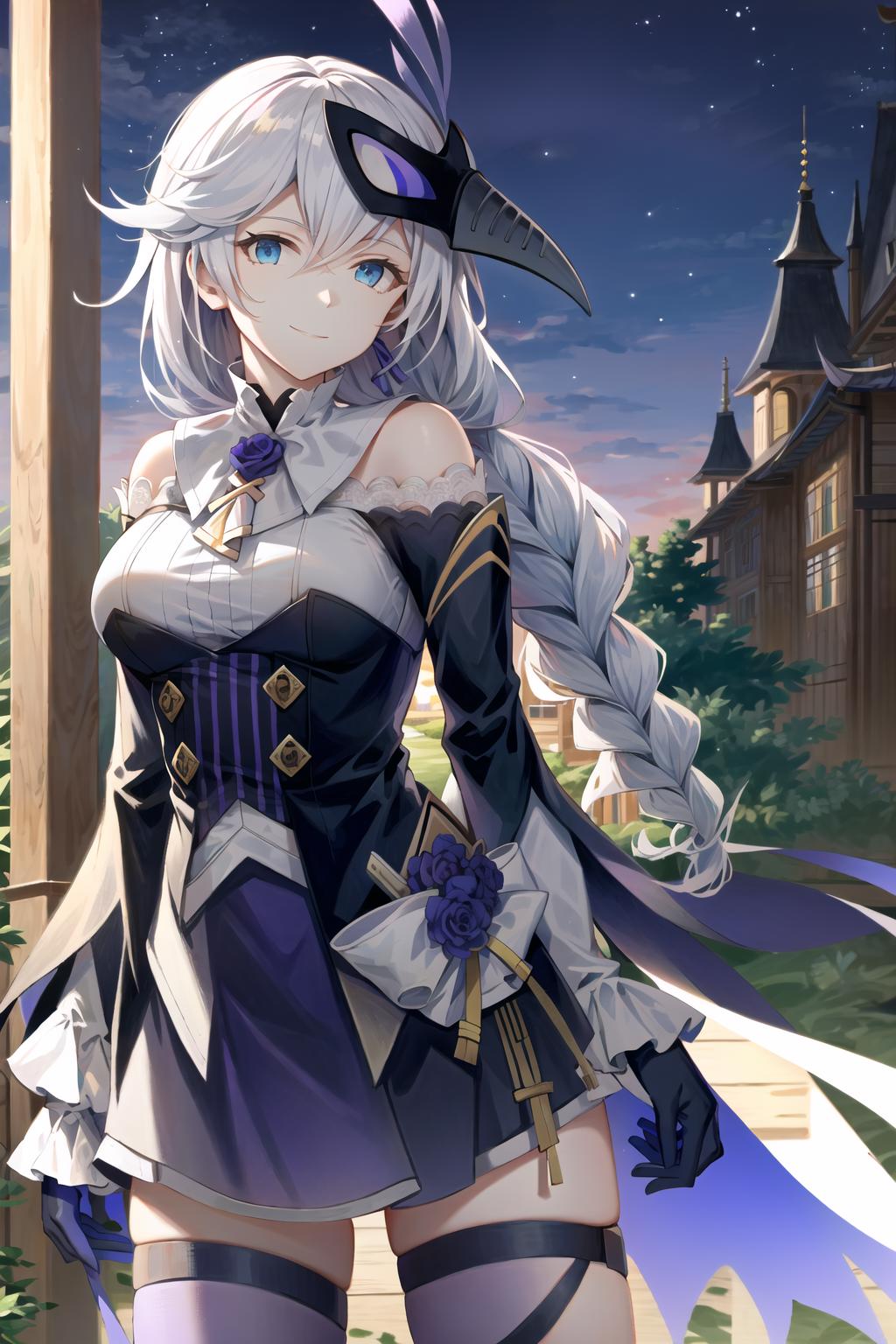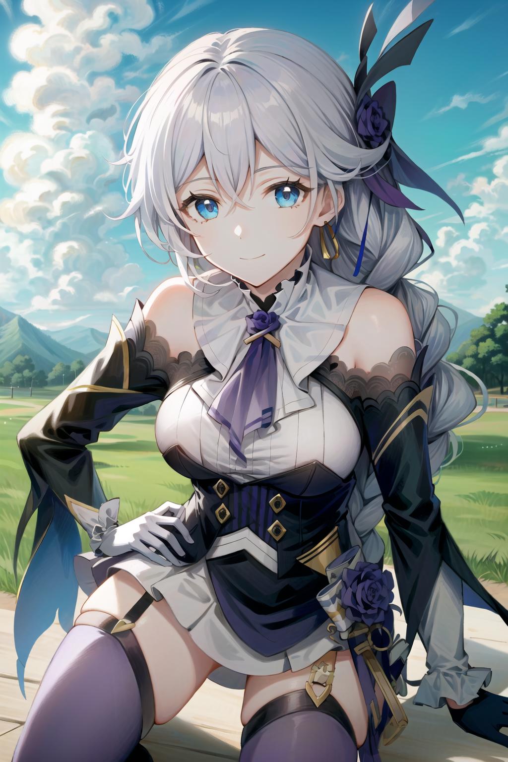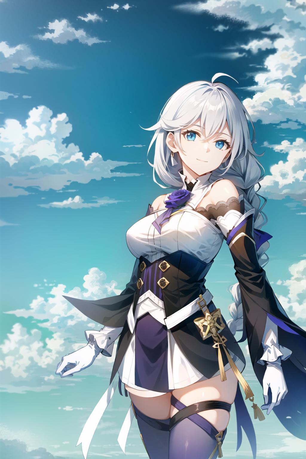 kallen kaslana (sixth serenade), kallen kaslana, white hair, blue eyes, braid, gloves, long hair, braided ponytail, bangs, bare shoulders, (purple thighhighs:1.1), (purple gloves:1.2), purple pants, long sleeves, hair between eyes, (large breasts:0.85), hair ornament, single braid, pants, flower