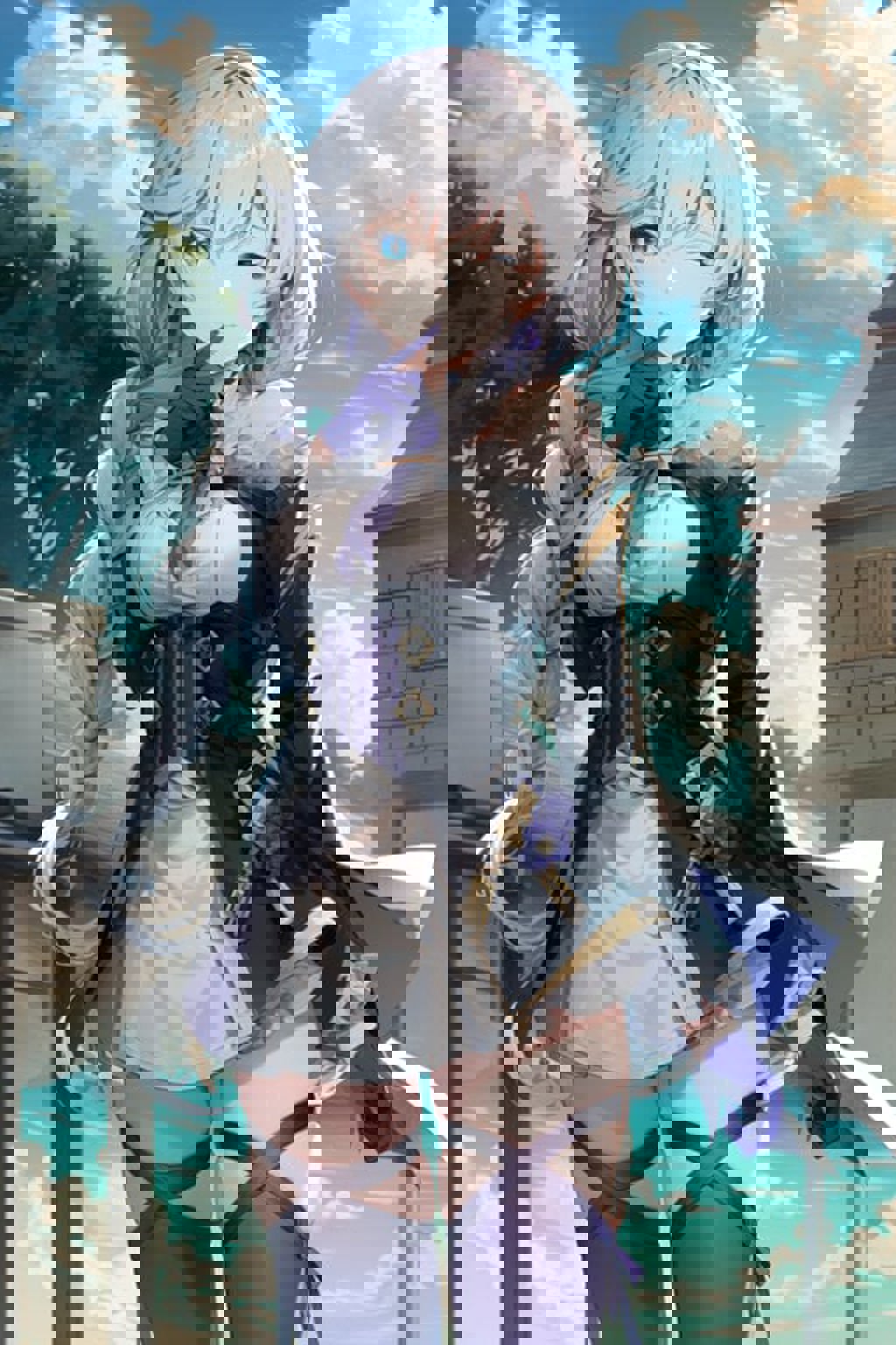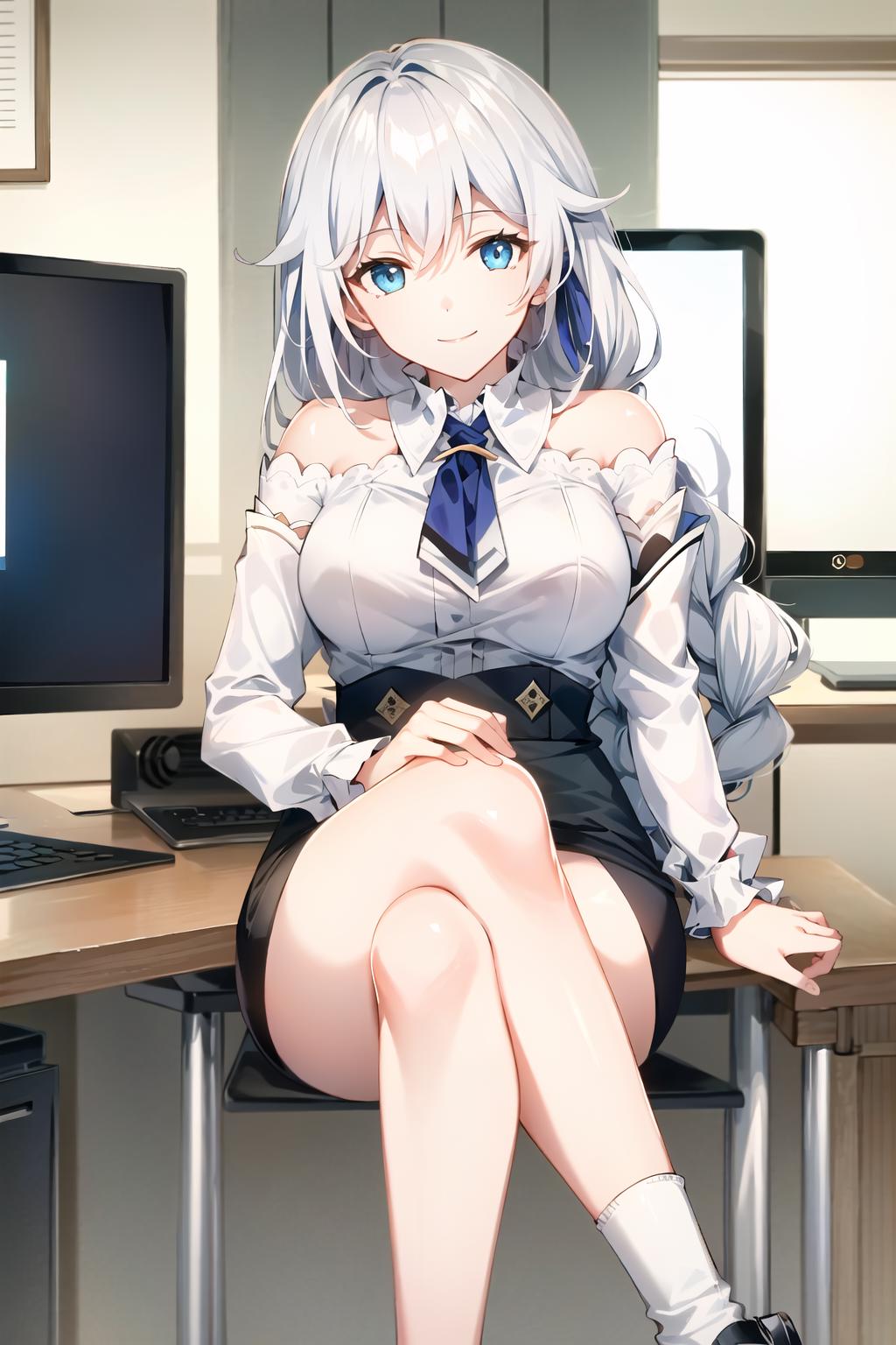 kallen kaslana, white hair, blue eyes, braid, long hair, braided ponytail, bangs, hair between eyes, breasts, single braid, [Explain in detail what clouthes you would like to trigger......]