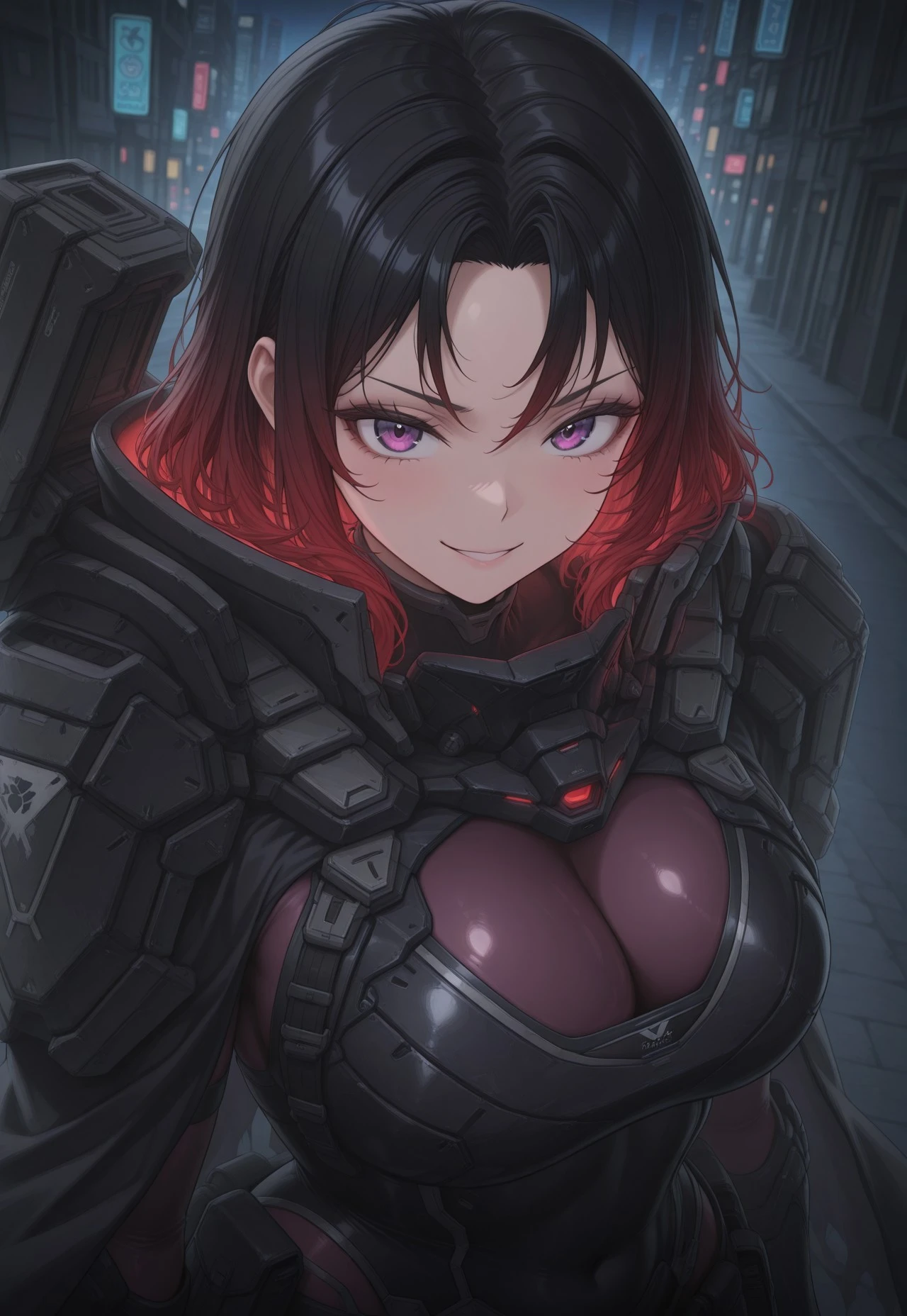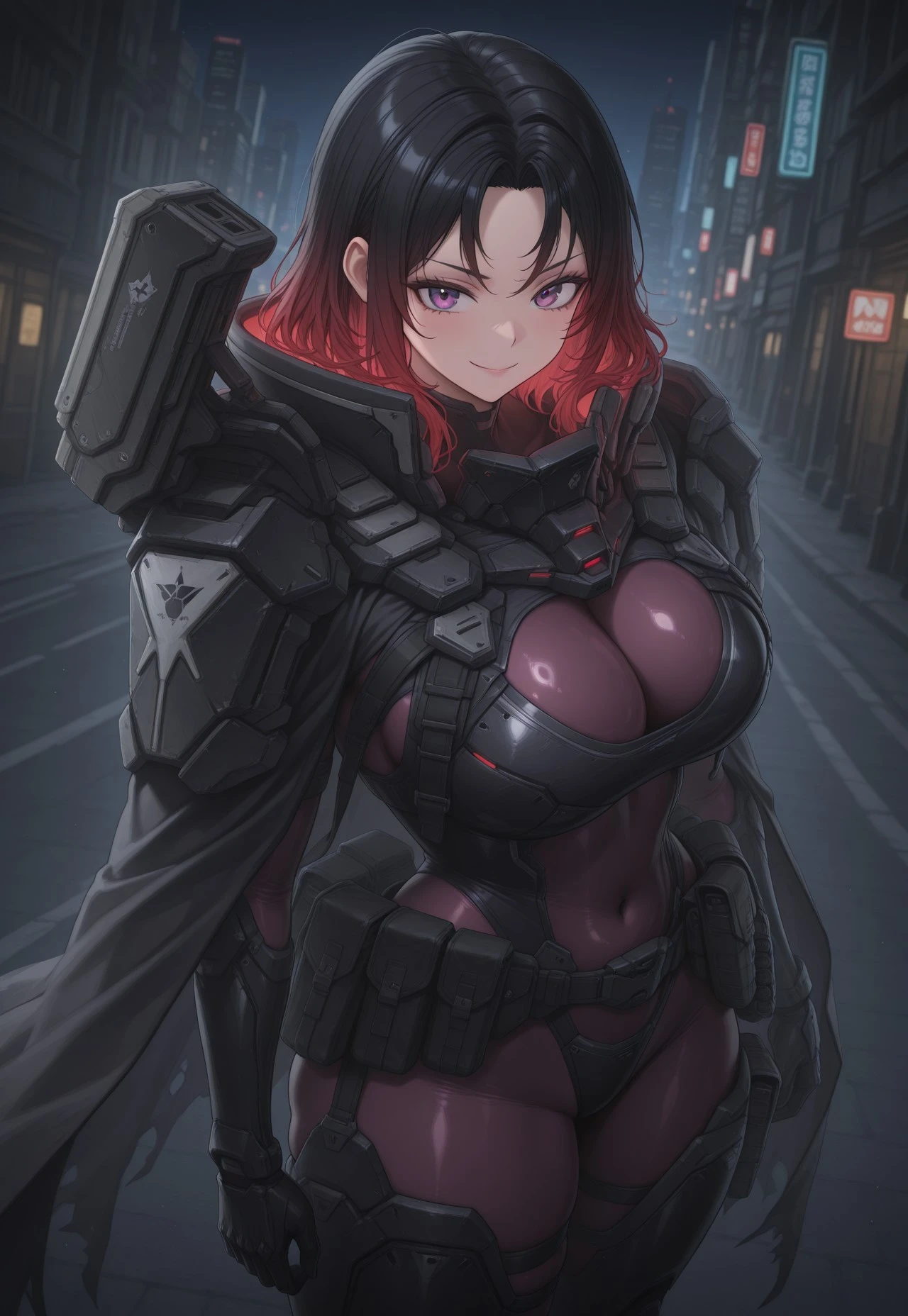 Main Prompt: E.H_(Nikke), Purple Eyes, Black Hair, Multicolored Hair, Gradient Hair, Red Hair Highlights, large breasts,