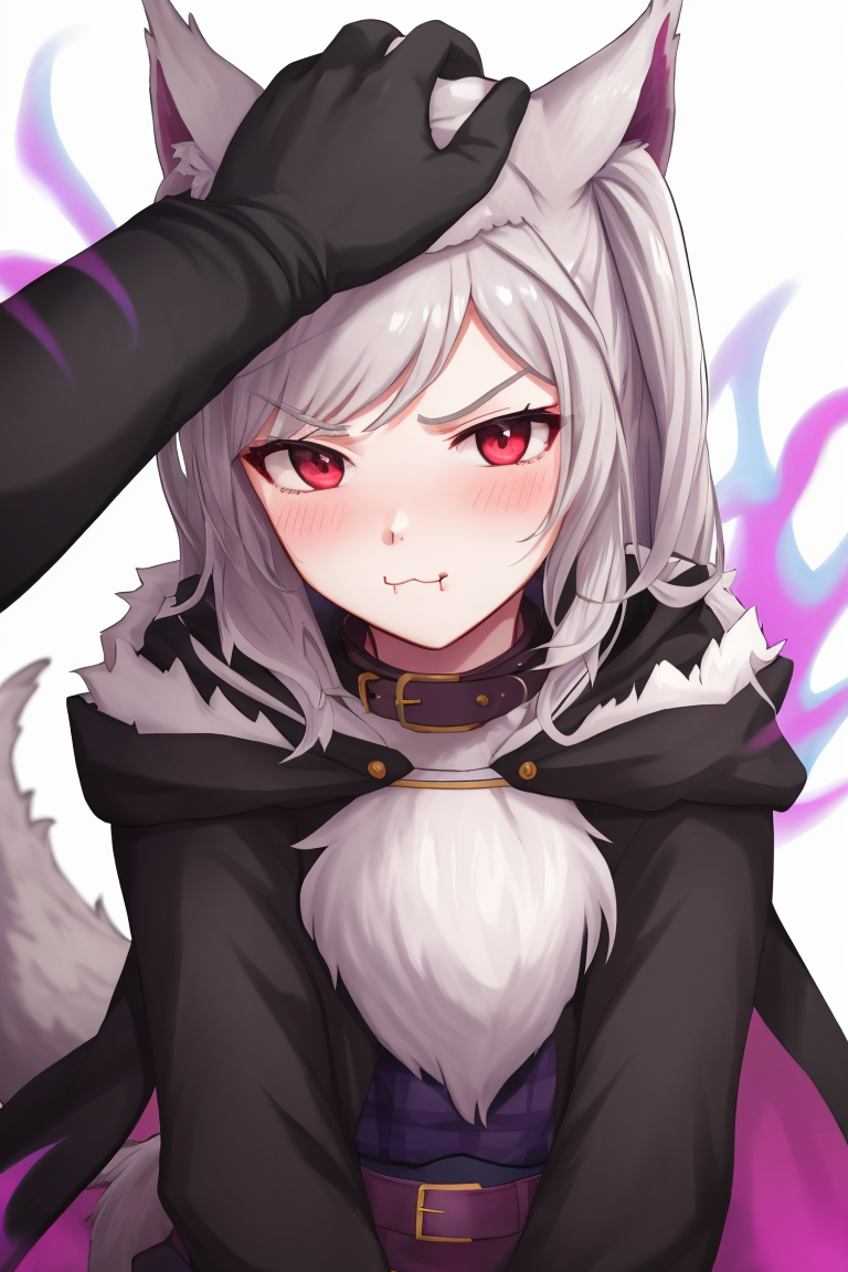 Prompt: fvrobin fe, gloves, tail, collar, fur trim, thigh strap, claws, wolf tail, halloween, animal hands, paw gloves, aura, paw shoes, dark aura