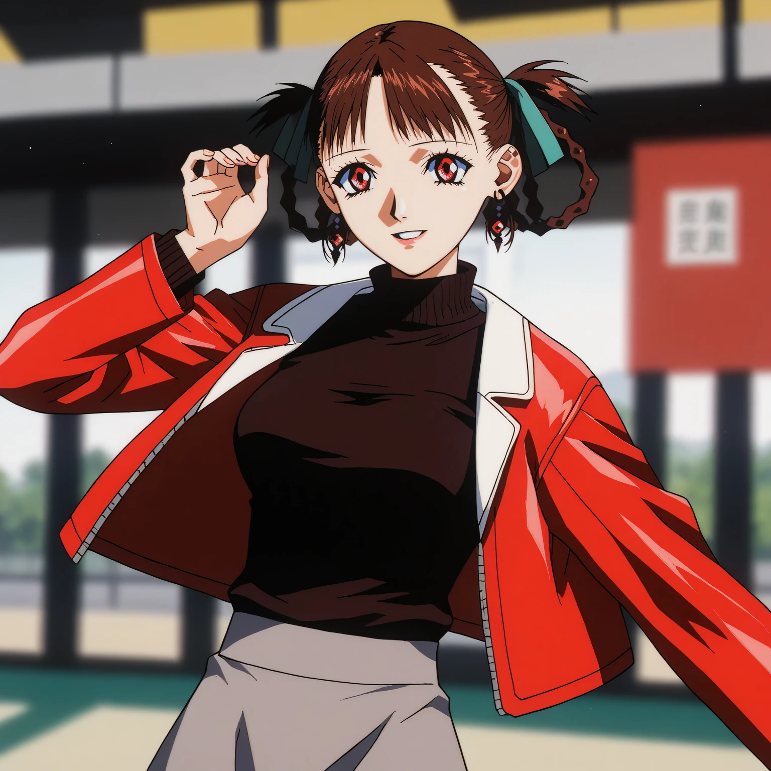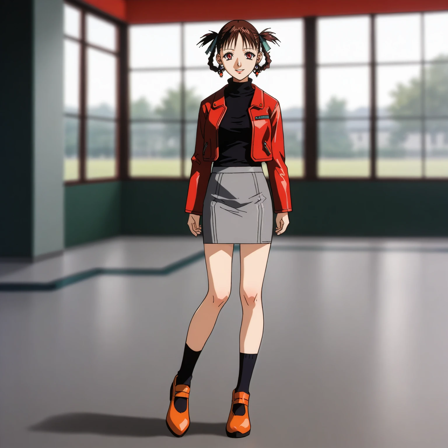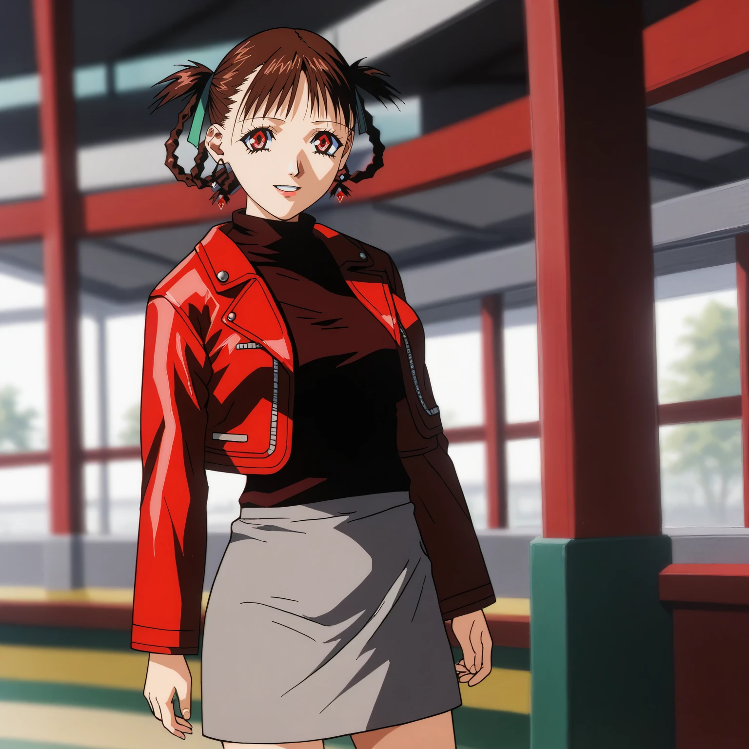 red leather jacket,turtleneck,black sweater,open jacket, gray skirt,