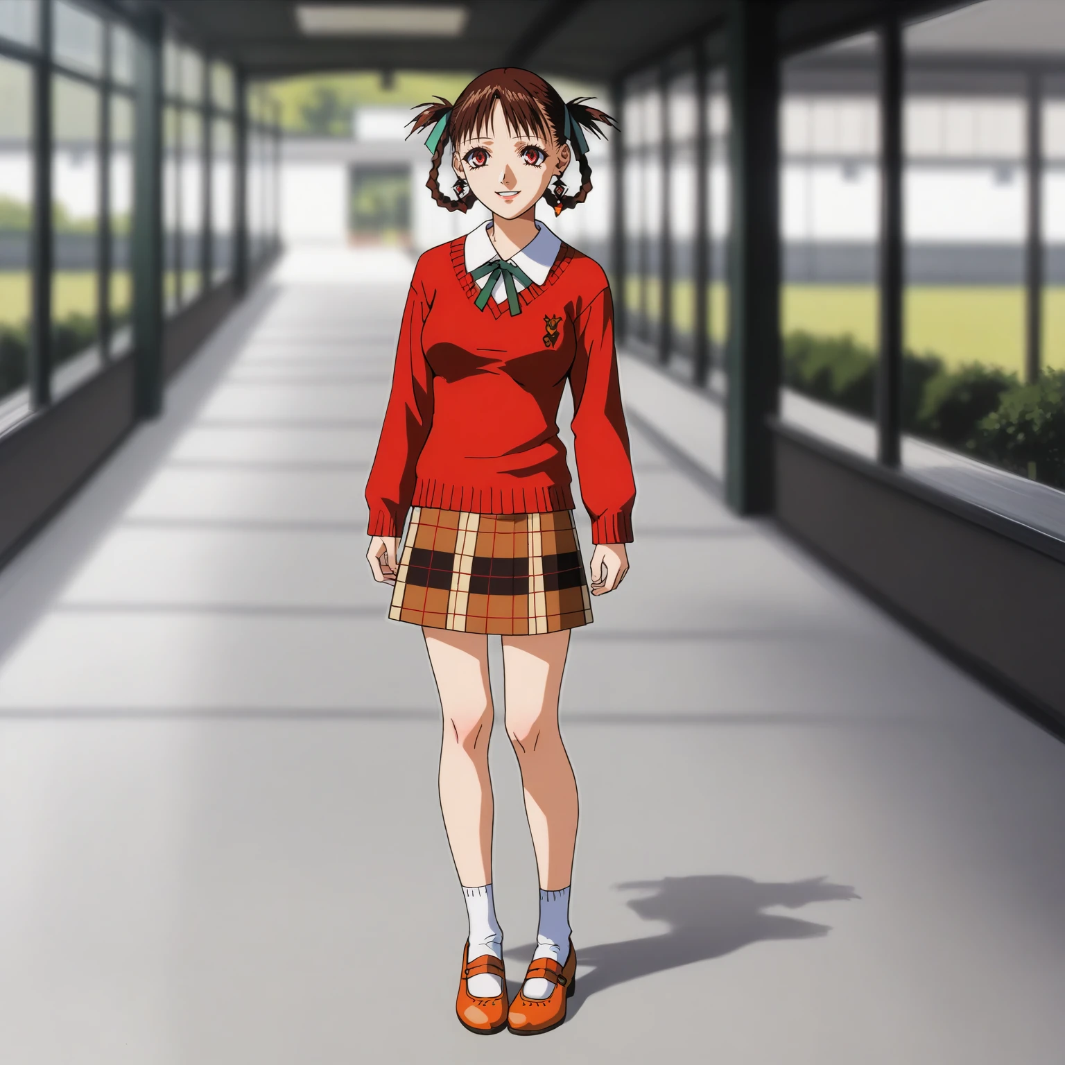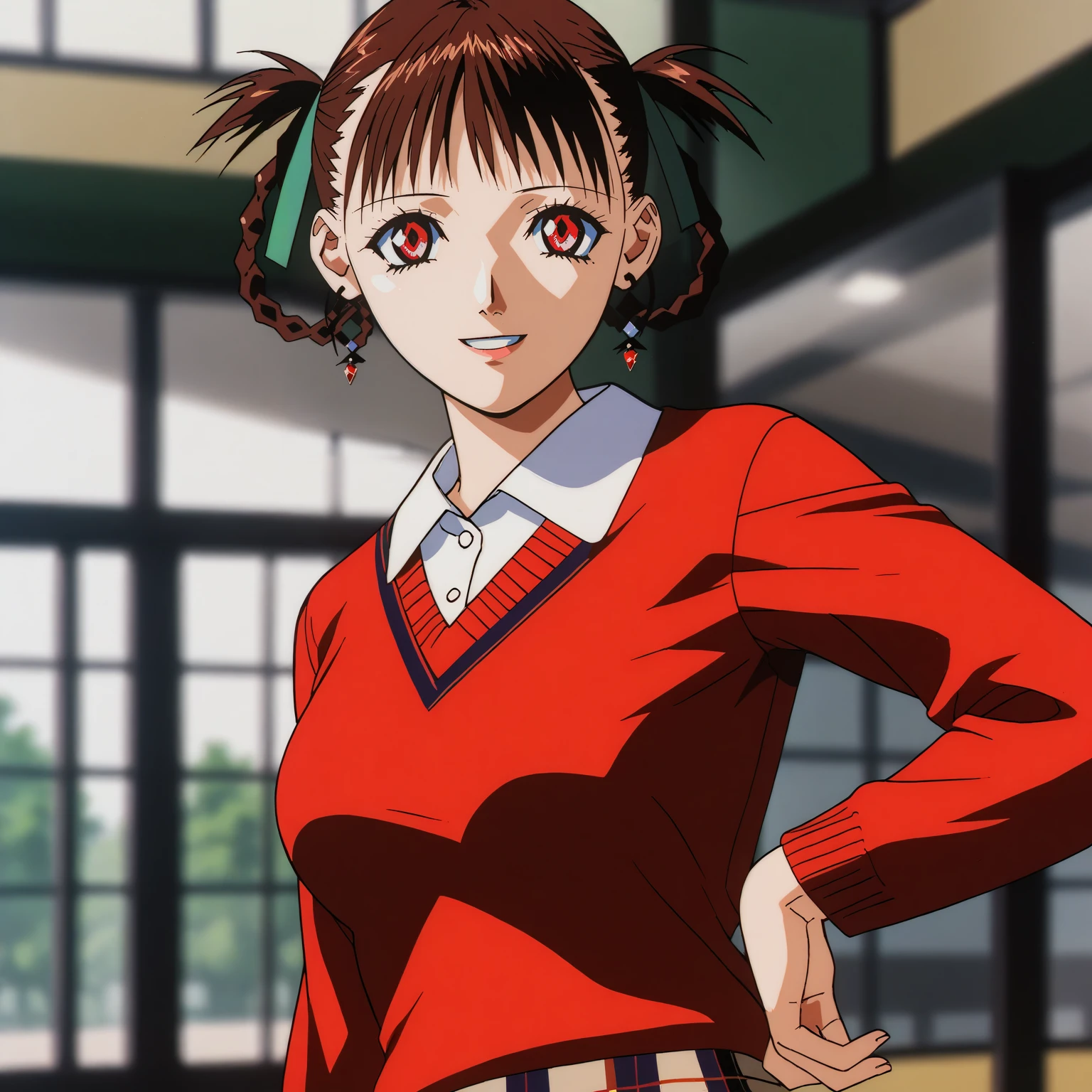 red sweater,collared_shirt, plaid_skirt,