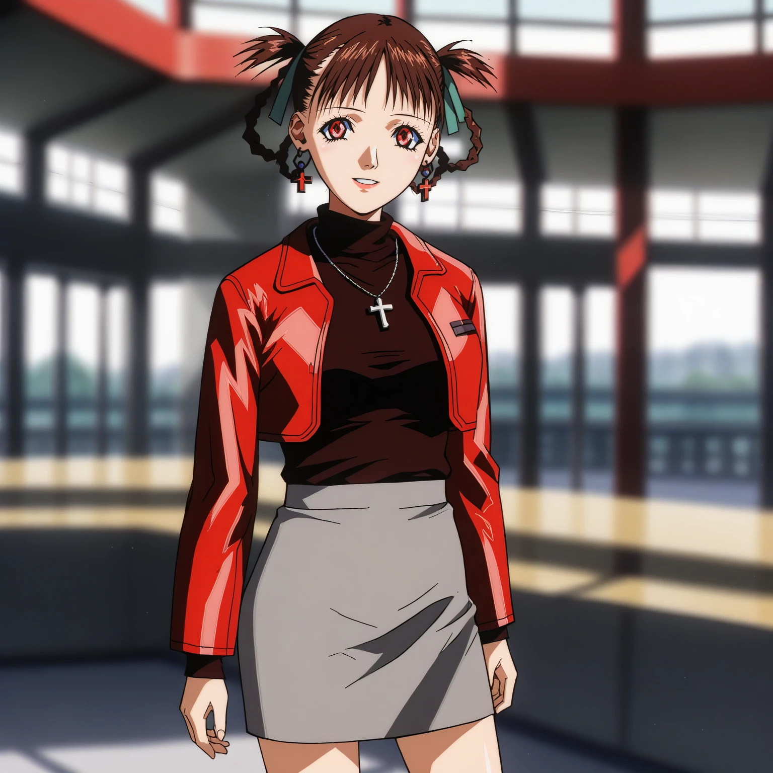 AKITESawa,1girl,brown hair,hair ribbon,hair rings,red eyes,earrings, breasts,