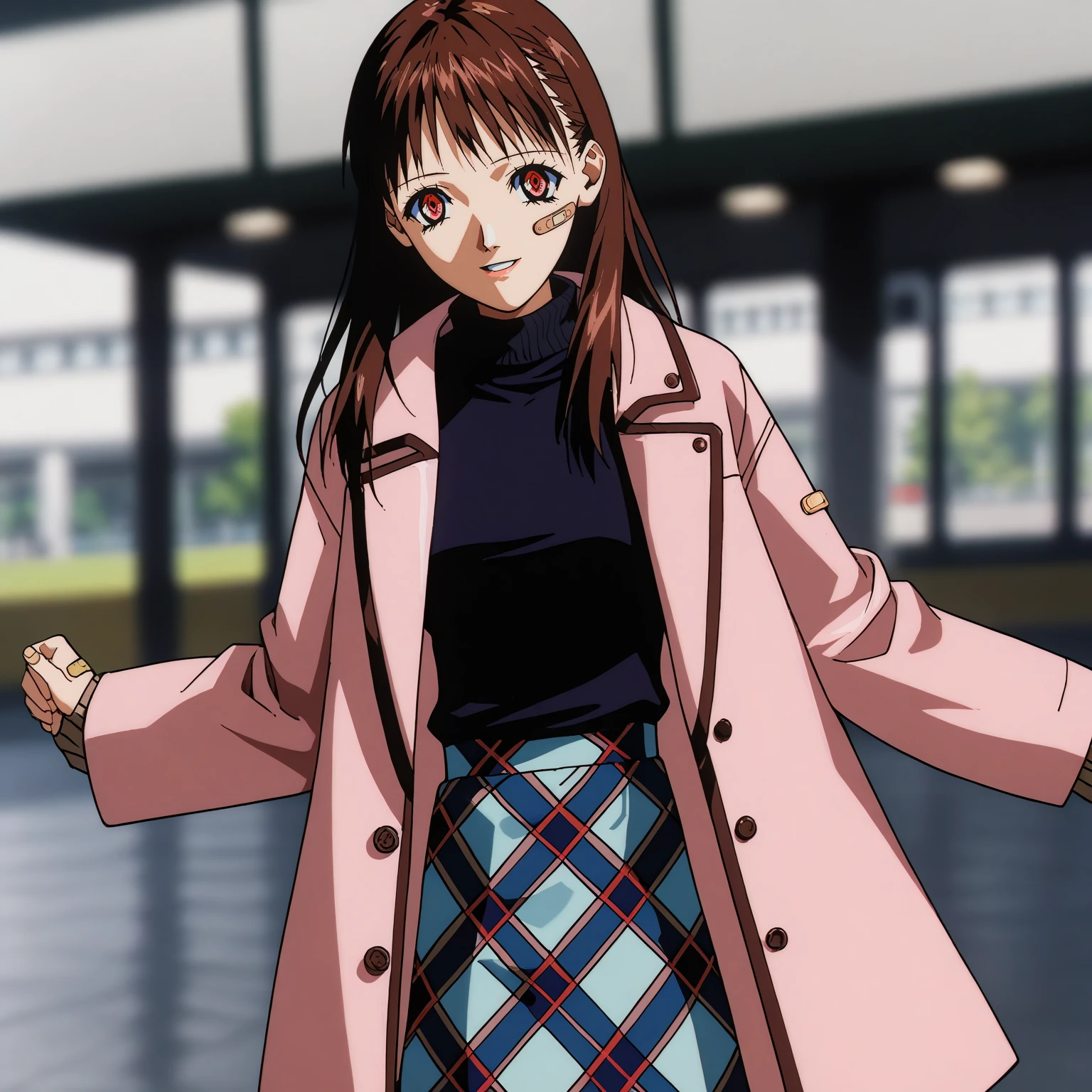duffel_coat,pink coat,turtleneck,black sweater, plaid_skirt,blue skirt,