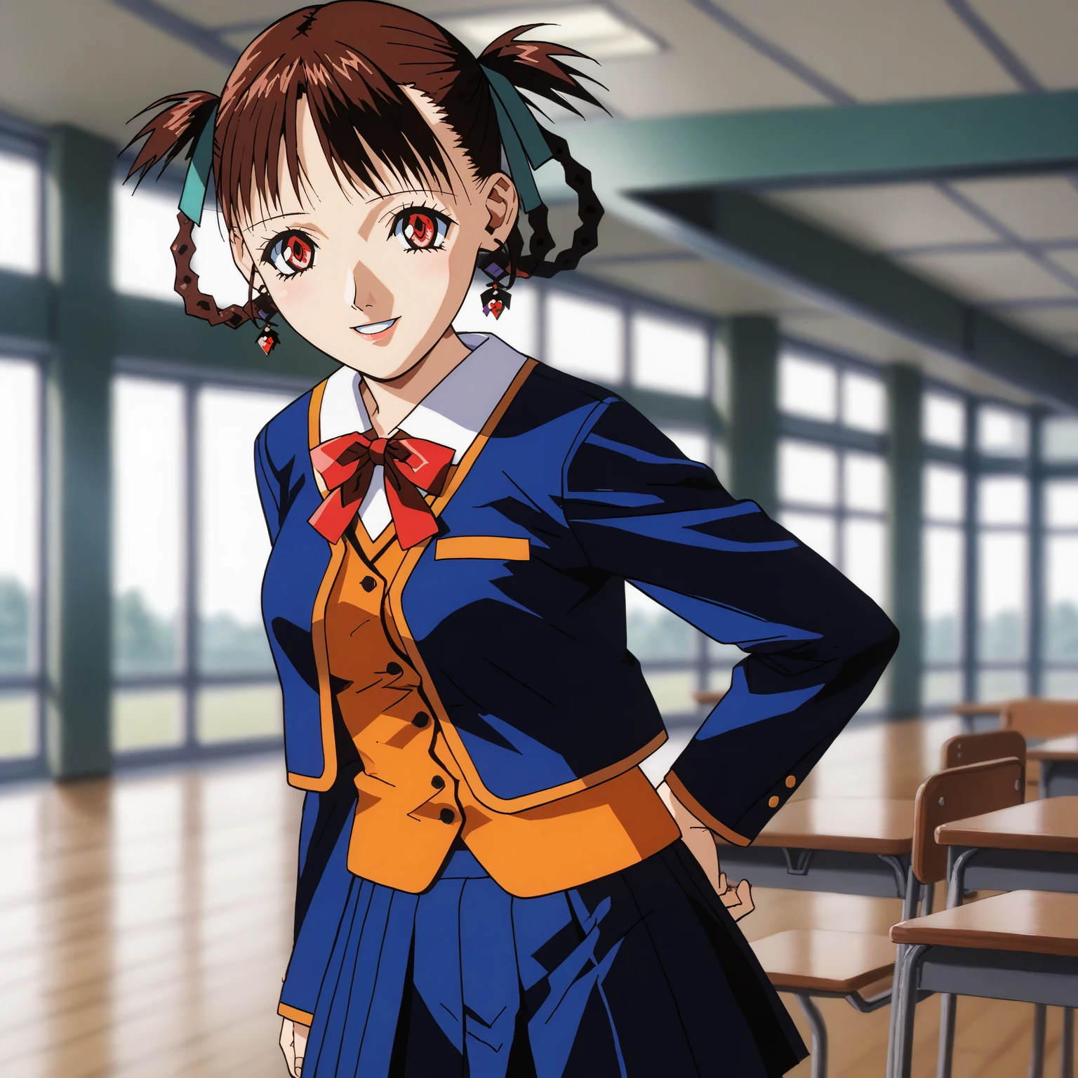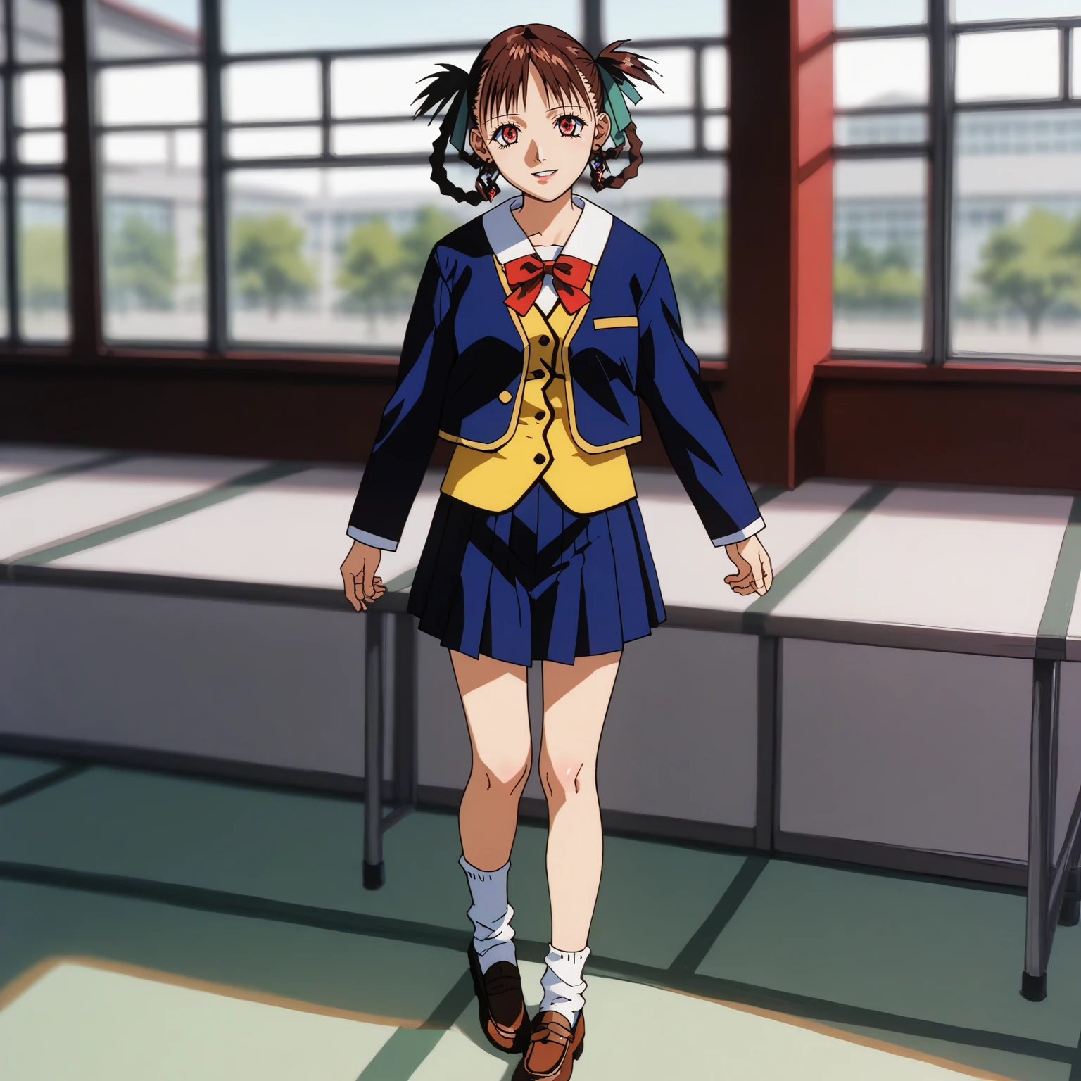 school_uniform,blue jacket,red bowtie,yellow vest, pleated_skirt,blue skirt,