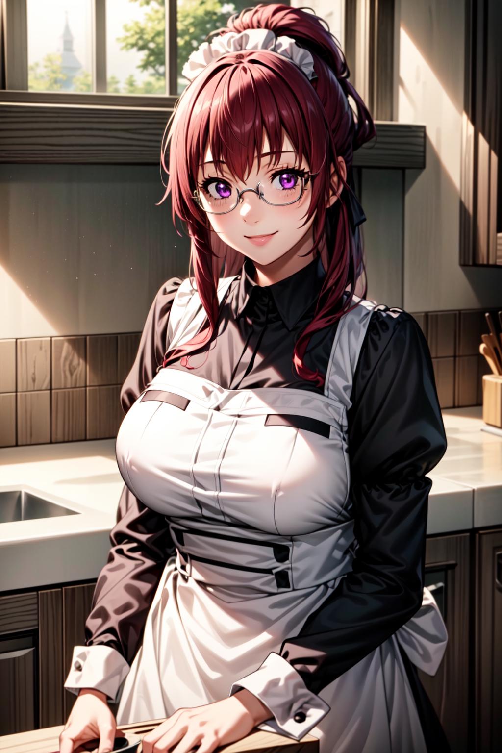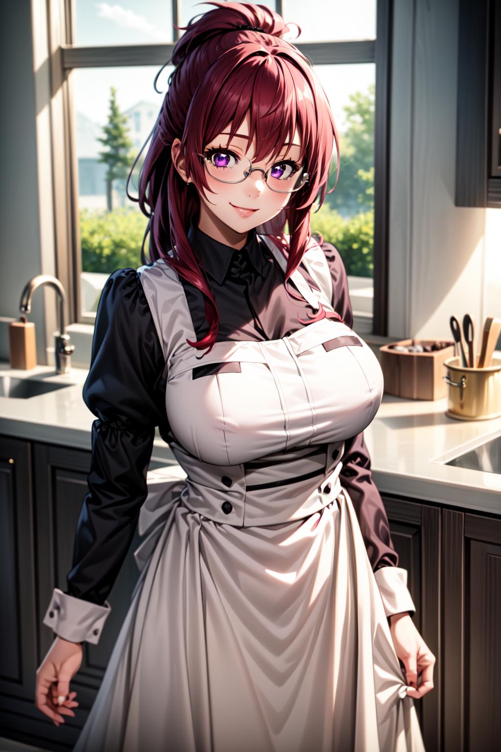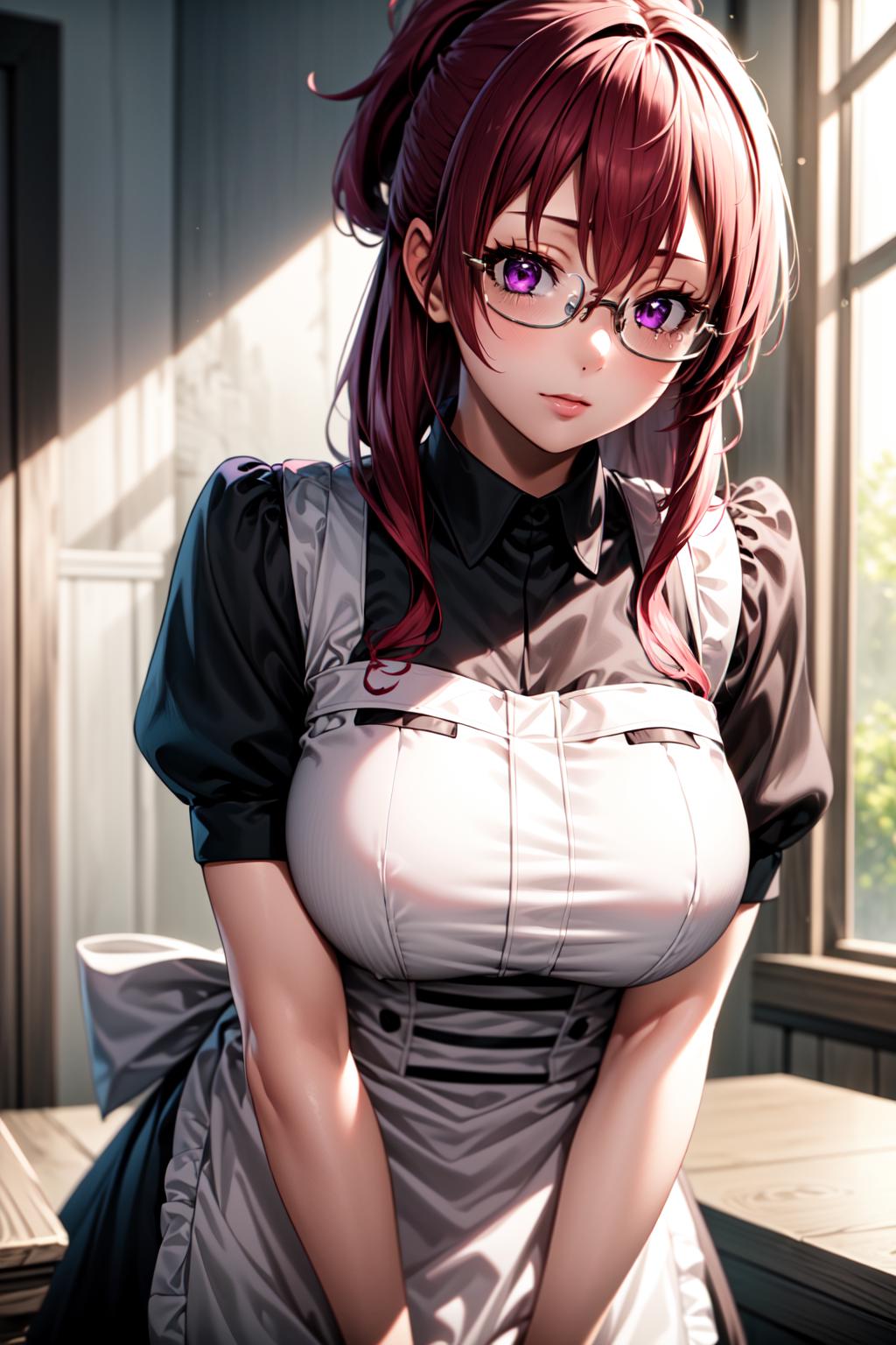 LilyaaGreyratNDV, 1girl, red hair, purple eyes, large breasts, long hair, maid hat, maid suit, glasses, apronBest weight: 0.6-0.8