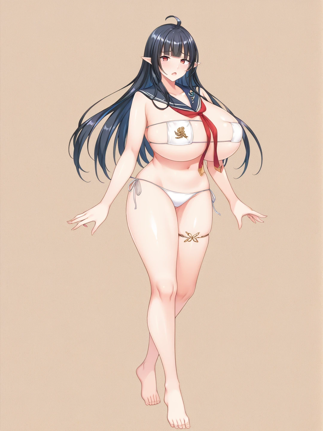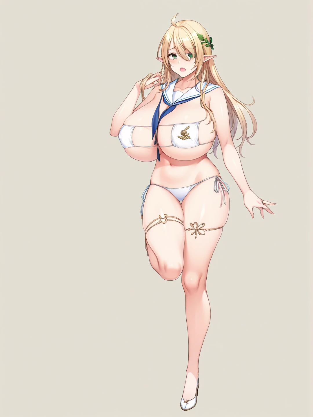 miyu,bikini,white bikini, side-tie bikini bottom, swimsuit, sailor collar, micro bikini, thigh strap,eyepatch_bikini,HDA_MasterpieceXL_v.1, short hair,purple eyes, silky hair,flower,hair ormonent