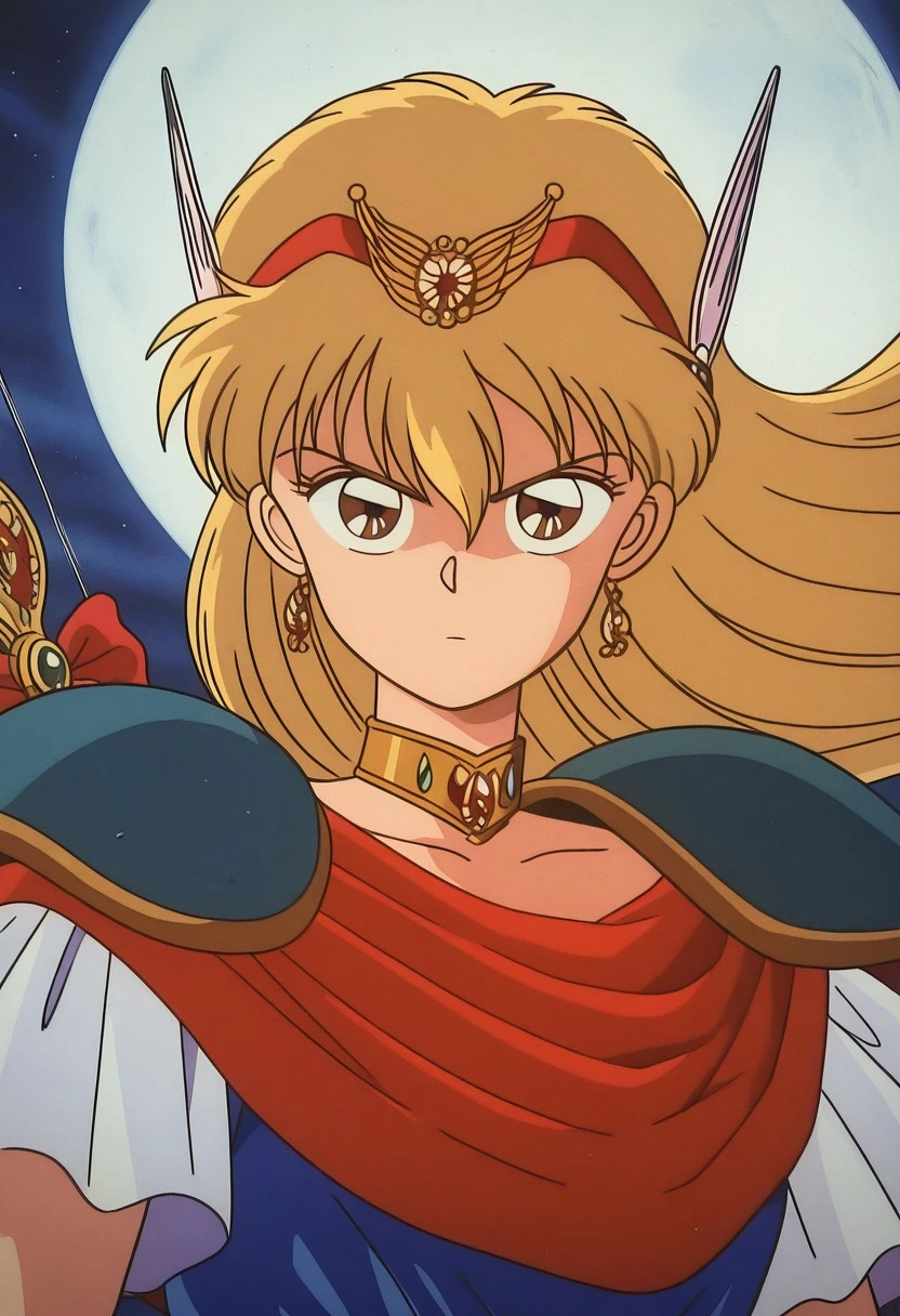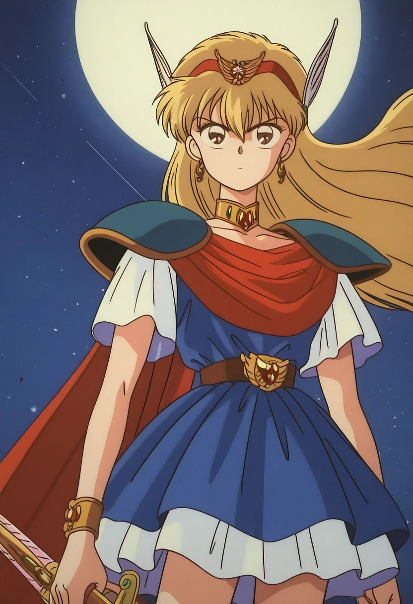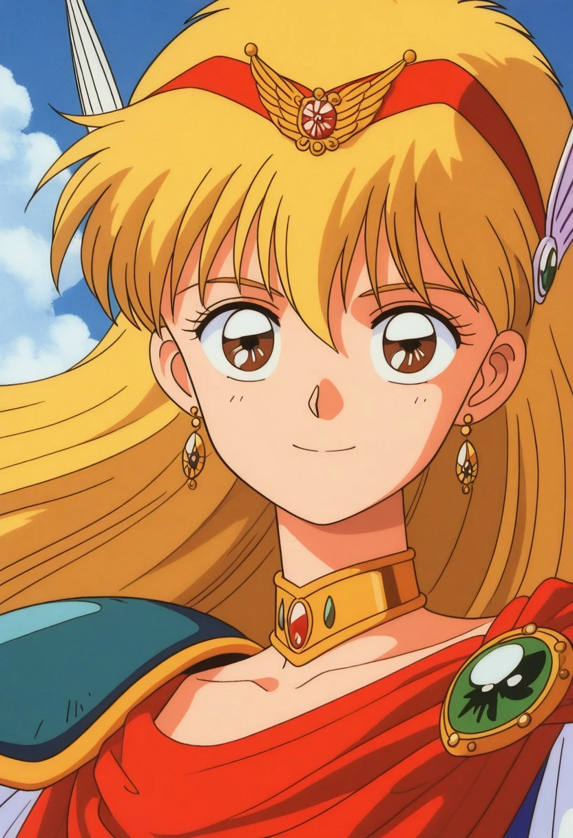 ② magical princess,1girl,brown eyes,blonde hair,long hair,jewelry,earrings,hairband,hair ornament,choker,armor,shoulder armor,cape,skirt