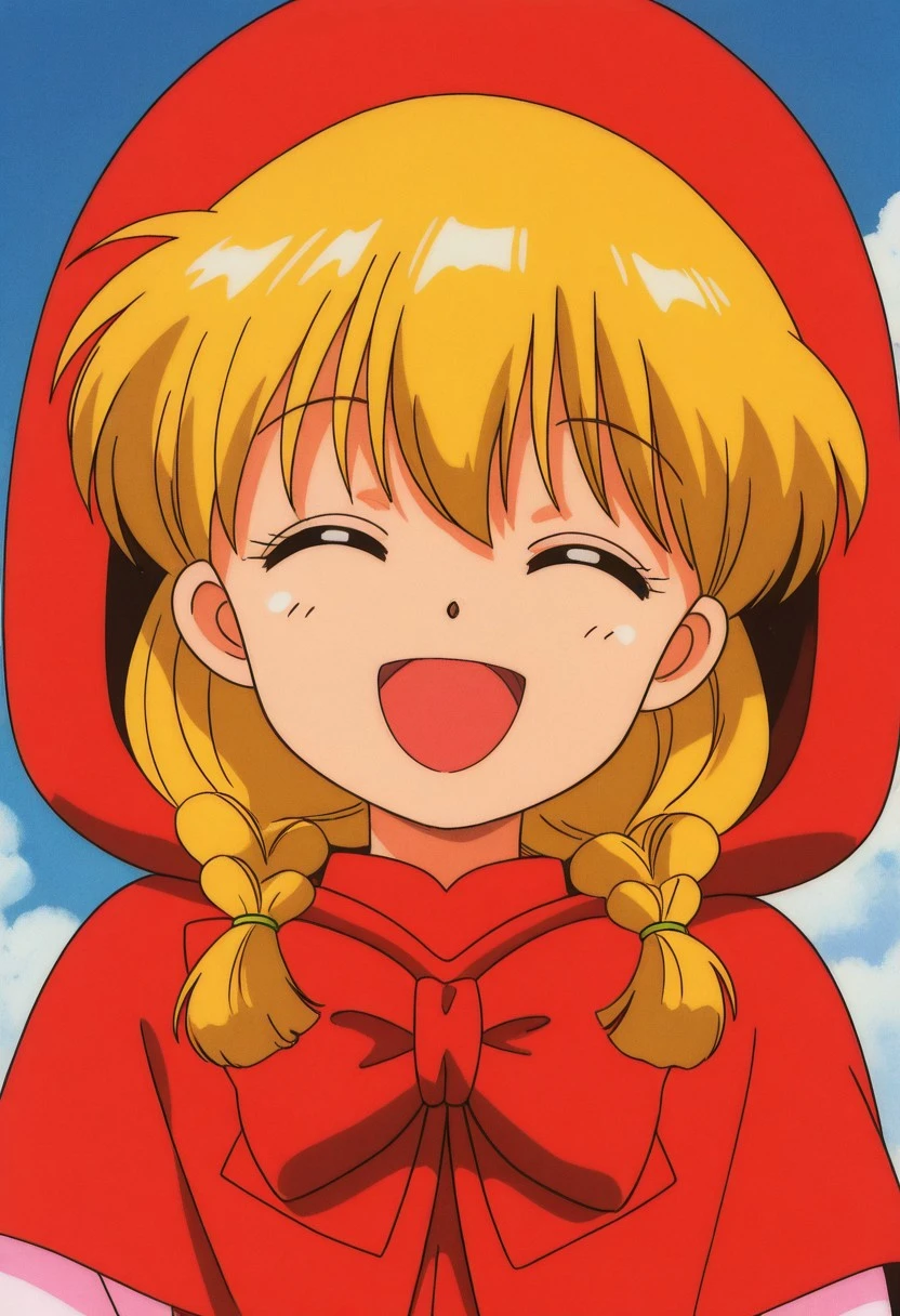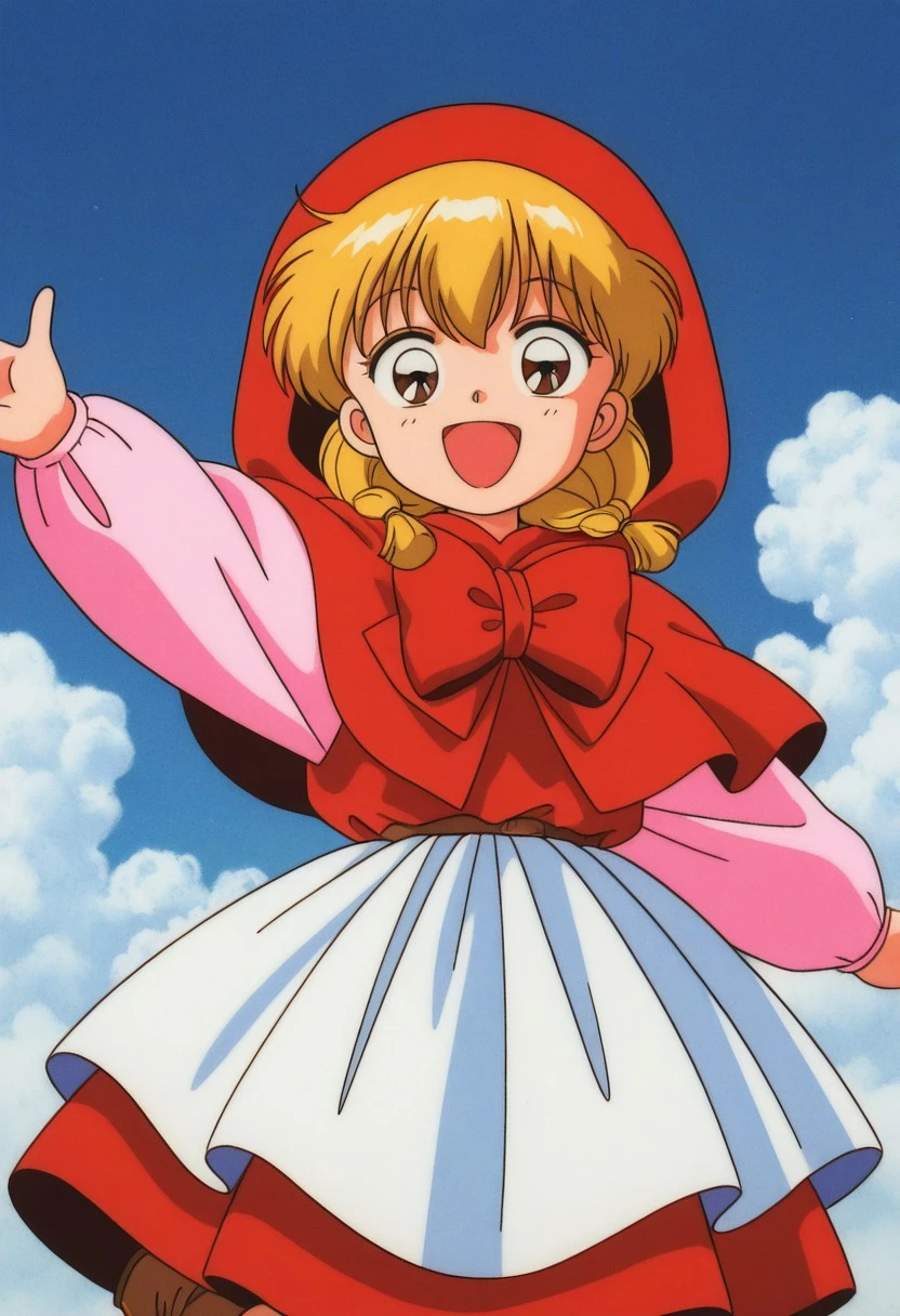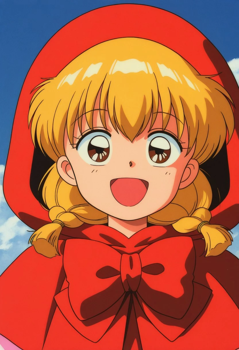 ① chacha,1girl,brown eyes,blonde hair,twintails,twin braids,red dress,red capelet,hood,apron,long sleeves,boots