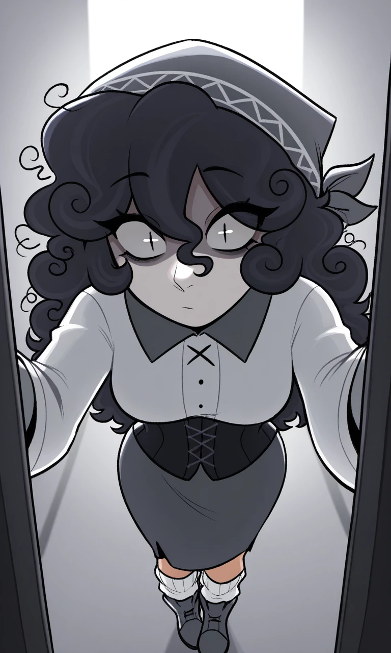 white_long-sleeved_blouse, dark_gray_corset, long_gray_skirt, white_socks, dark_gray_boots