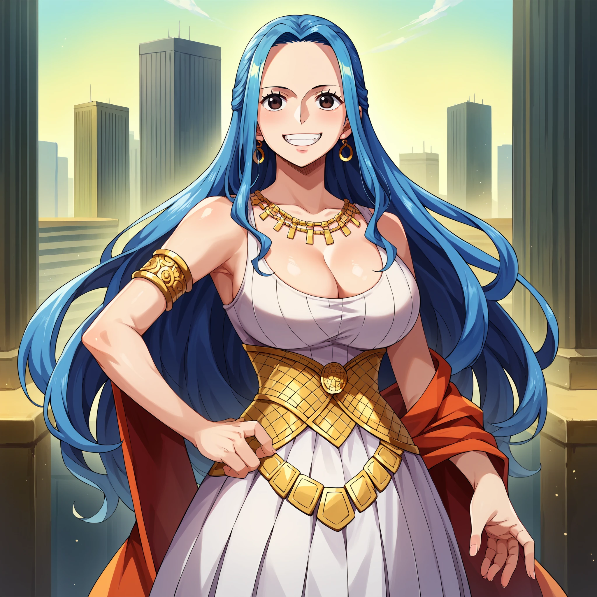 white dress, sleeveless, cleavage, pleated dress, robe decollete, gold jewelry