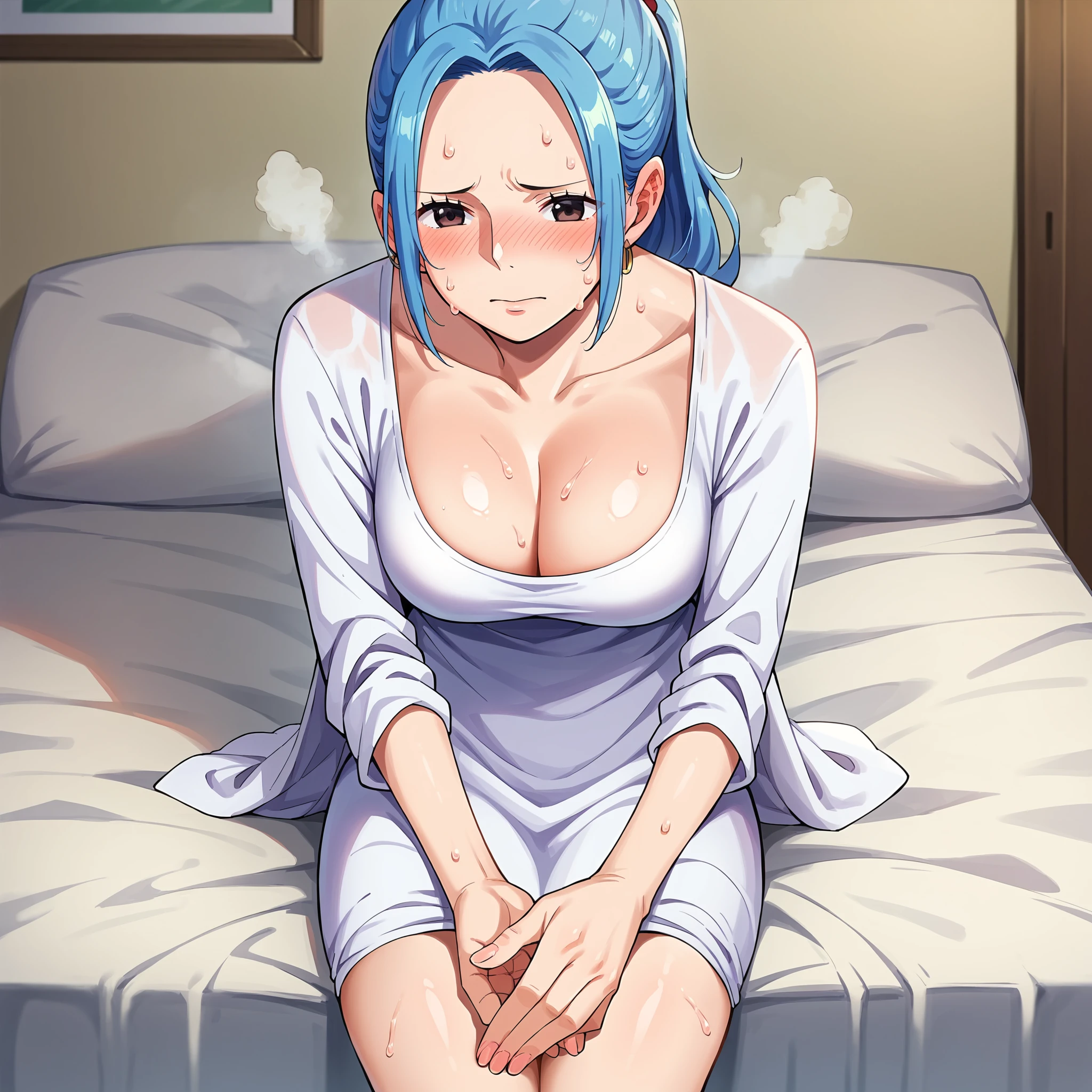 vivi, blue hair, long hair, side locks, ponytail, wavy hair, forehead, black eyes