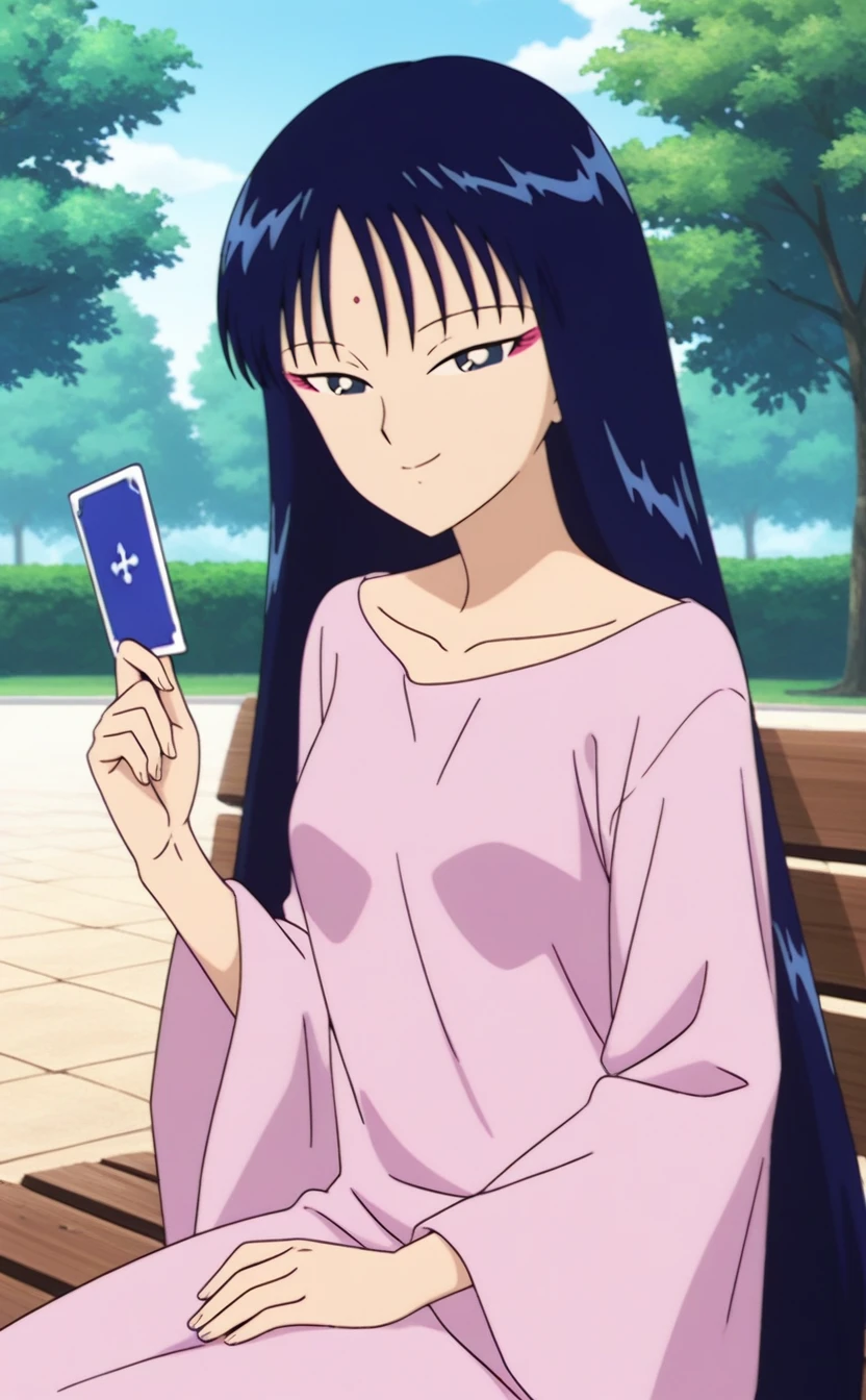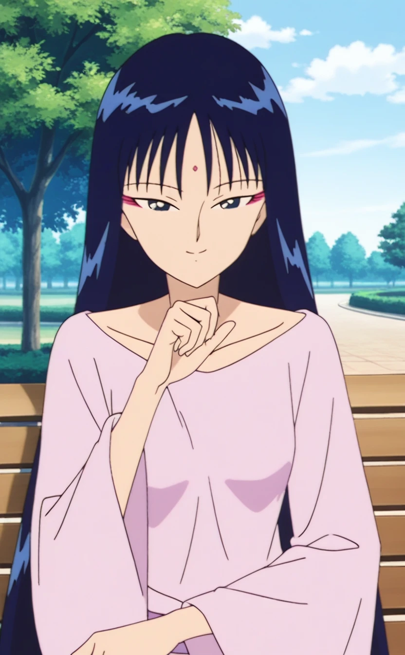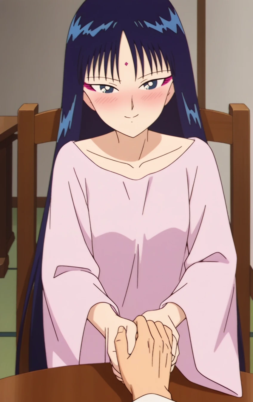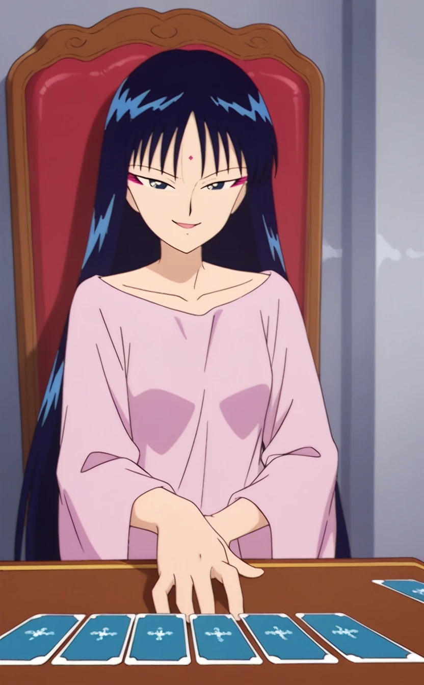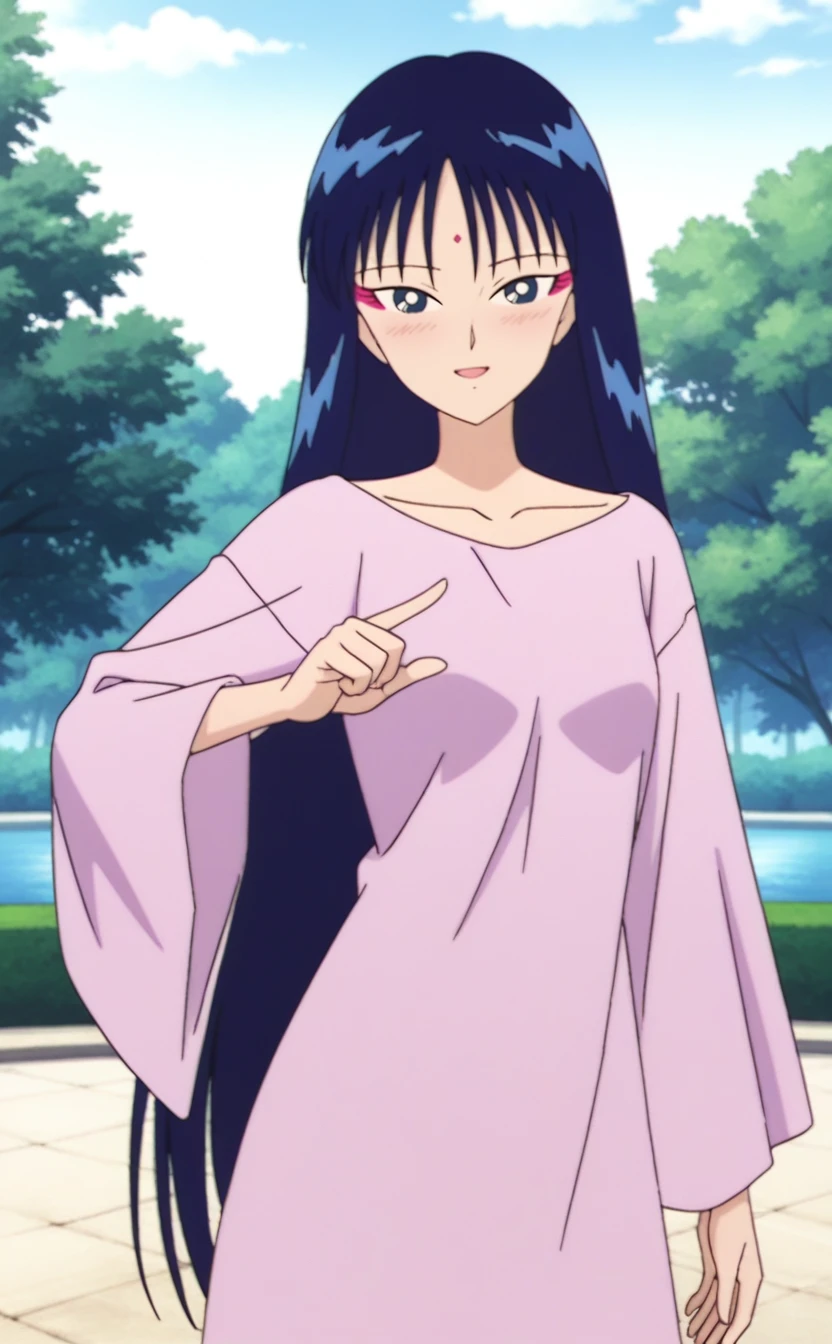 1girl,sa1lorm00n02barmu,anime coloring,solo,small breasts,very long hair,blue hair,black hair, blue eyes,black eyes, eyeshadow, makeup, forehead mark,pink shirt,collarbone, long sleeves,wide sleeves,looking at viewer, best quality,masterpiece,sensitive,<lora:Sa1lorM00nBarmuNoobai_2:1>
