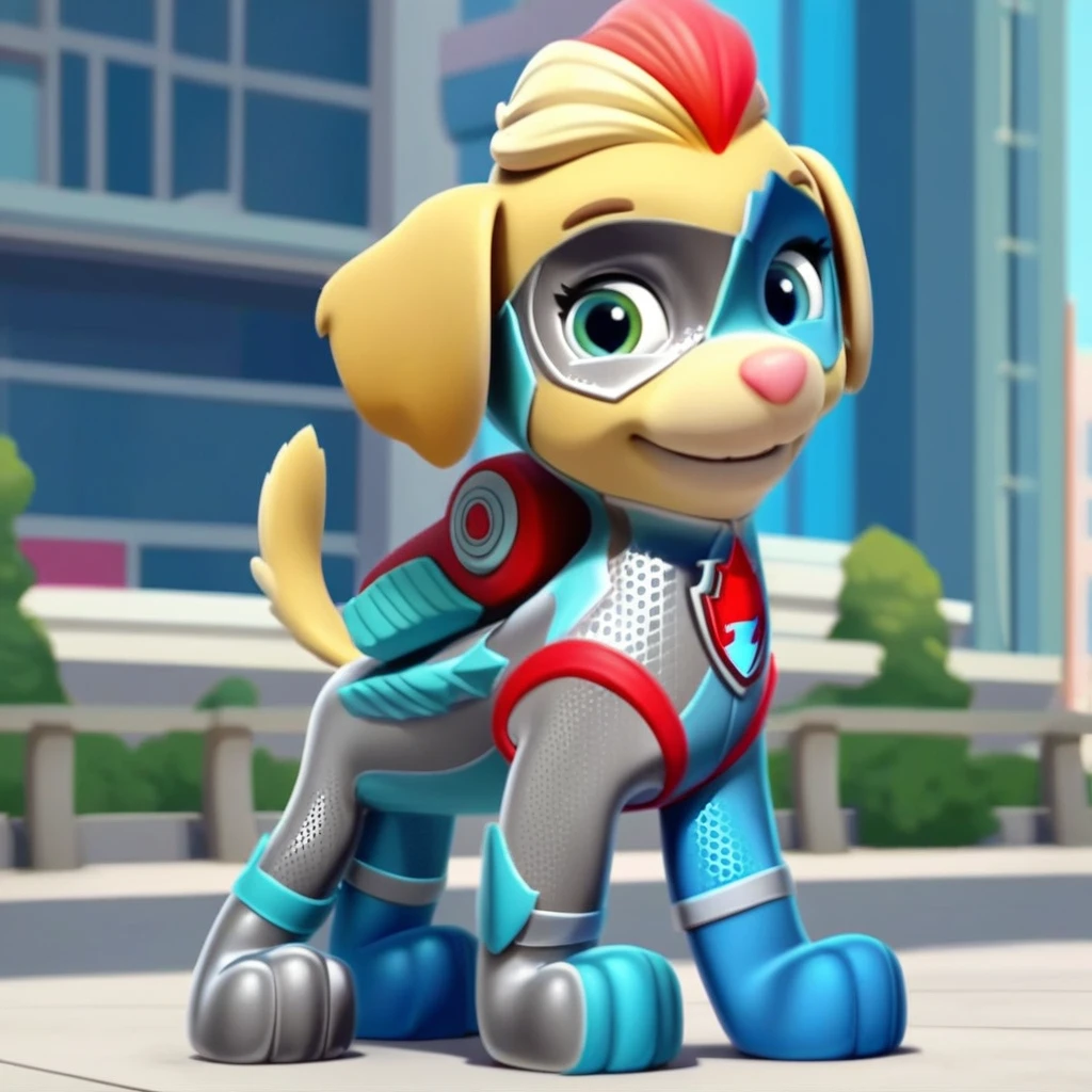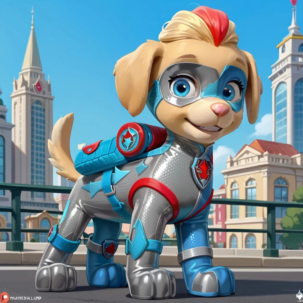 Red highlights, blue and silver bodysuit, blue and silver mask, red and blue backpack, red and blue logo