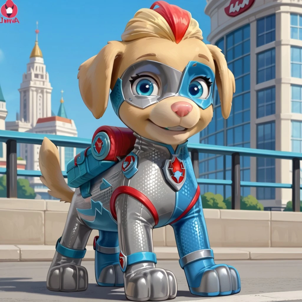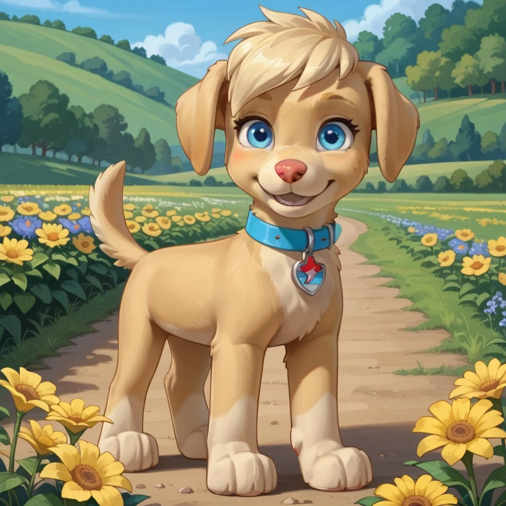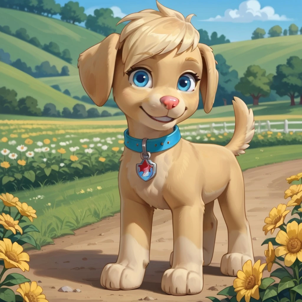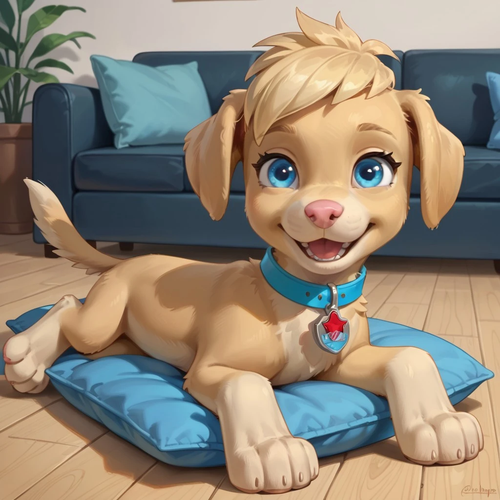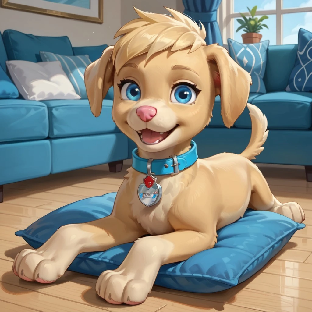 Dog, golden retriever, Yellow fur, blonde hair, blue eyes, blue collar, red and blue tag,