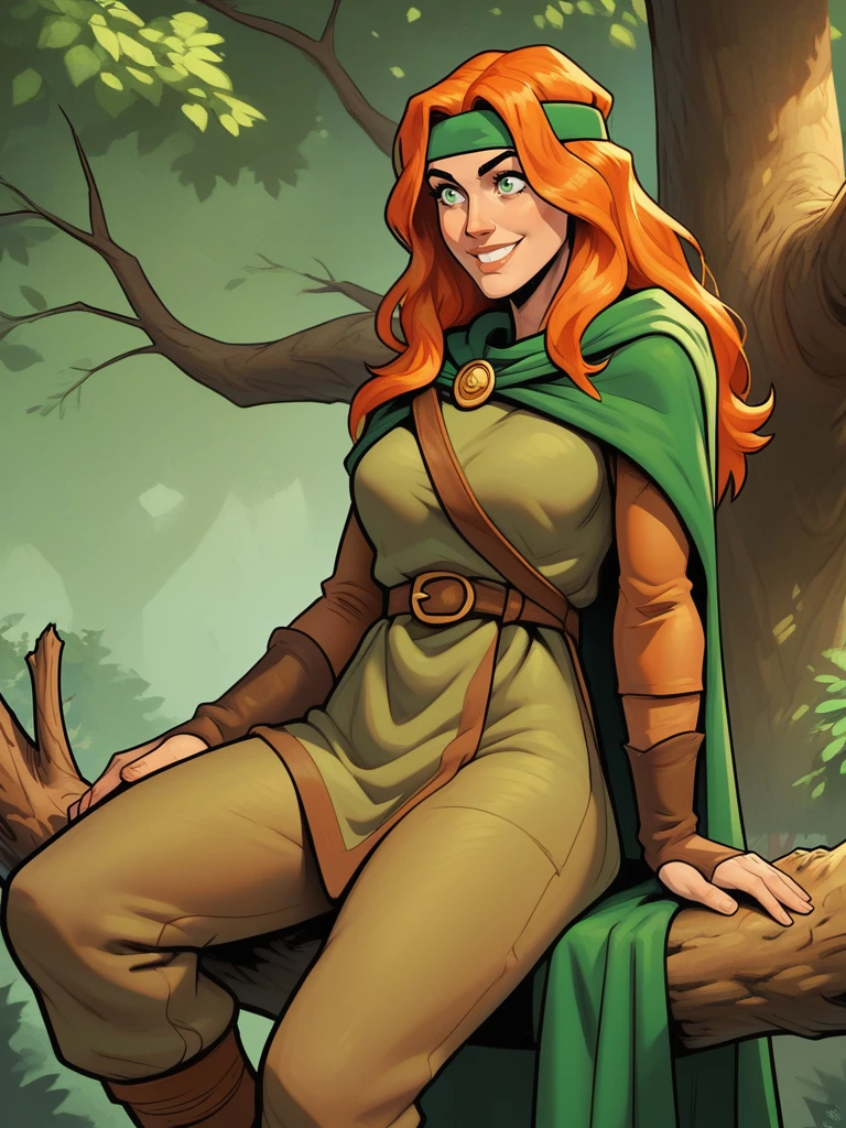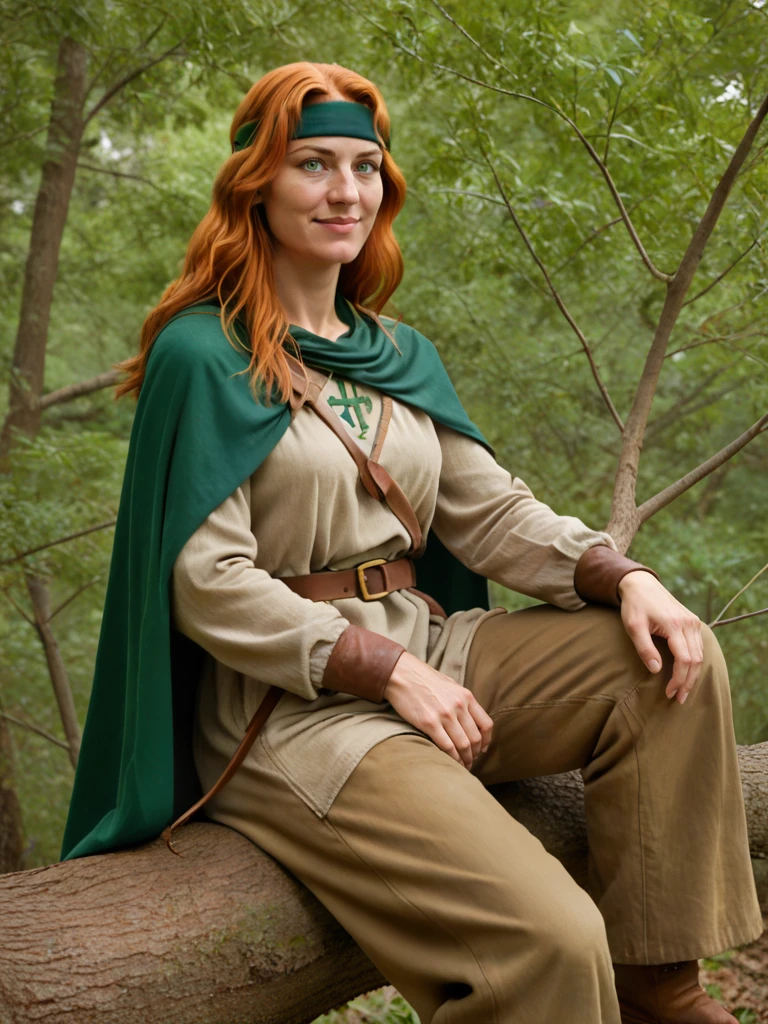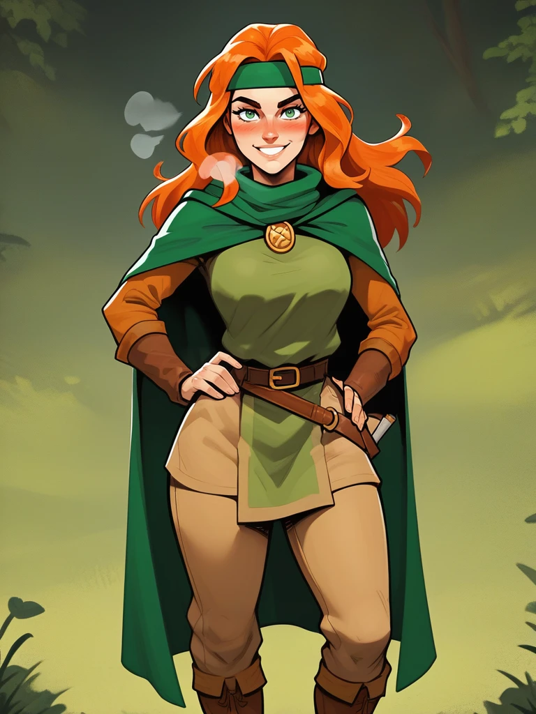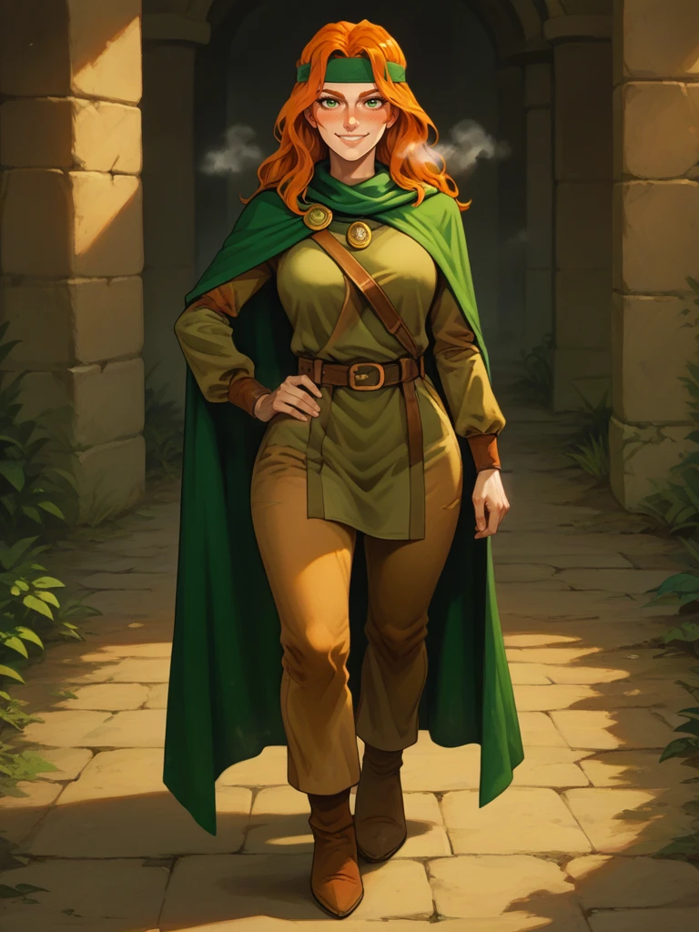 tanis, 1girl, female focus, long hair, orange hair, green eyes, headband, cape, tunic, pants