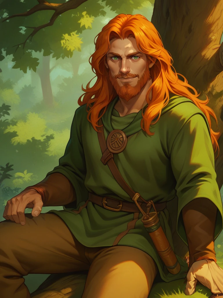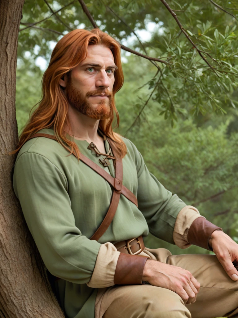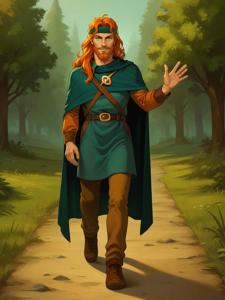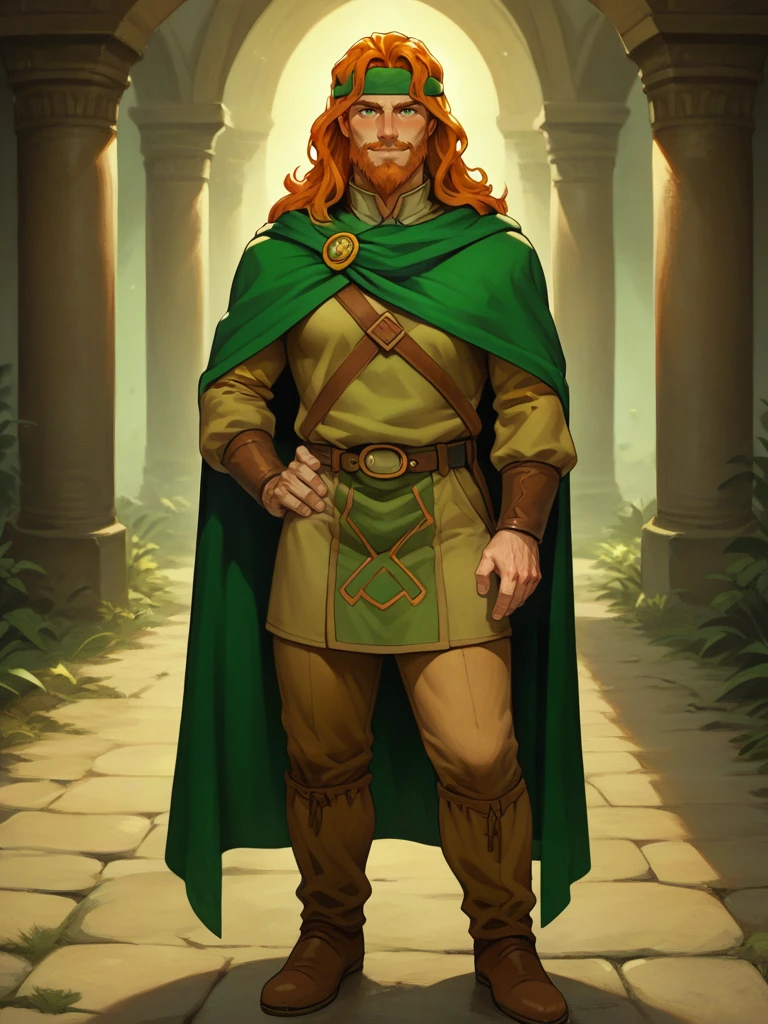 tanis, 1boy, male focus, long hair, orange hair, green eyes, facial hair, beard, headband, cape, tunic, pants