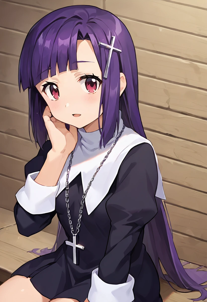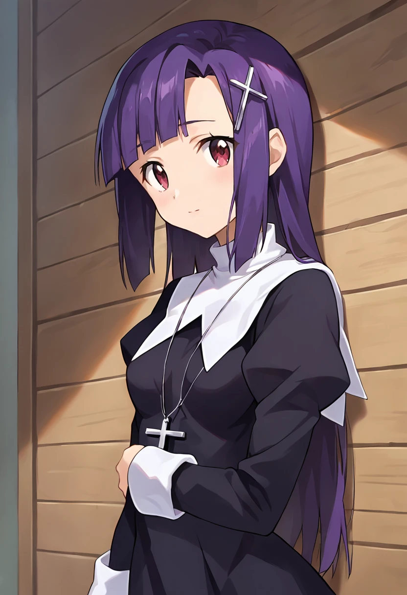 score_9, score_8_up, score_7_up, masterpiece, source_anime 1girl, ct_zange, purple hair, long hair, cross hair ornament, black dress, white turtleneck, long sleeves, cross necklace, looking at viewer, indoors, wooden wall, cowboy shot, shiny skin,Negative prompt ❌: