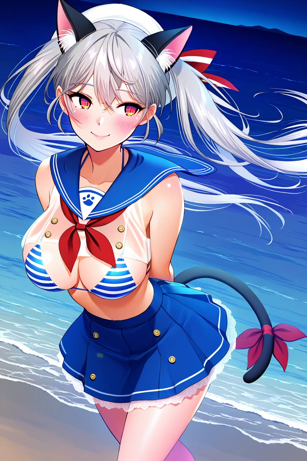mi_mrn, teg_mi, 1girl, solo, red eyes, grey hair, long hair, large breasts, lips, twintails, hat, cat ears, blue sailor collar, red neckerchief, see-through crop top, sleeveless, bare shoulders, striped bikini, string bikini, pleated skirt, cat tail, tail ribbon, white footwear,