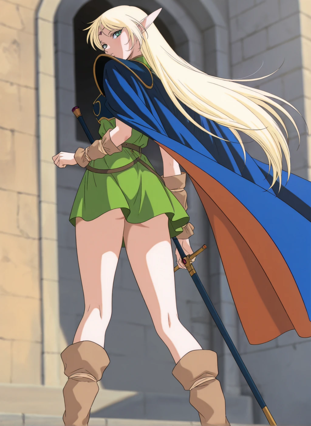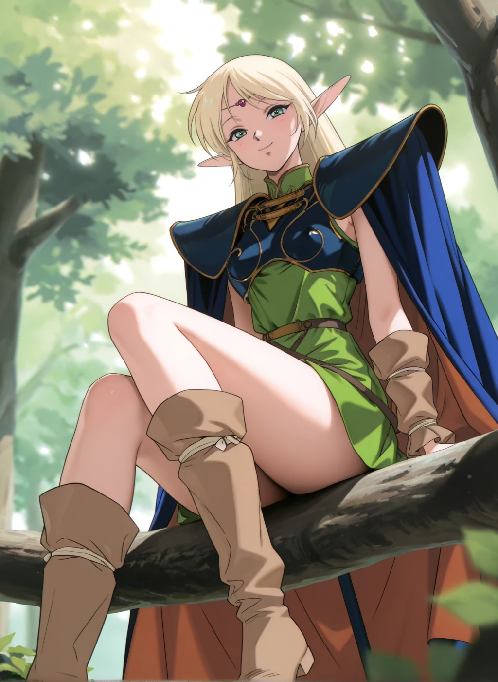 deedlit, blonde hair, pointy ears, long pointy ears, long hair, elf, green eyes,medium breastsOutfit1: