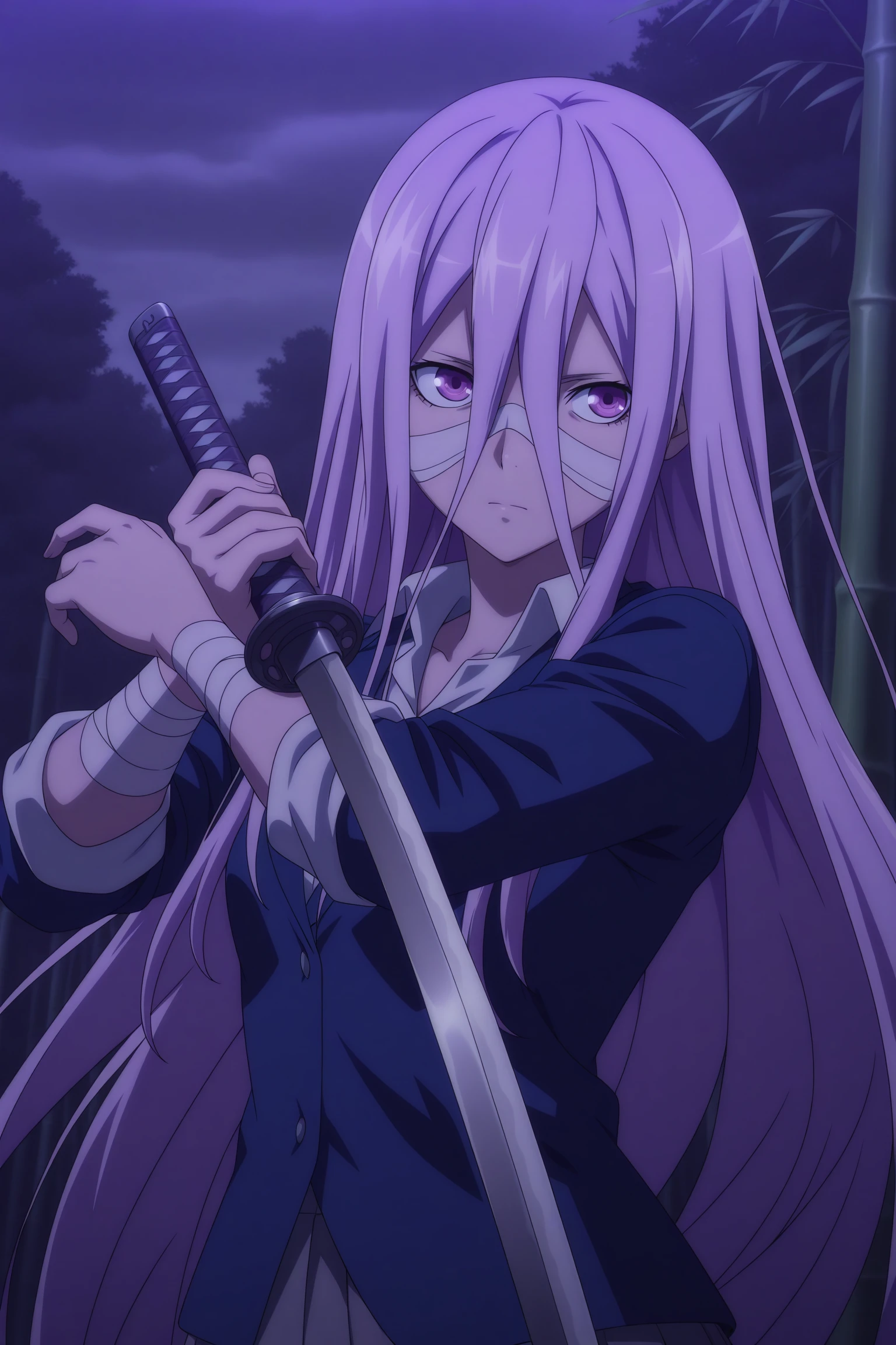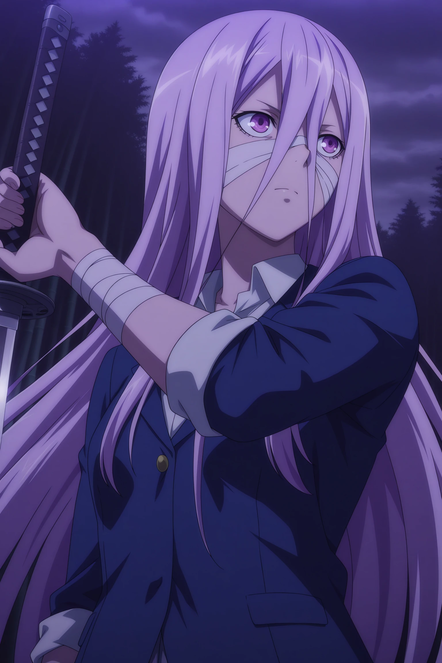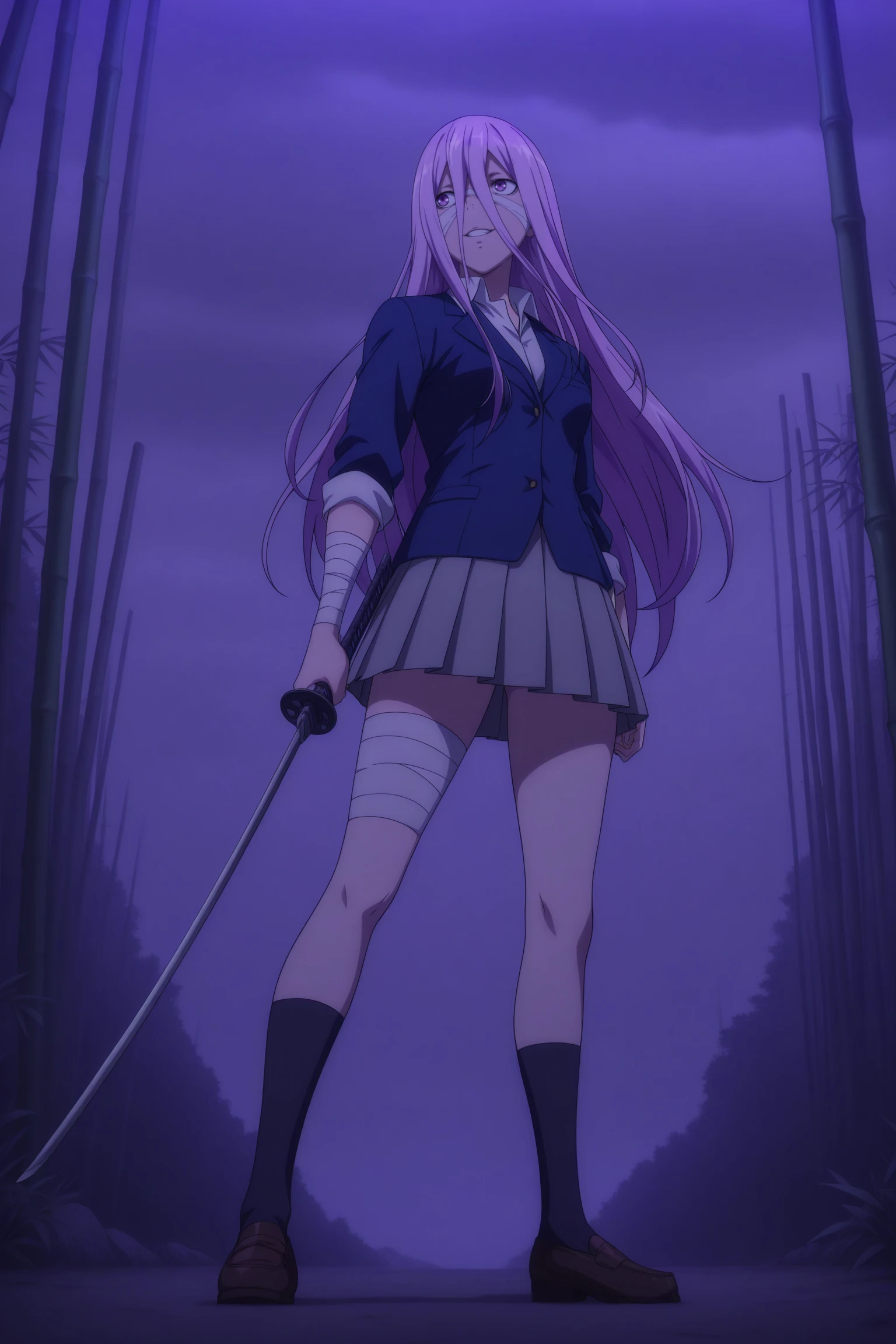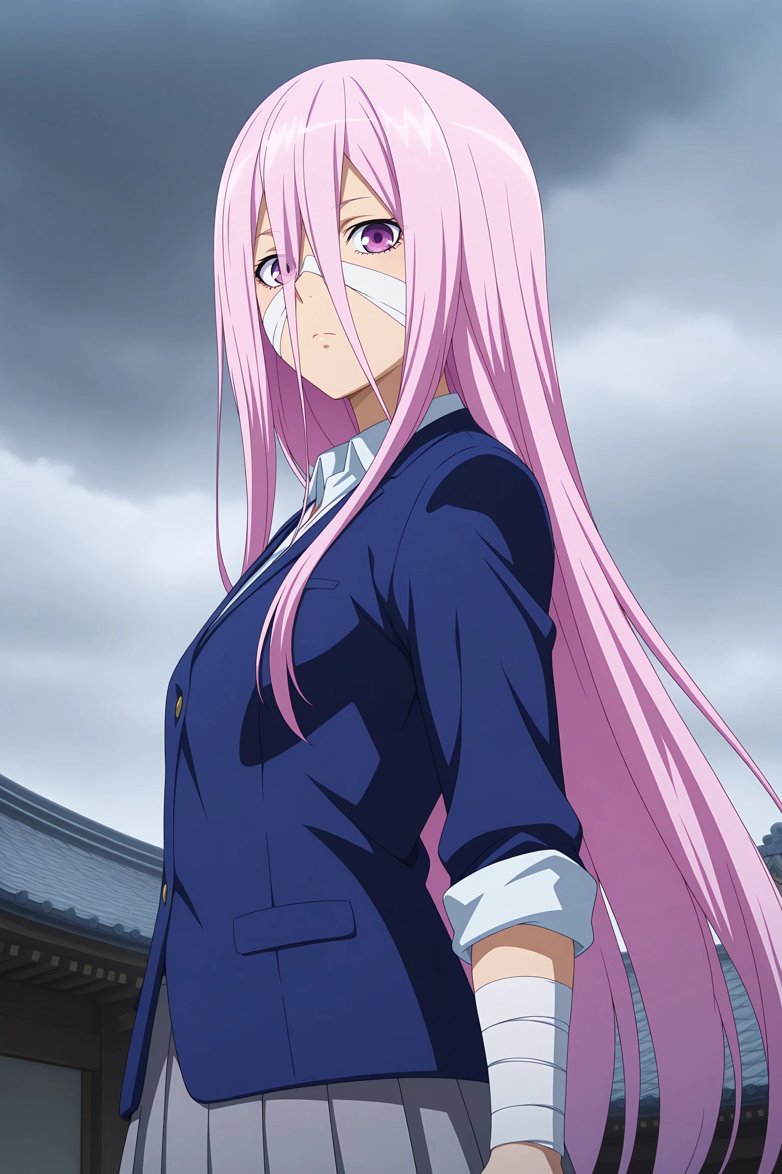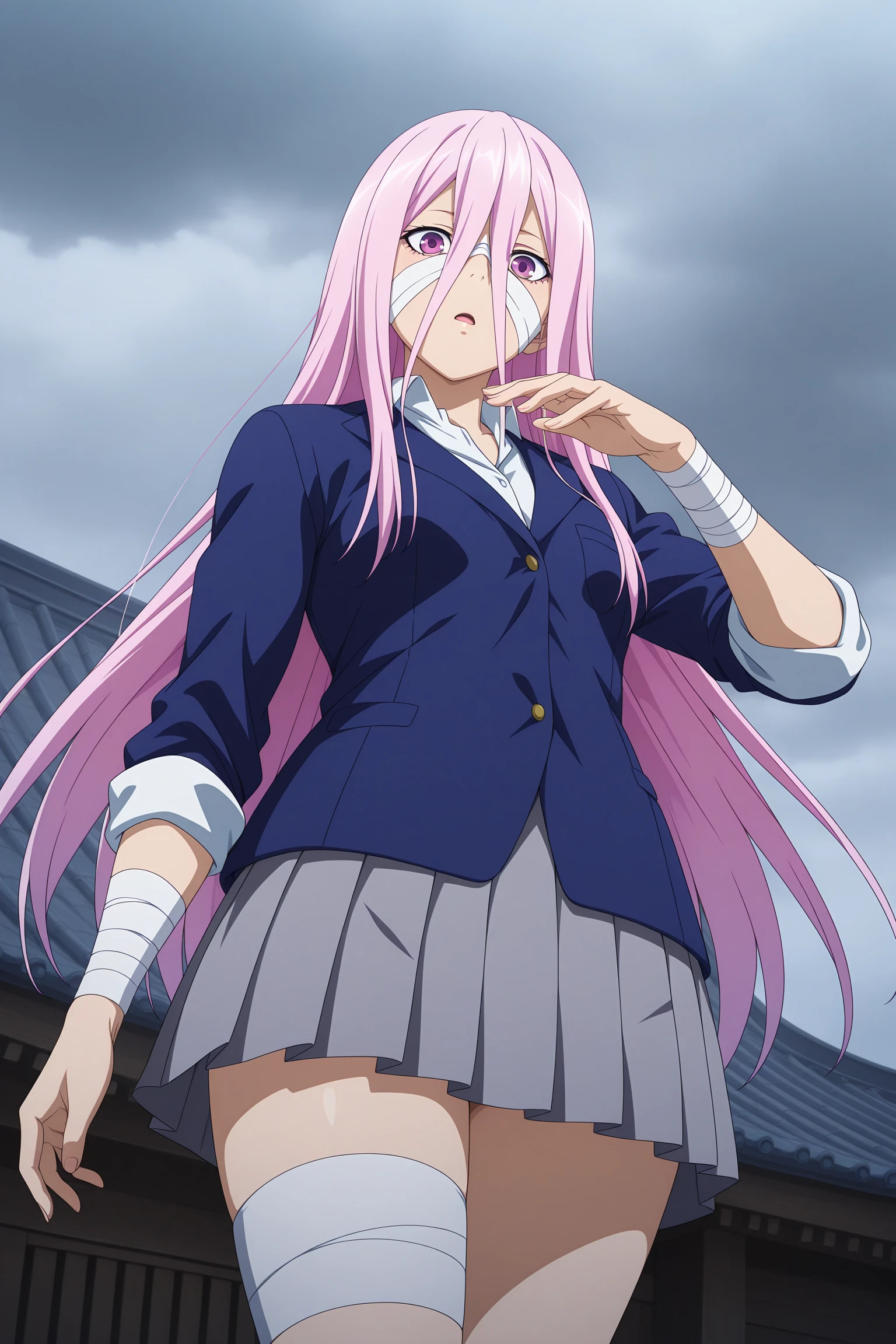 shinmen takezou, long hair, pink hair, long bangs, hair between eyes, purple eyes, bandage on face, three-quarter sleeves, blue jacket, white shirt, collared shirt, grey skirt, pleated skirt, bandaged wrist, bandaged leg, black socks, kneehighs, brown footwear, loafersNOTE