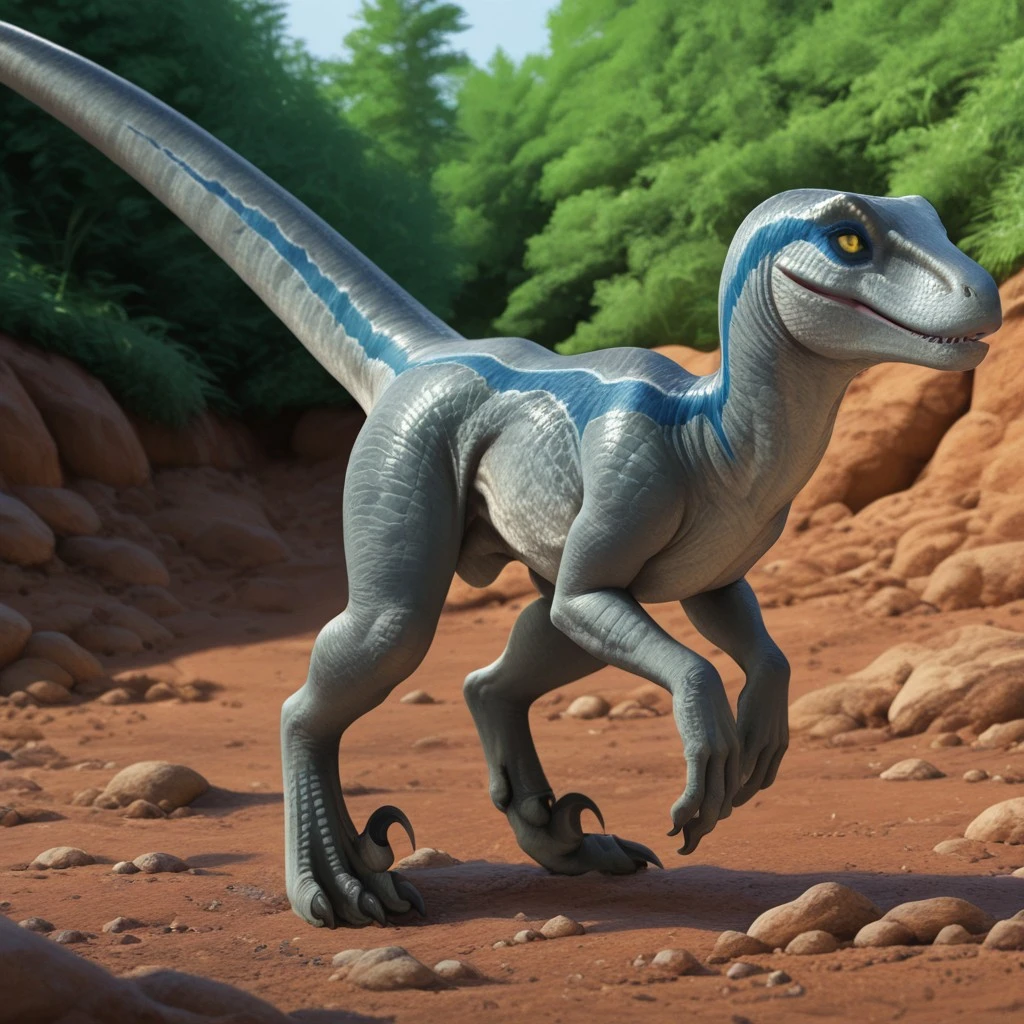feral, vlcraptor, reptilian, scales, grey skin, blue stripe, yellow eyes