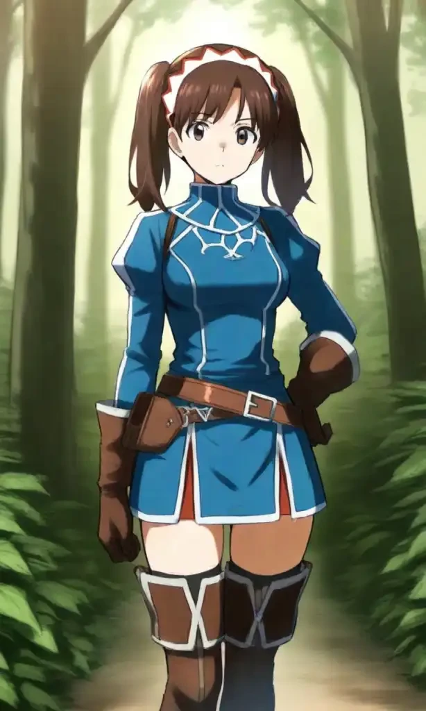 Alicia, anime style, blue uniform, brunette, twintails, brown eyes, thighhighs, leather straps, gloves,