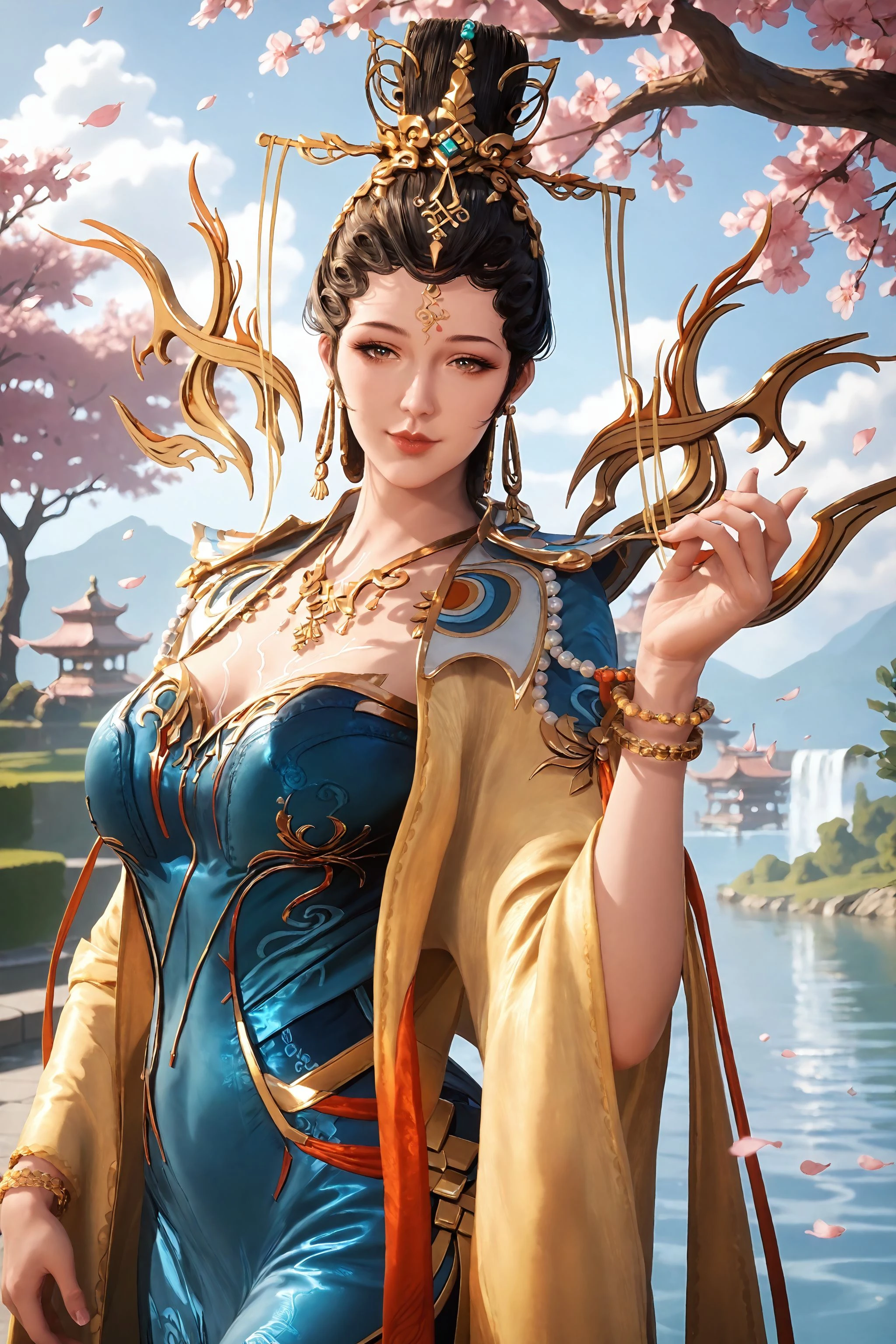 1girl, jewelry, solo, dress, bracelet, earrings, blue dress, chinese clothes, hair bun, hair ornament, black hair