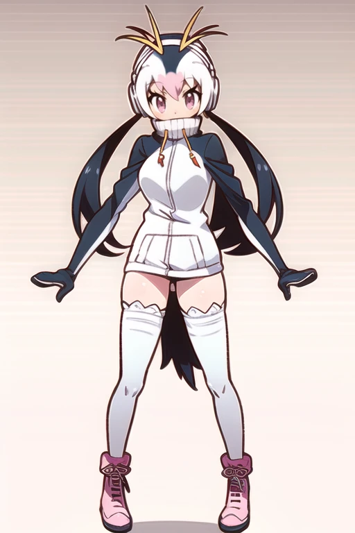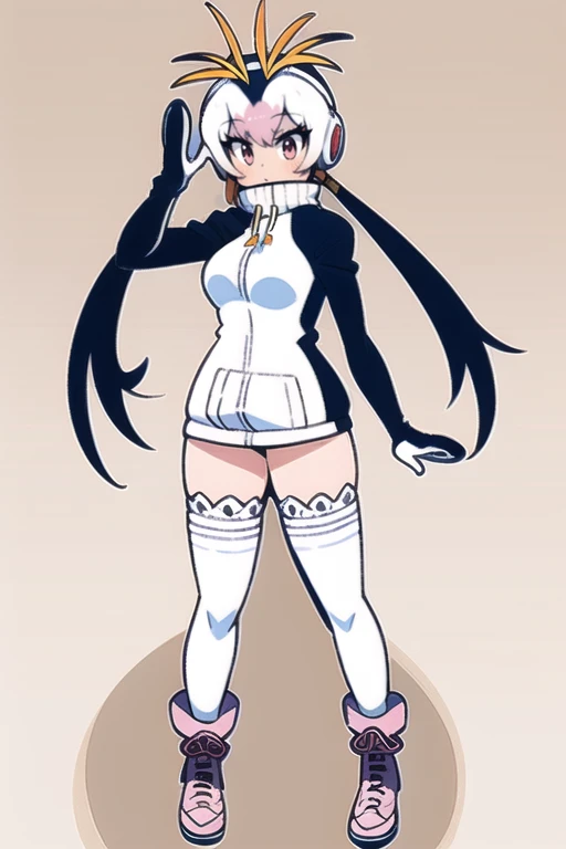royal penguin, royal penguin \\(kemono friends\\), bird tail, black hair, blonde hair, boots, cross-laced footwear, drawstring, eyelashes, gloves, hair between eyes, headphones, jacket, leotard, long hair, long sleeves, mittens, multicolored hair, pink eyes, pink footwear, pink hair, shoelaces, shoes, skirt, sneakers, socks, sweater, thighhighs, turtleneck, twintails, white hair, white thighhighs, zettai ryouiki, zipper,