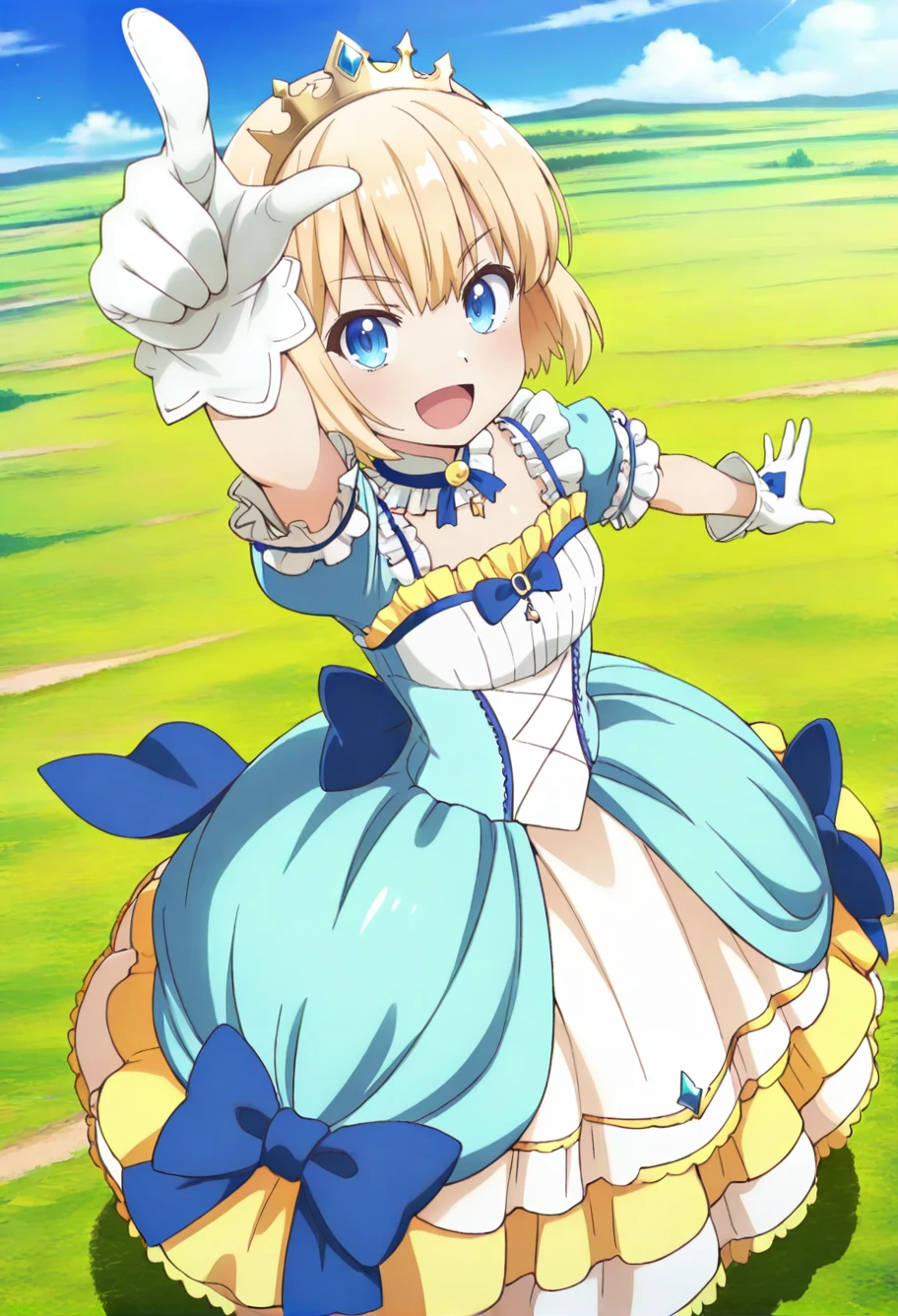 mia-default,blue eyes,blonde hair, princess, frilled dress, blue dress,puffy short sleeves,white gloves,tiara