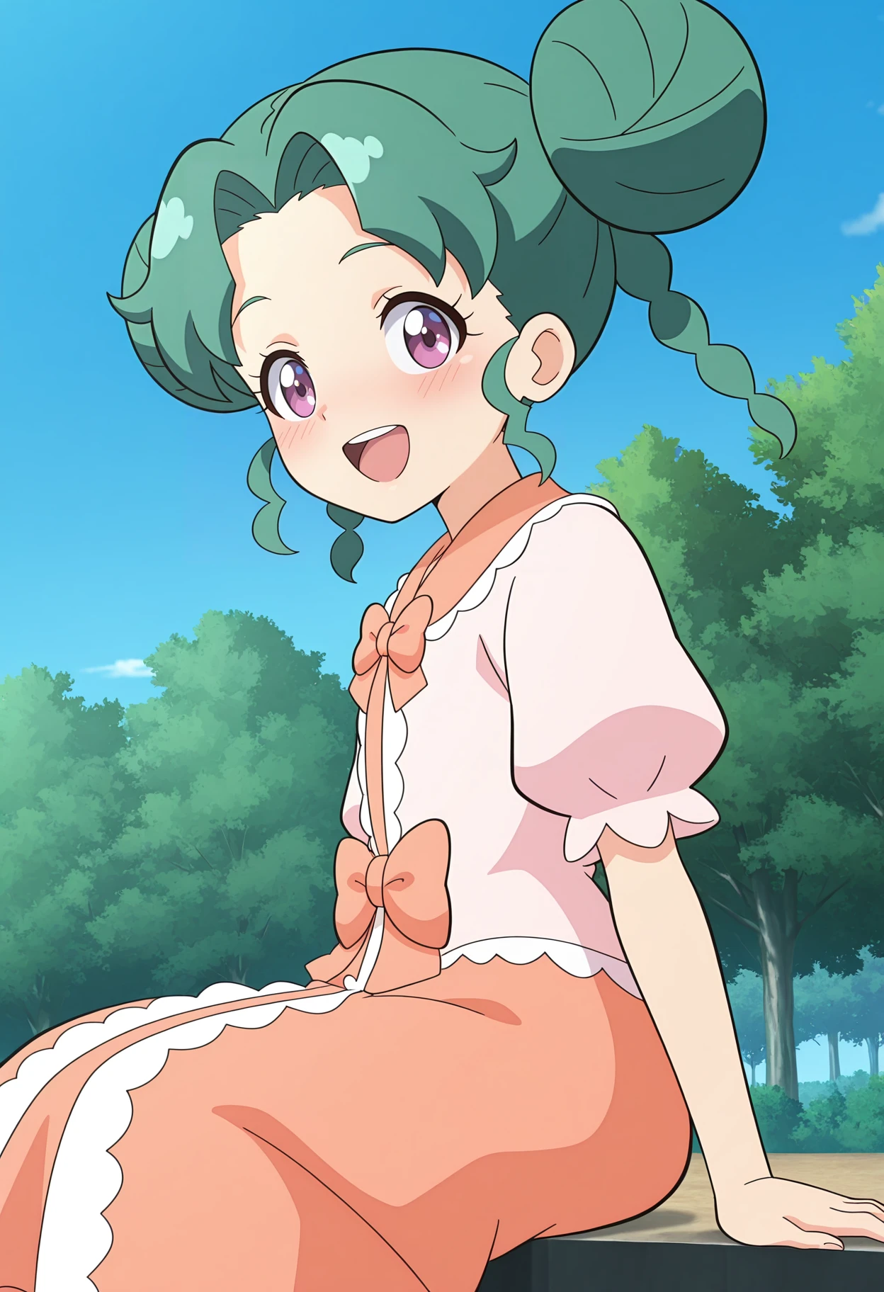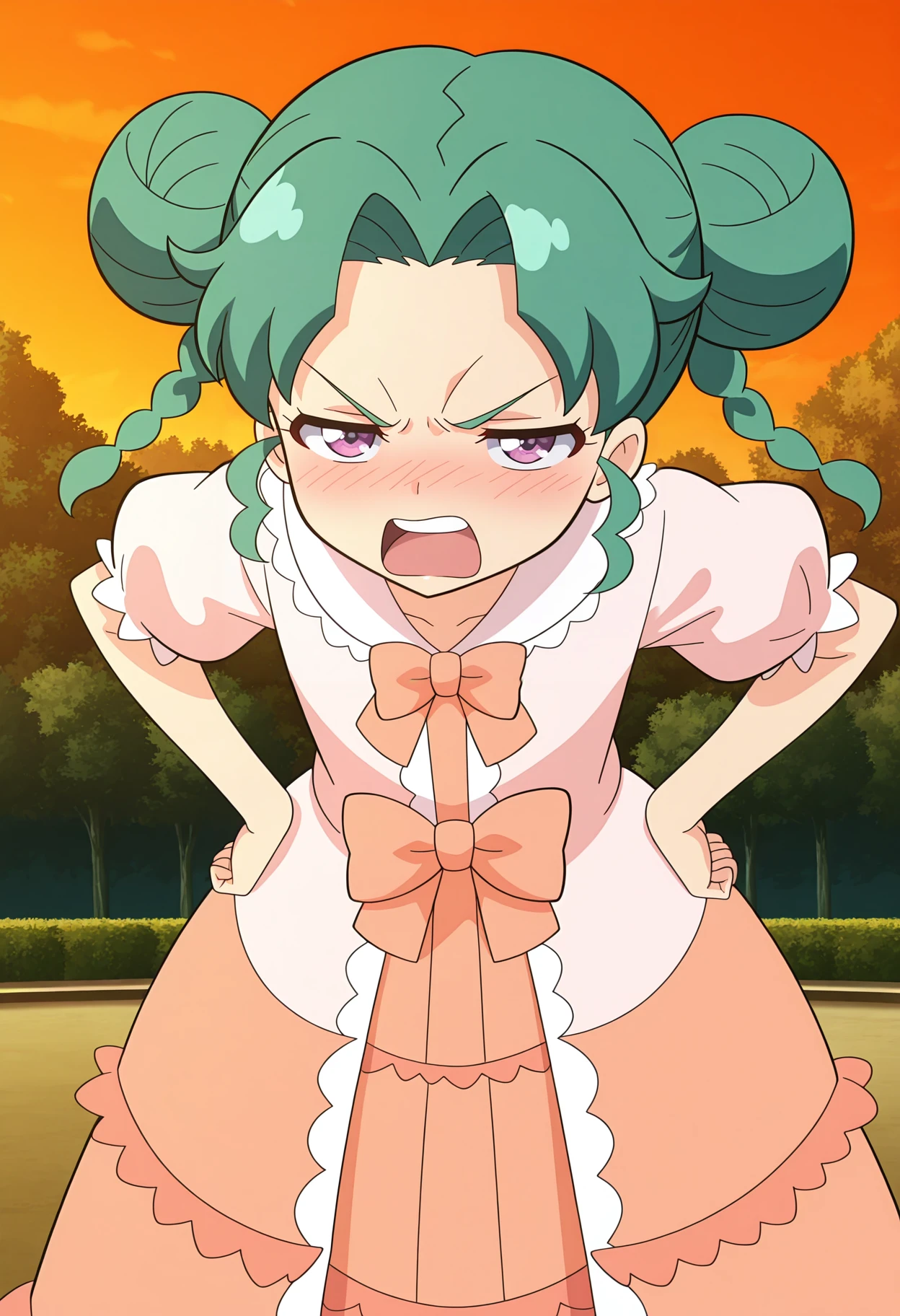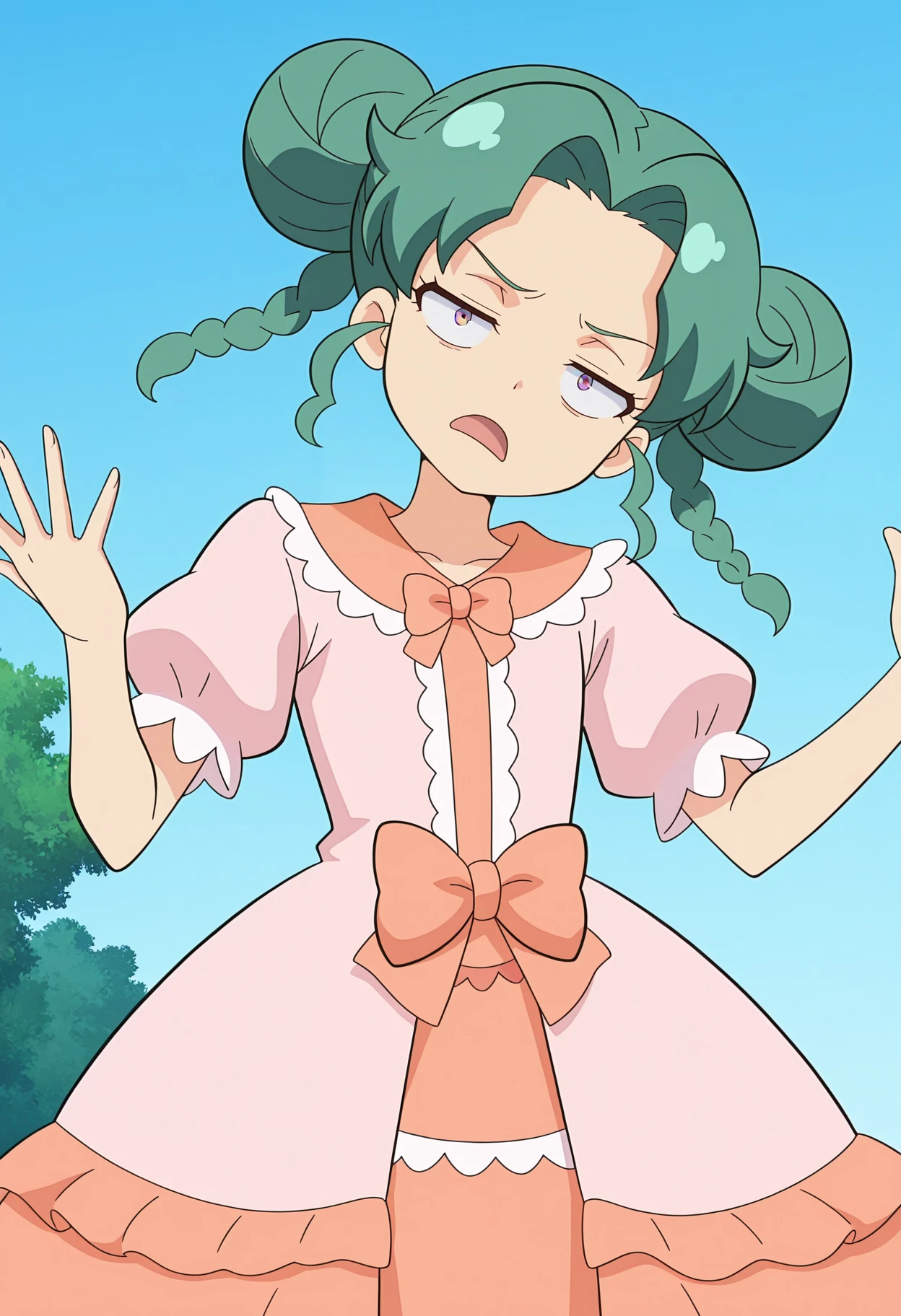 twin braids, two-tone dress, collared dress, pink dress, orange dress, layered dress, puffy sleeves, dress bow, bowtie,