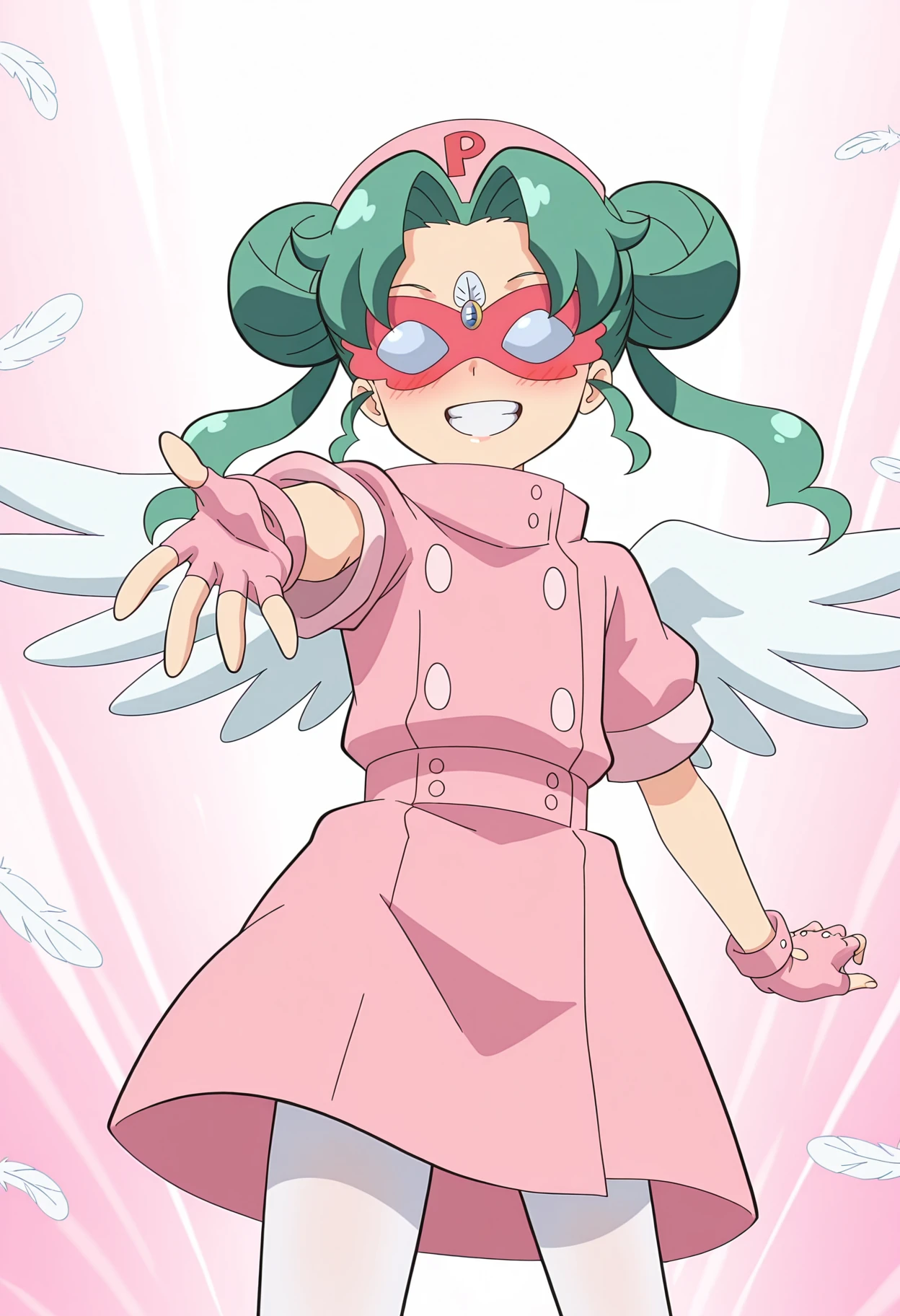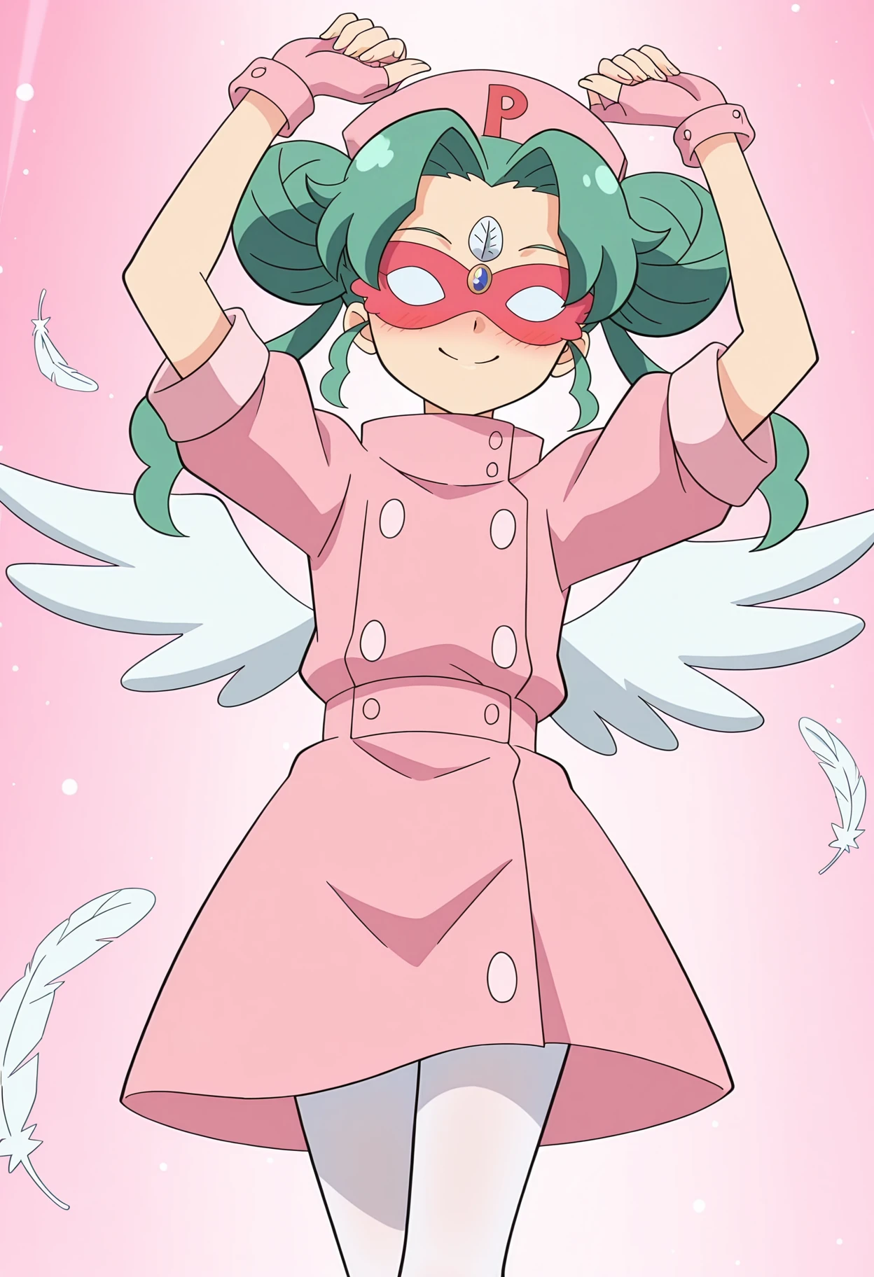 nurse cap, forehead gem, feathers, mask, nurse, pink dress, wings, white pantyhose,