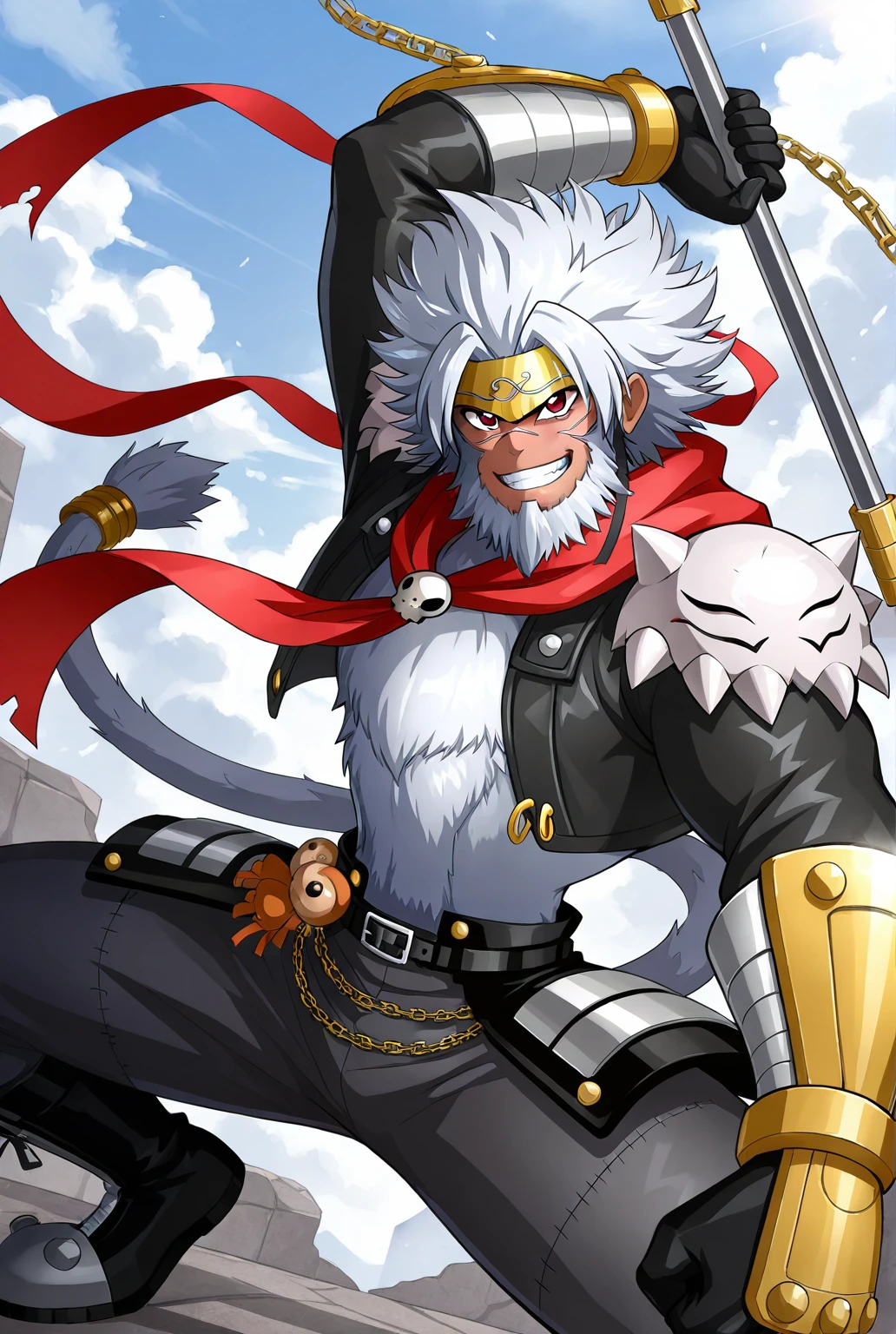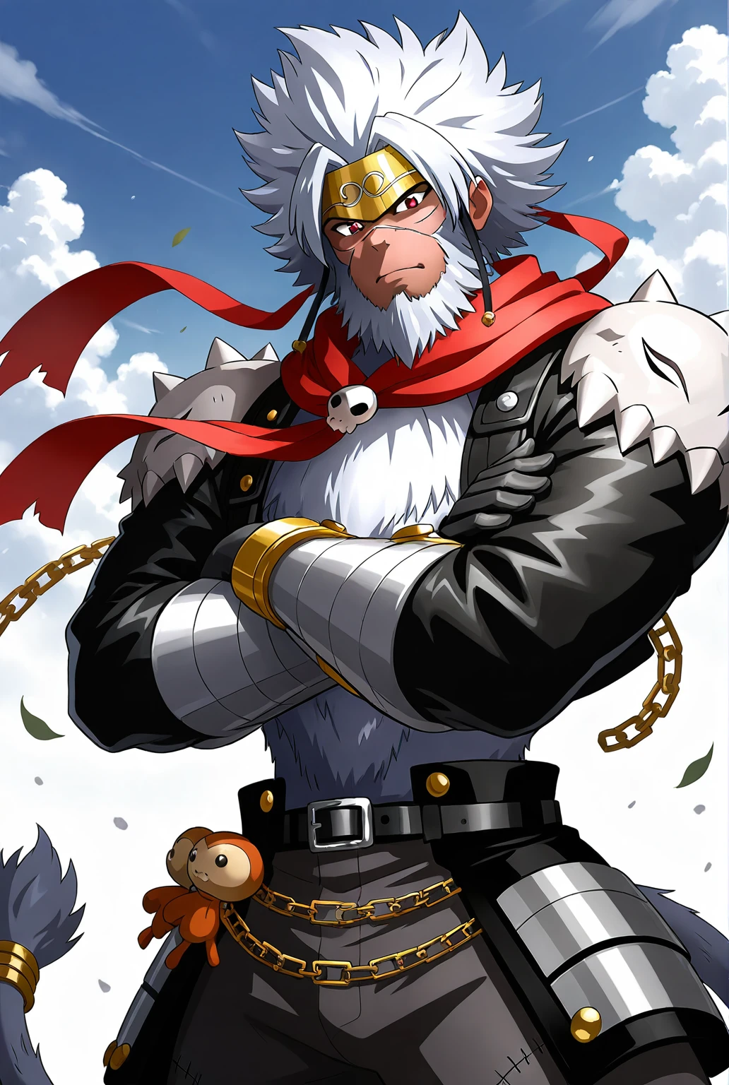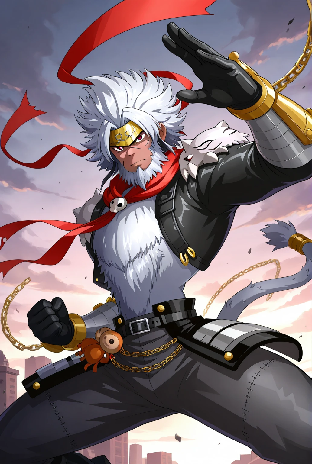 g0kuwm0n, digimon, facial hair, beard, white hair, chain, gloves, belt, tail, scarf, headband, boots, black footwear