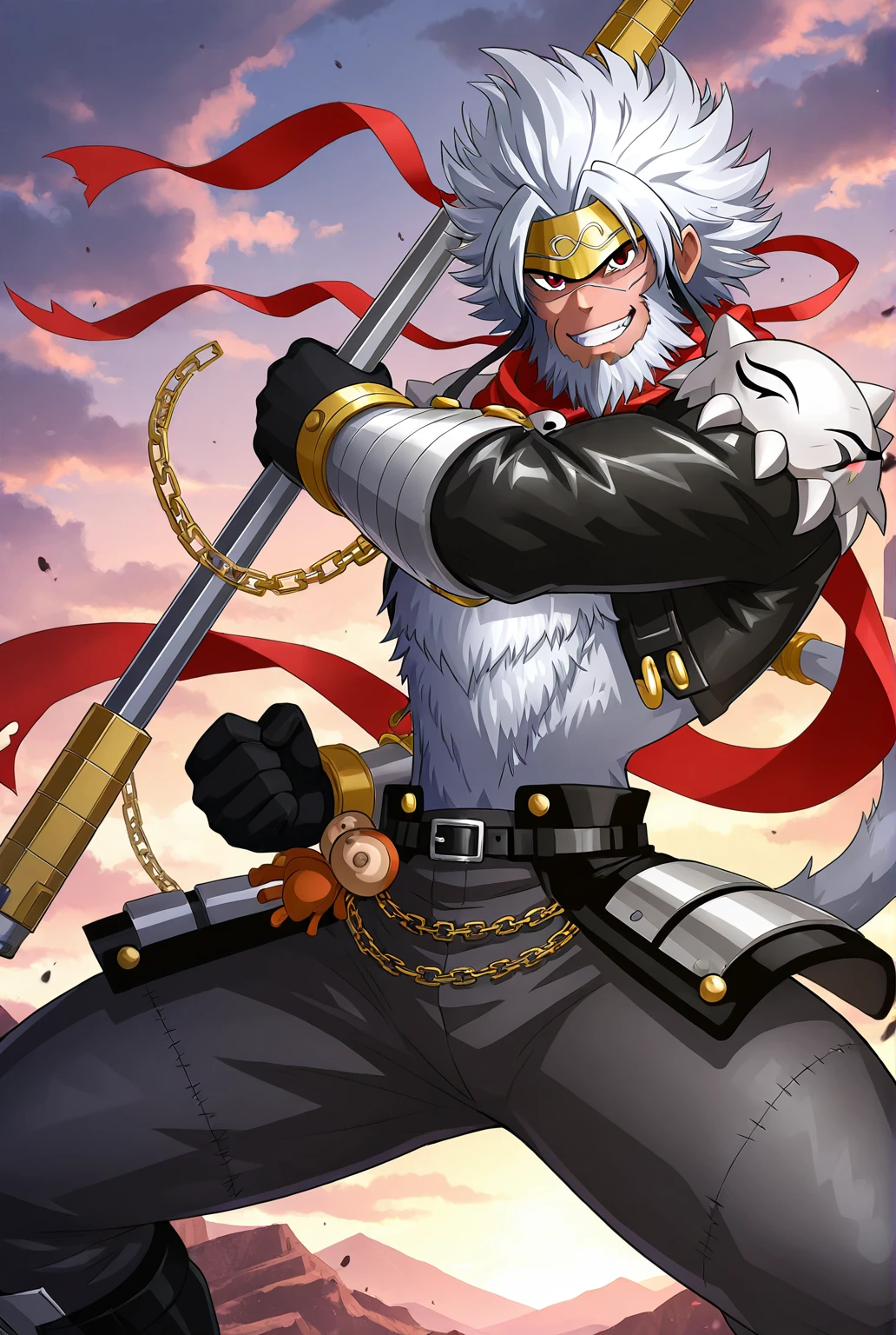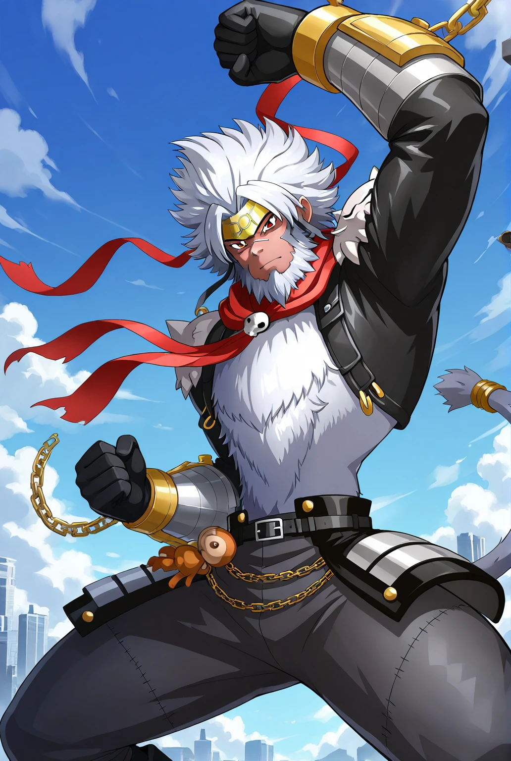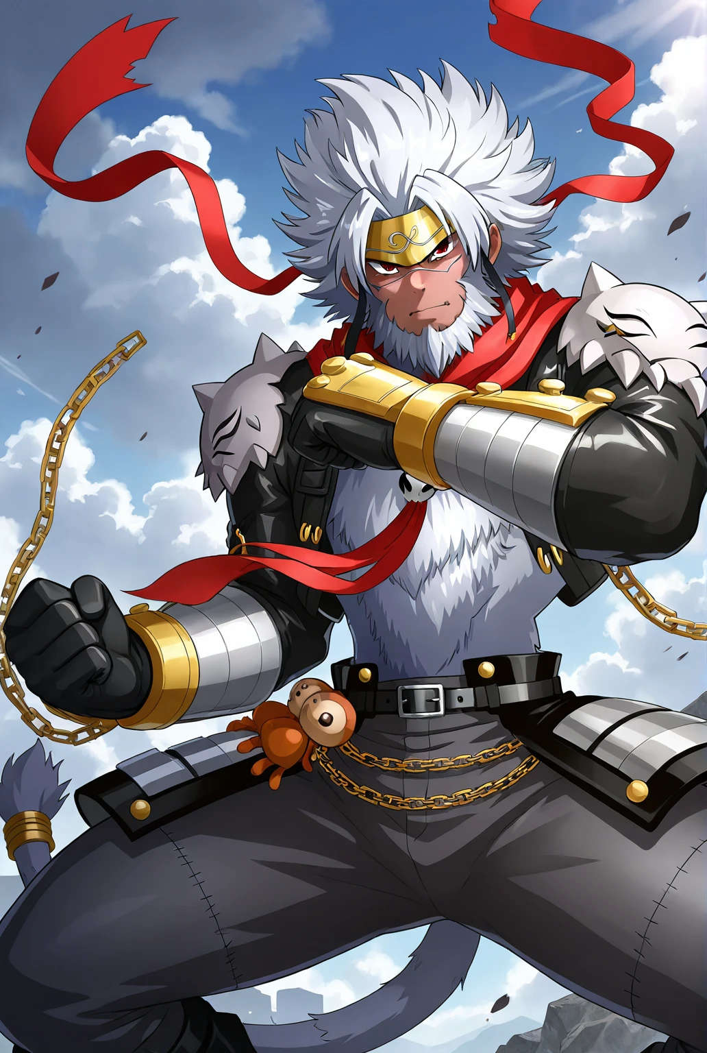 g0kuwm0n, digimon, facial hair, beard, white hair, chain, gloves, belt, tail, scarf, headband, boots, black footwear