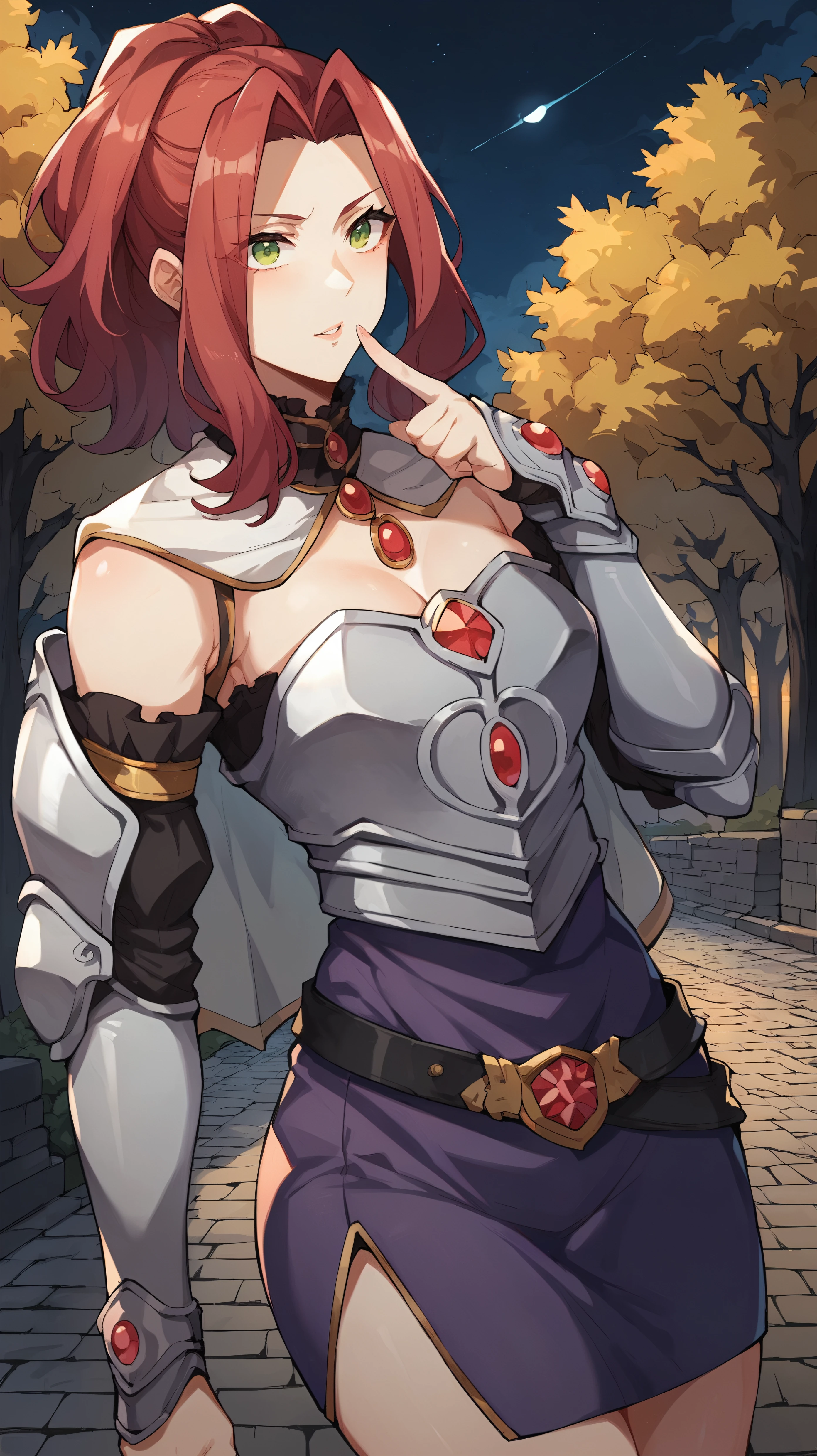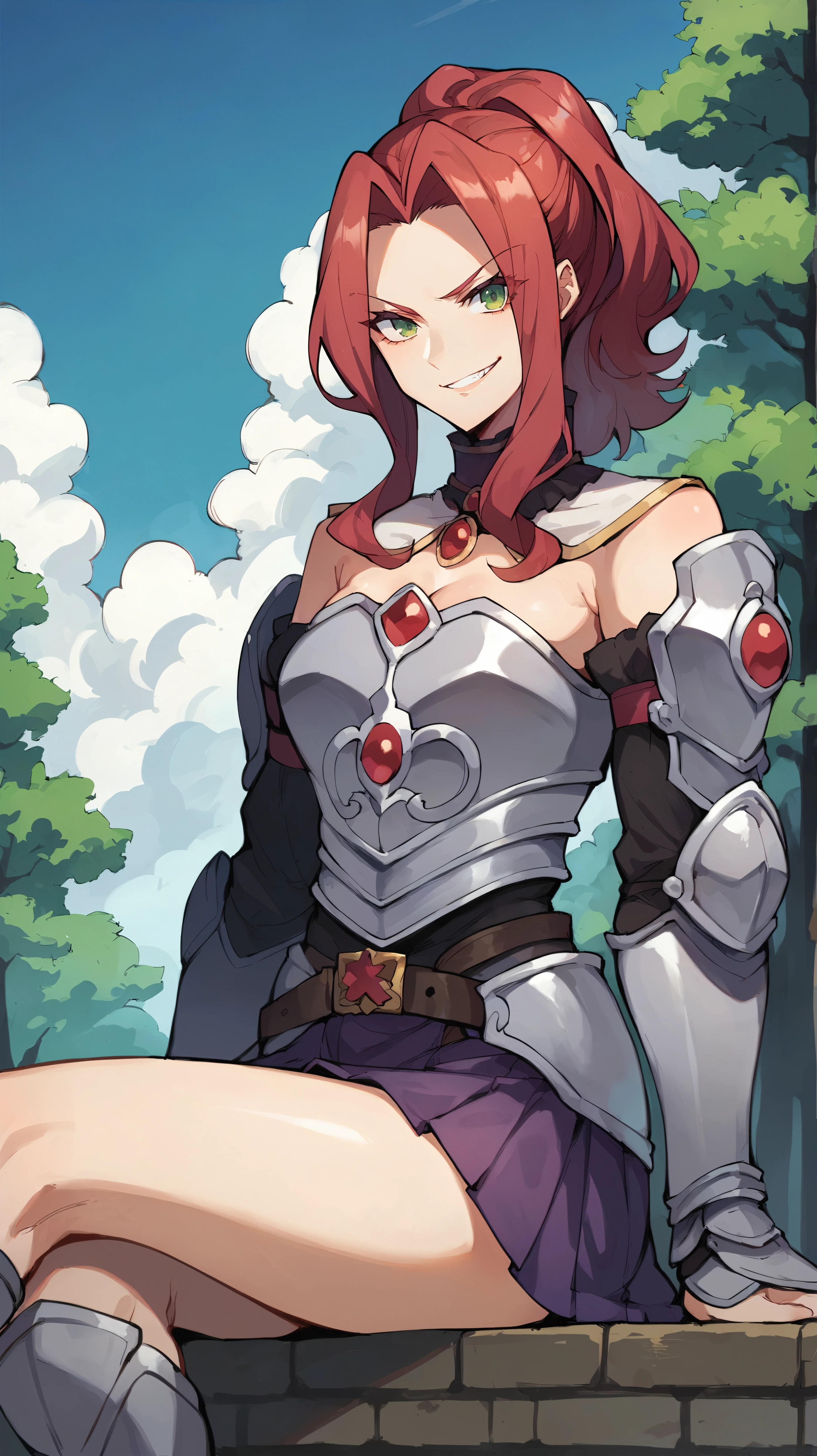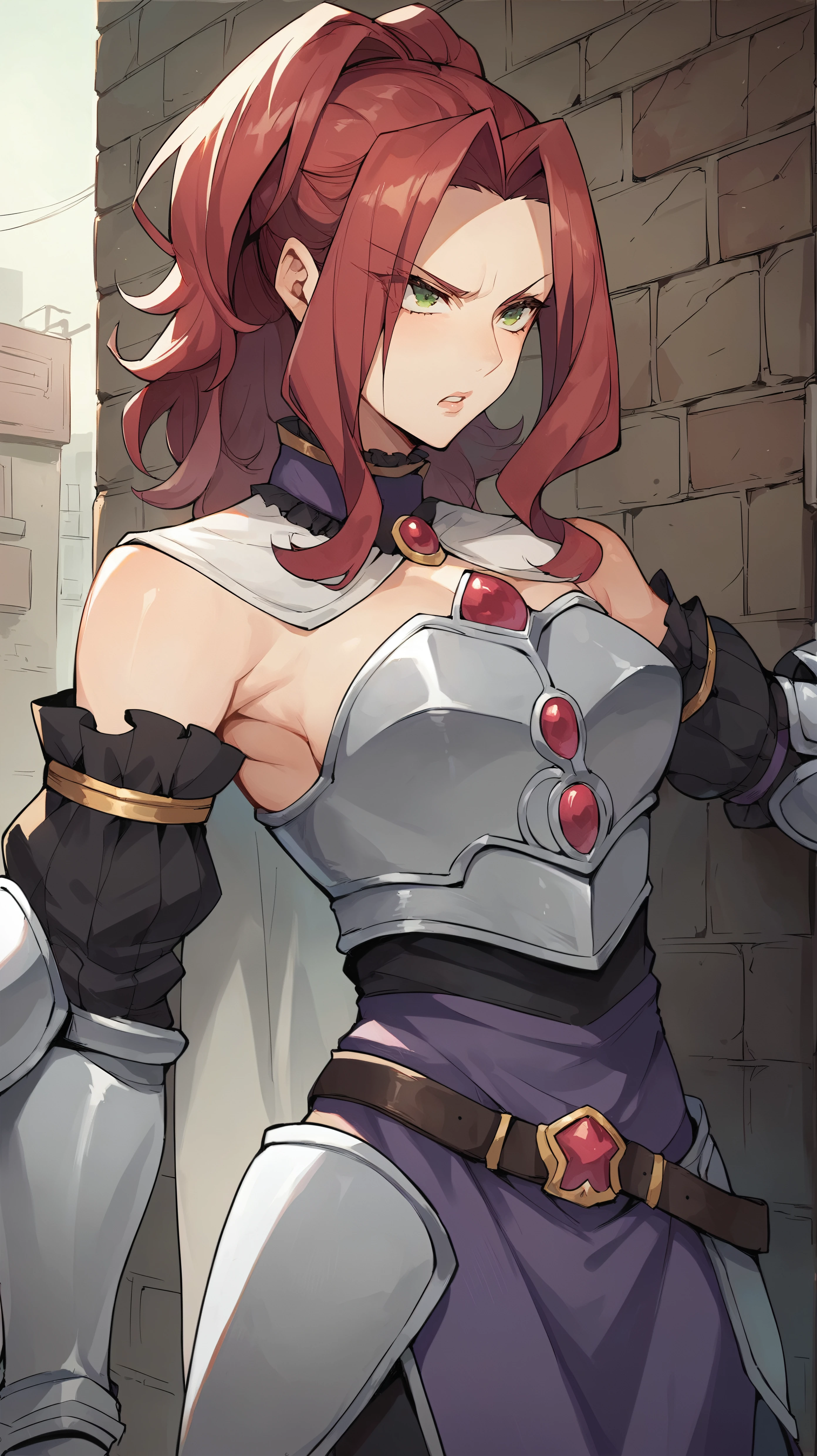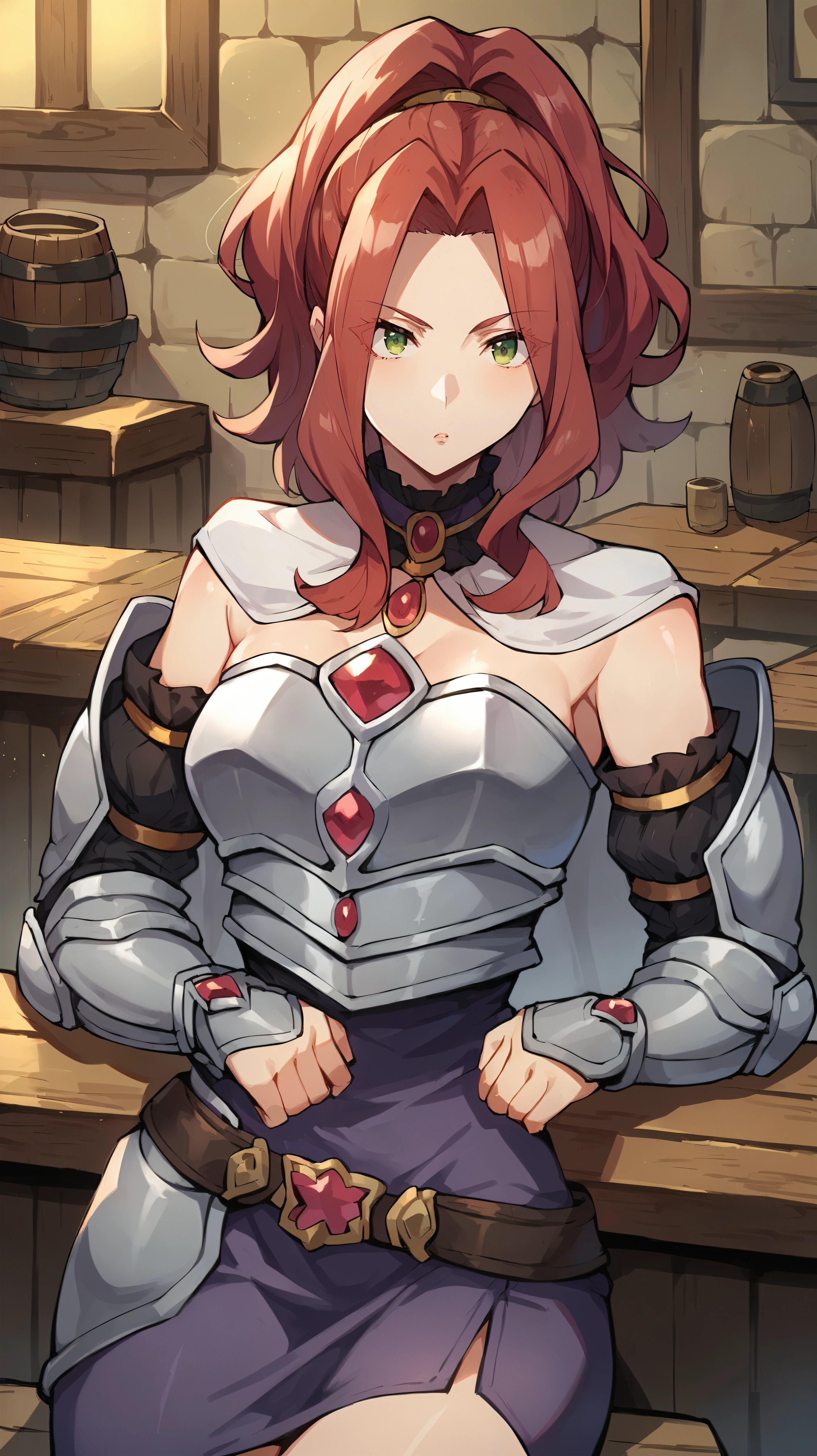 red hair, green eyes, armor, breastplate, detached sleeves, white cape, long skirt, purple skirt, black leather belt, arm guards, hair ornament
