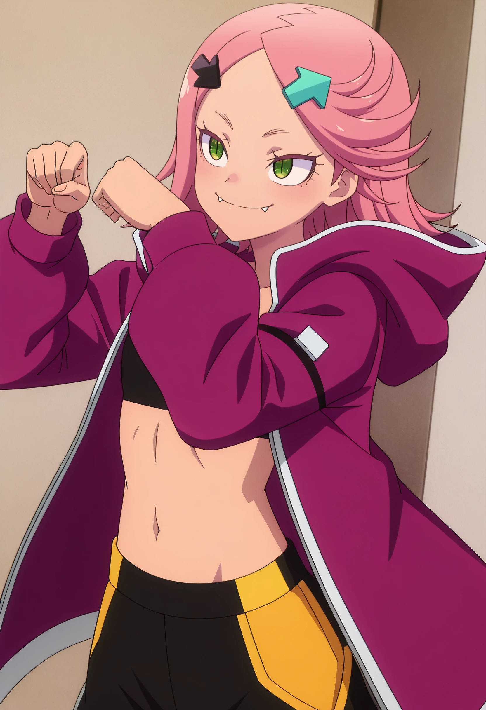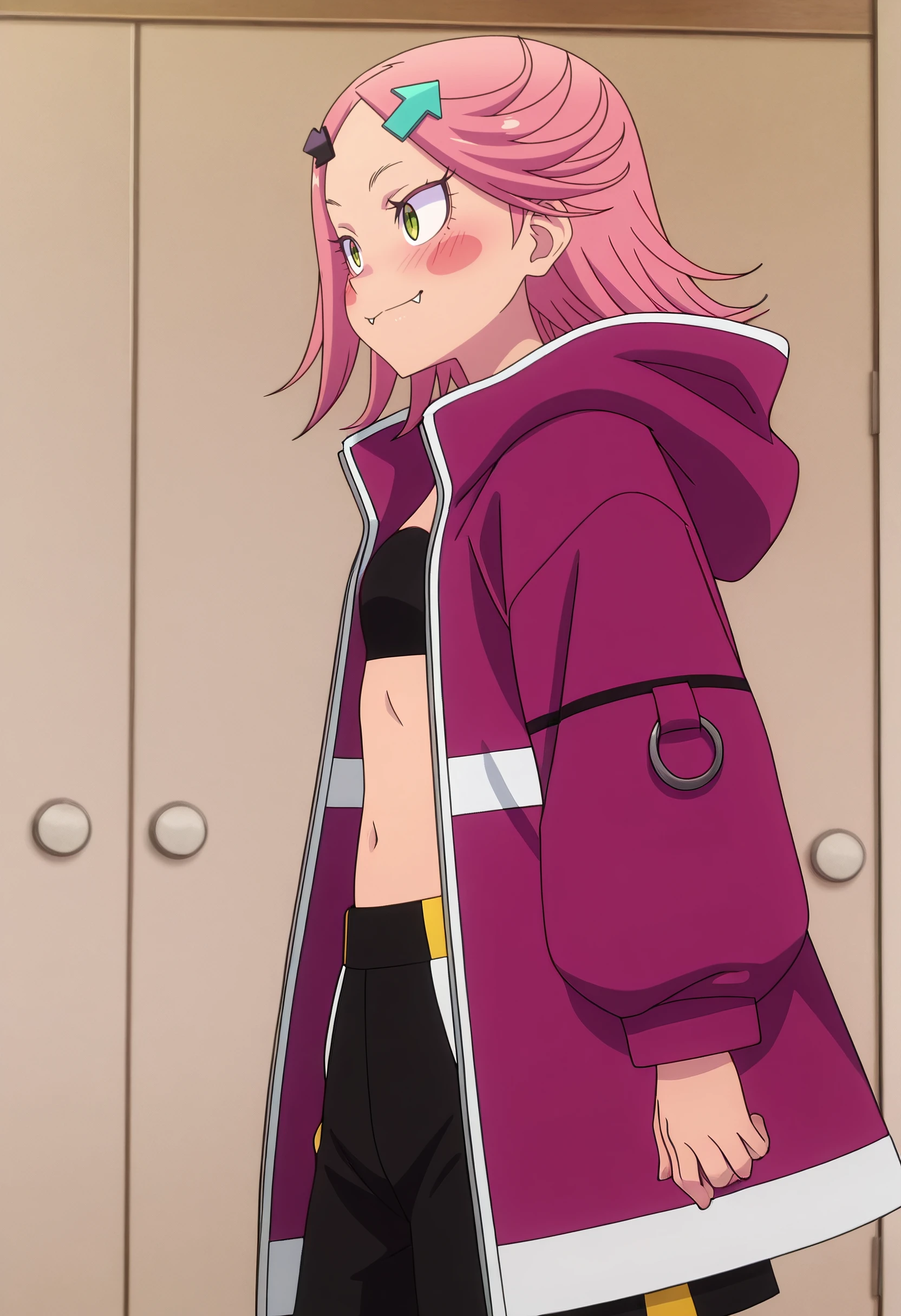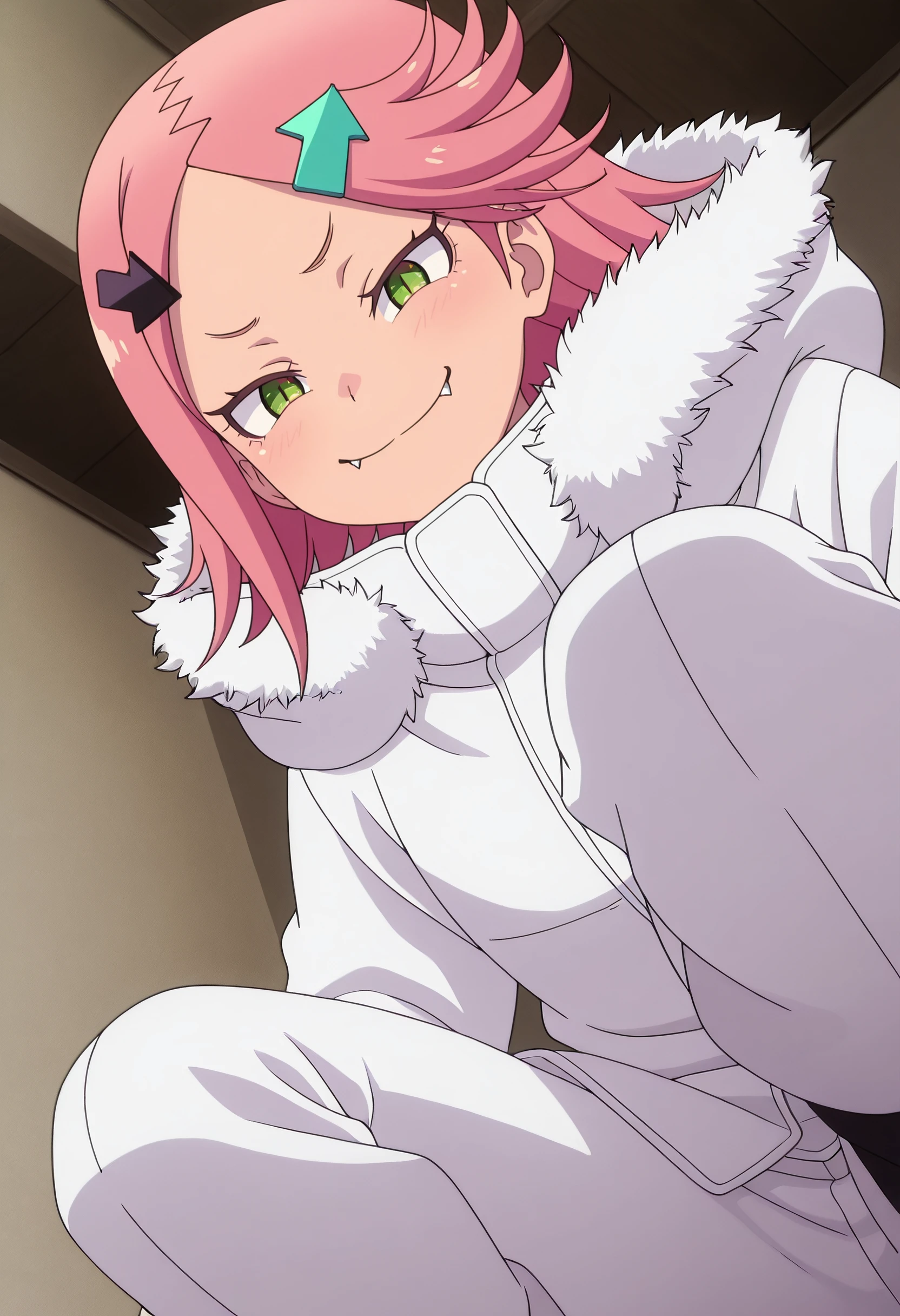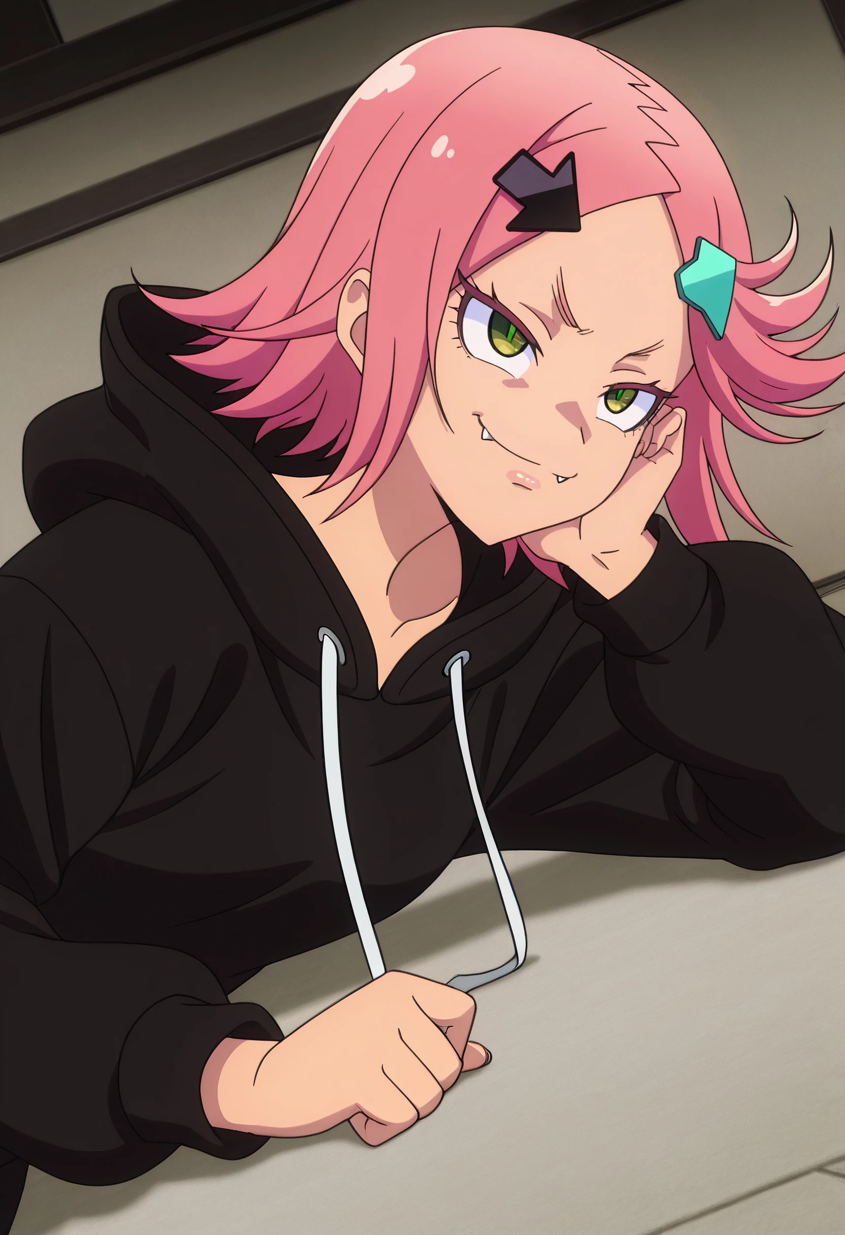 RWLAki, hair ornament, pink hair, short hair, green eyes, hairclip, directional arrow hair ornament, arrow (symbol), flipped hair, fangs,
