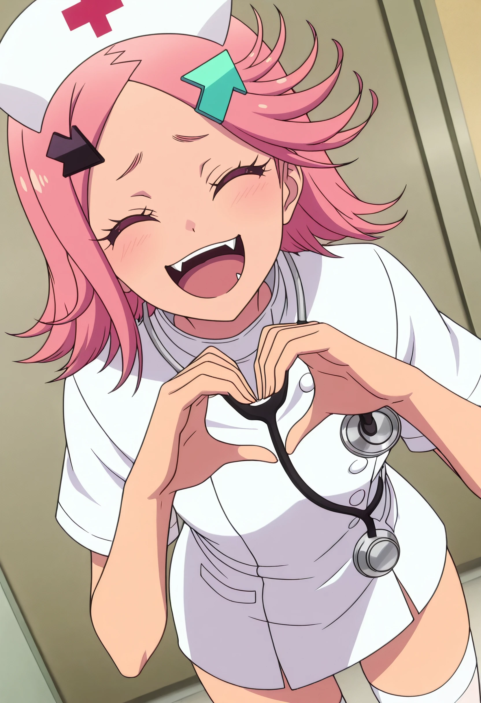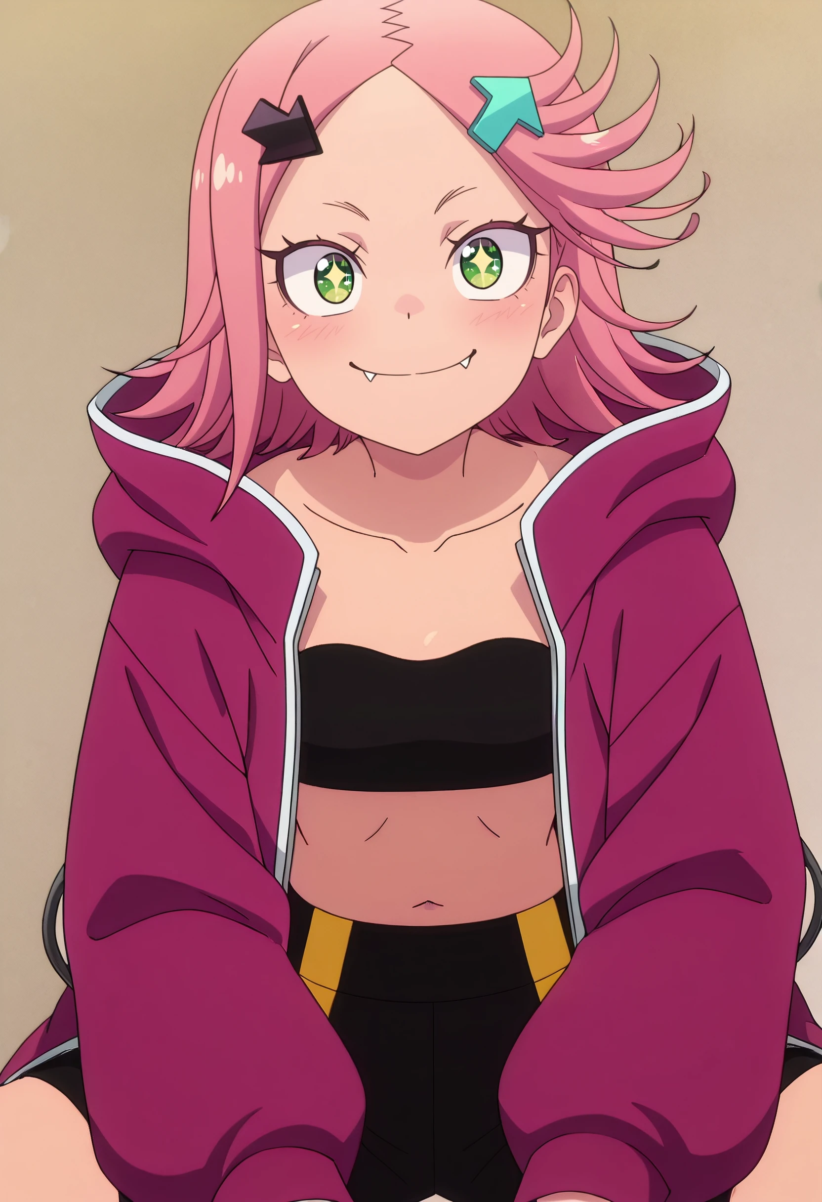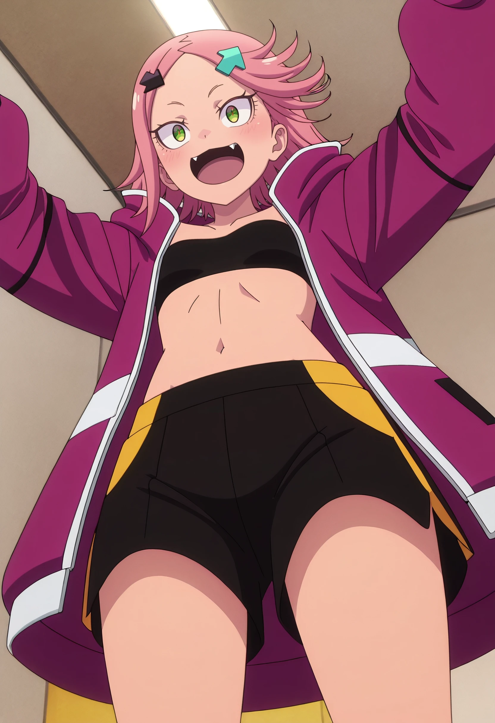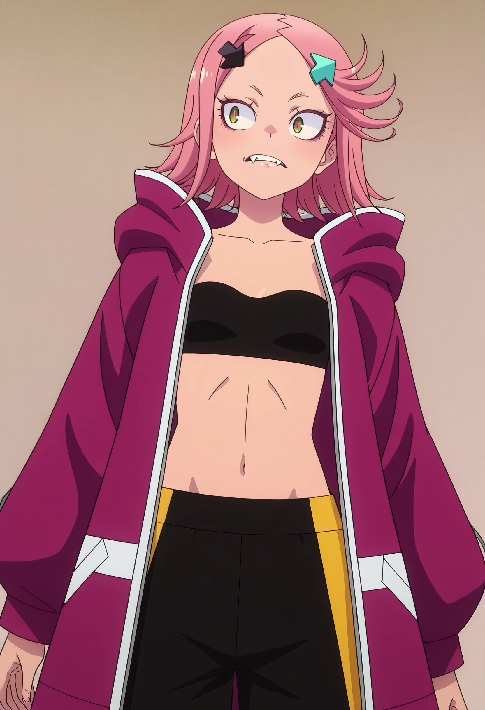 RWLAki, hair ornament, pink hair, short hair, green eyes, hairclip, directional arrow hair ornament, arrow (symbol), flipped hair, fangs,