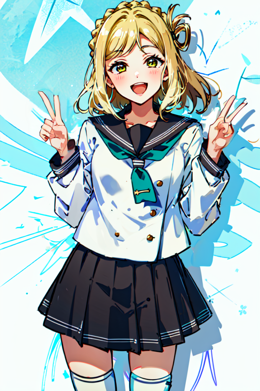 General tags: ohara mari, 1girl, solo, blonde hair, yellow eyes, medium hair, crown braid, hair rings