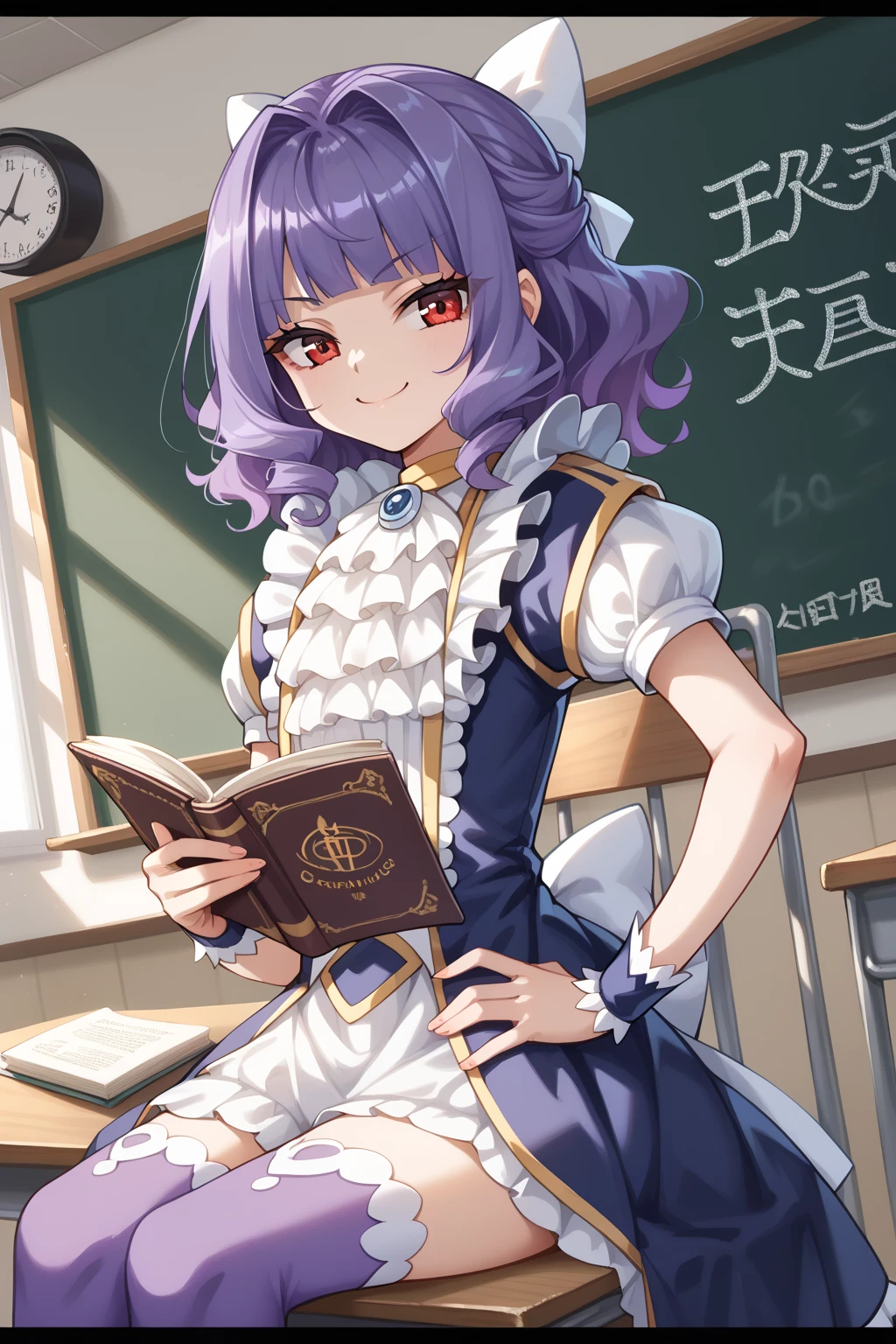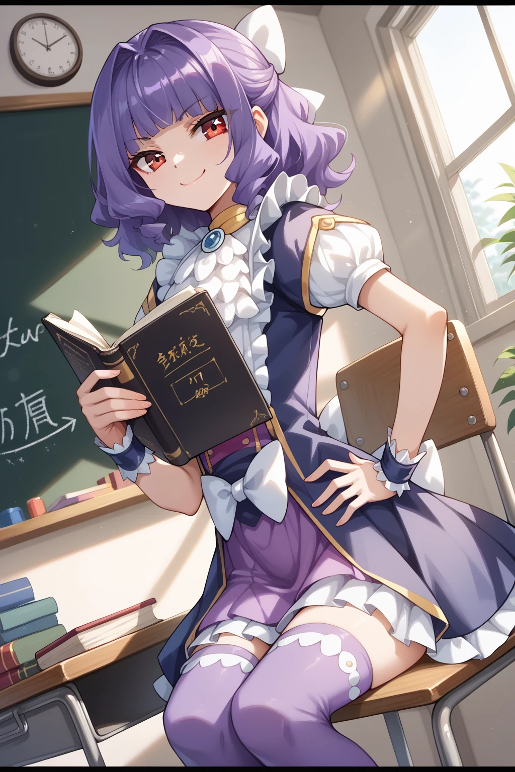 yaoyue,red eyes, purple thighhighs, purple hair, bow,dress, wristband, white bow