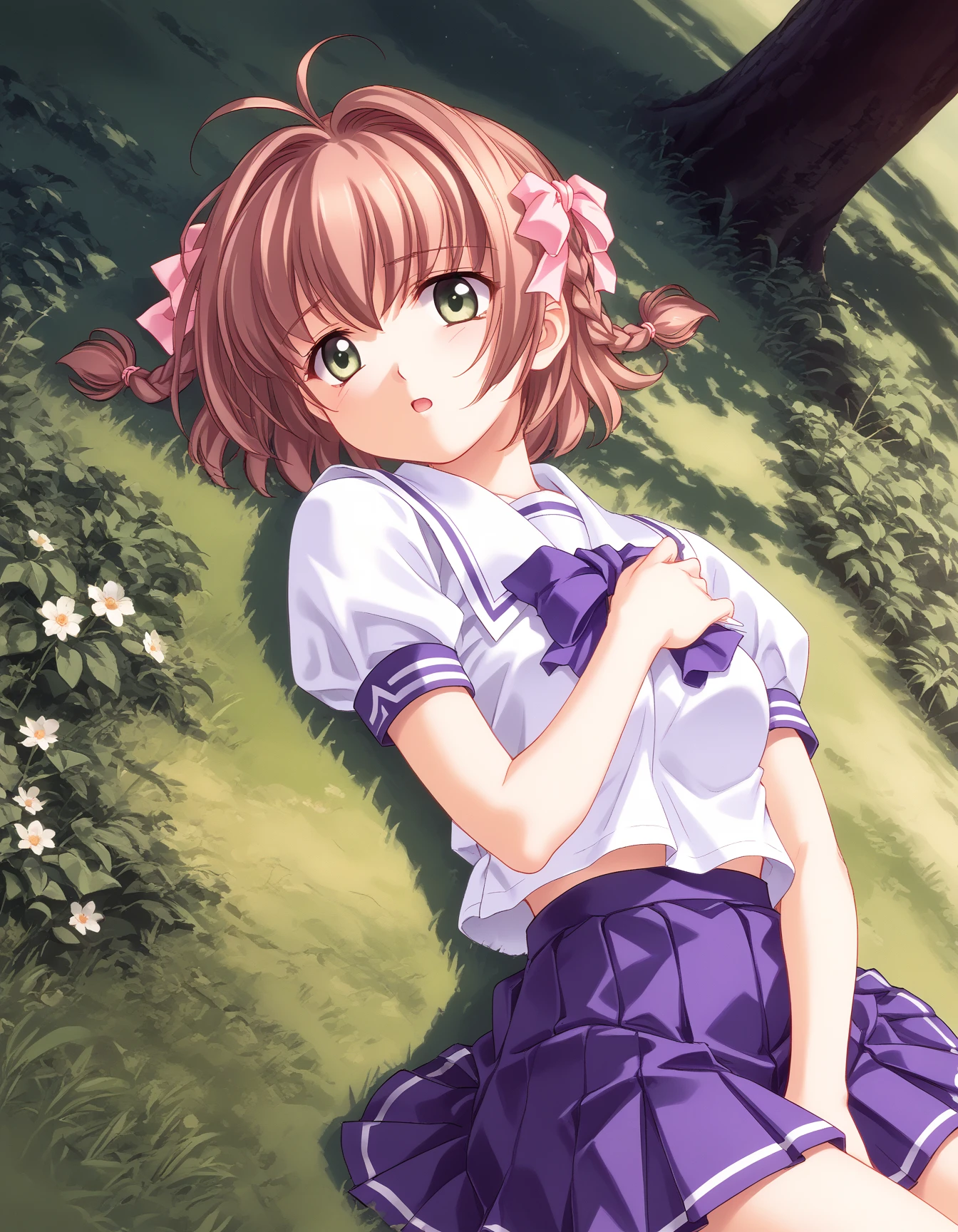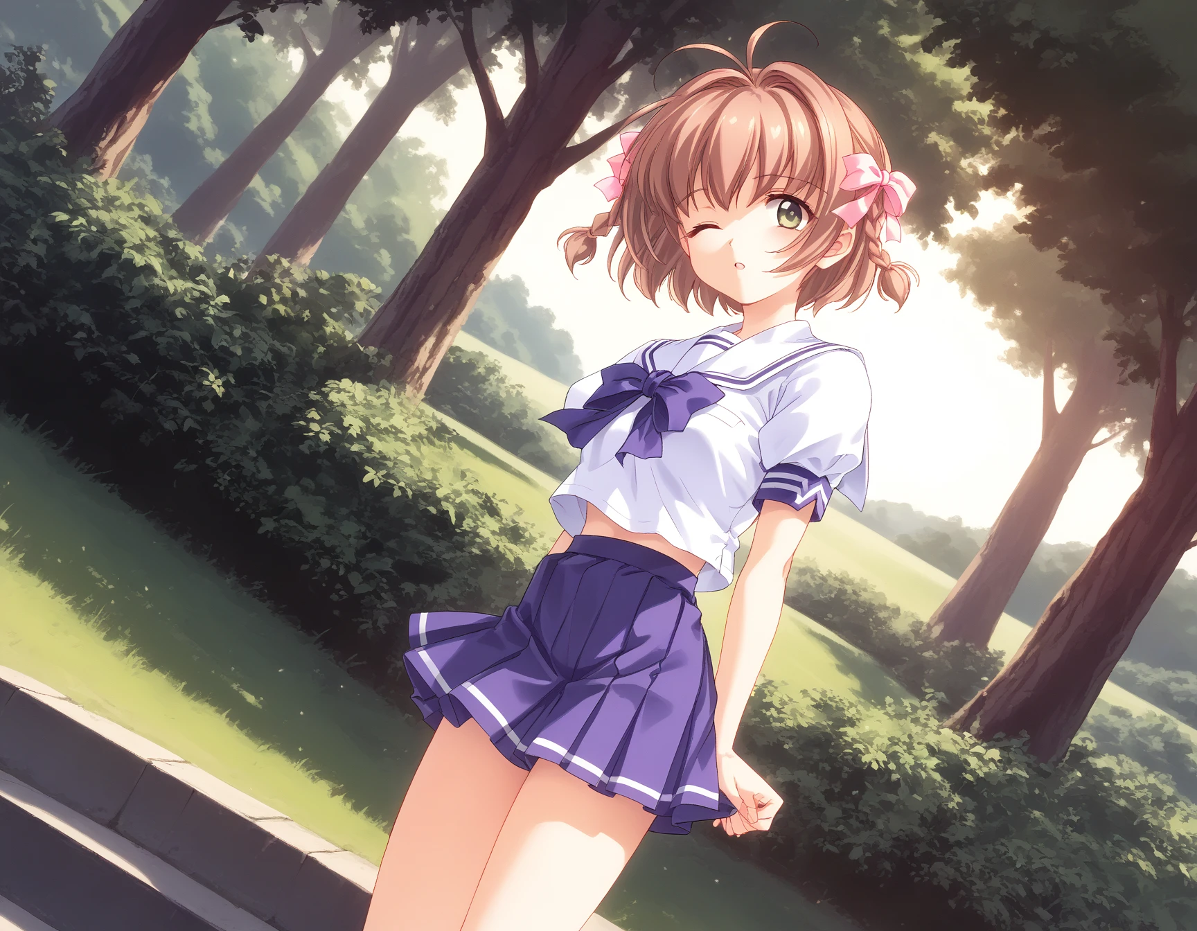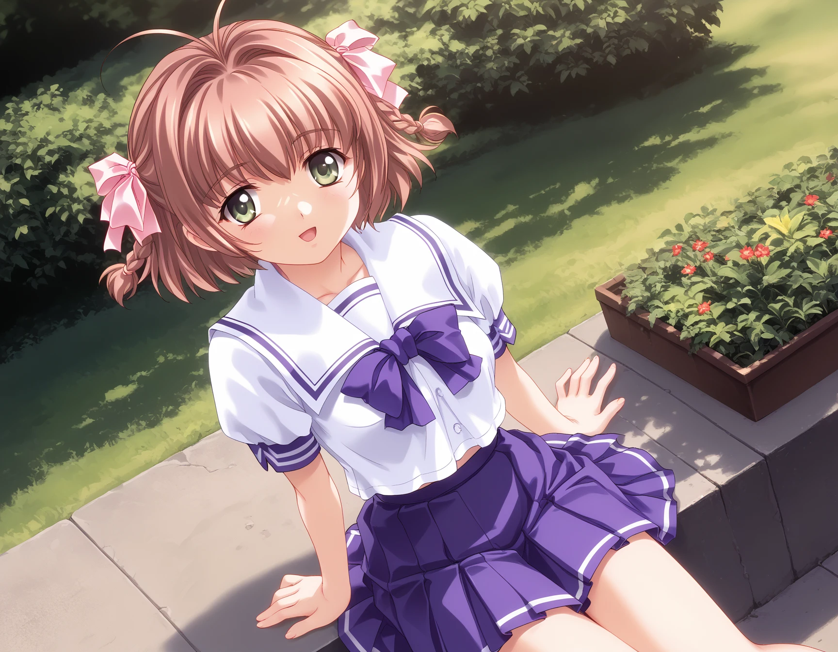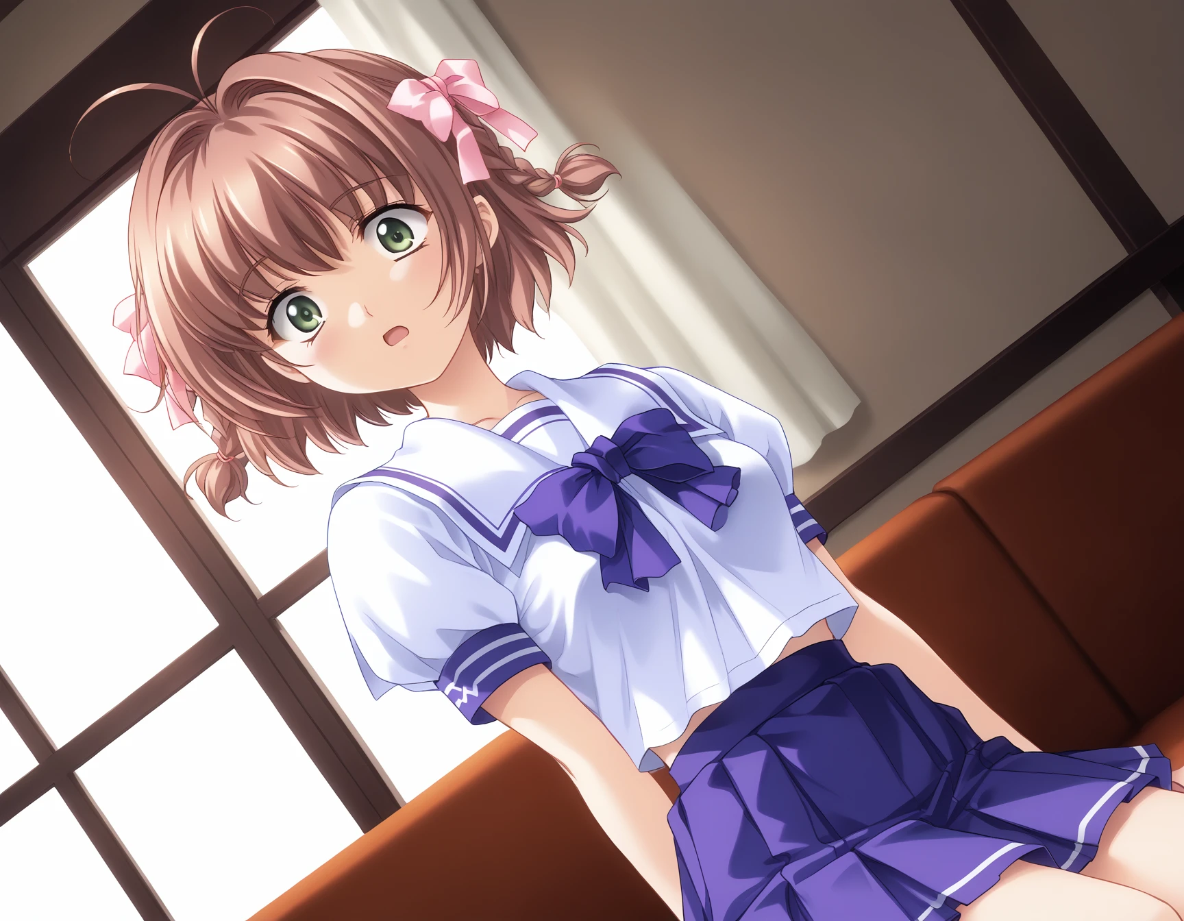 suzumiya_haruka, 1girl, solo, solo focus, green eyes, brown hair, short hair, braid, twin braids, hair intakes, antenna hair, bangs, hair between eyes, hair bow, pink bow, hair ribbon, pink ribbon, school uniform, serafuku, sailor collar, short sleeves, blue ribbon, blue bow, pleated skirt, blue skirt