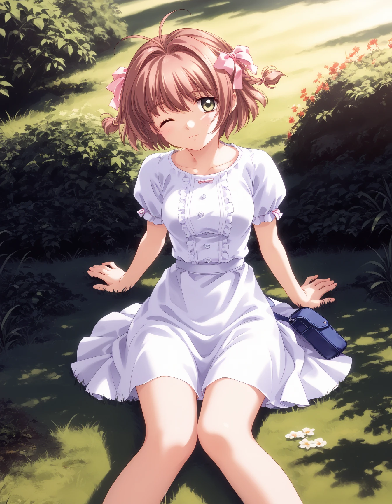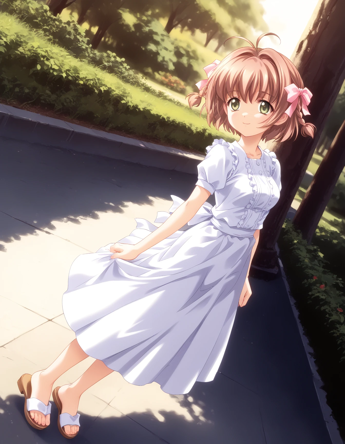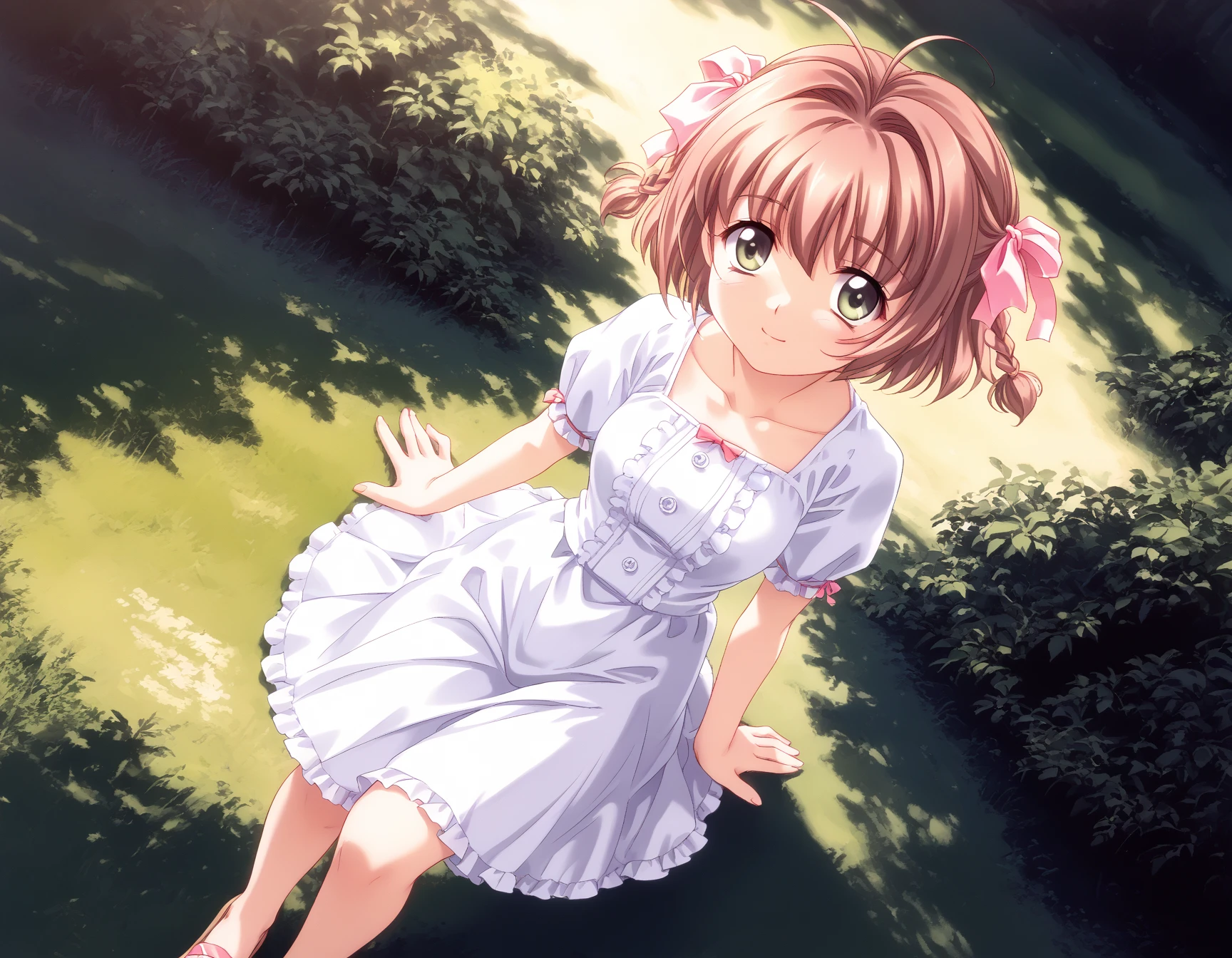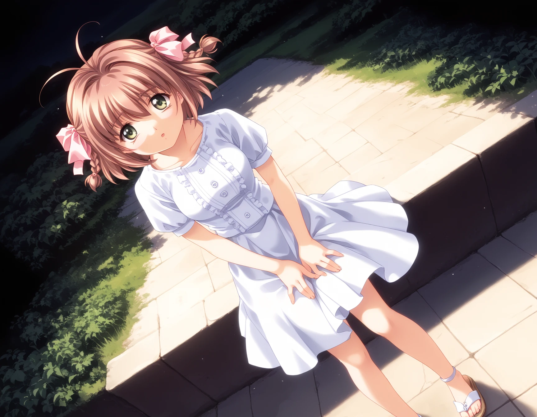 suzumiya_haruka, 1girl, solo, solo focus, green eyes, brown hair, short hair, braid, twin braids, hair intakes, antenna hair, bangs, hair between eyes, hair bow, pink bow, hair ribbon, pink ribbon, dress, white dress, center frills, short sleeves, sandals