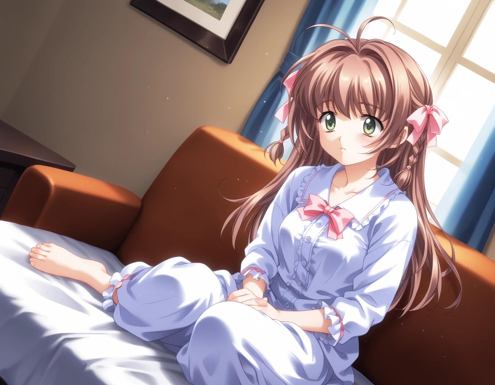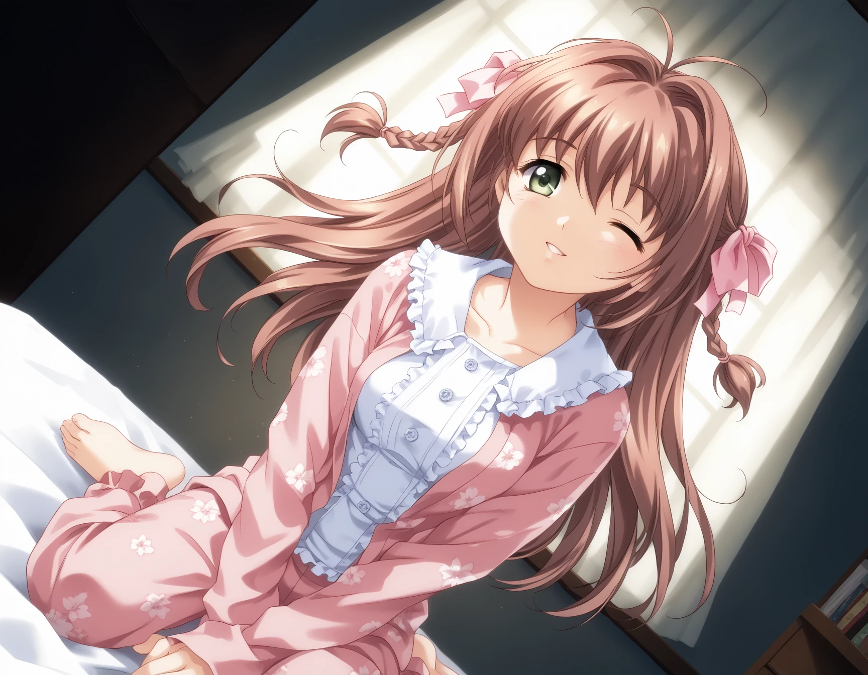 suzumiya_haruka, 1girl, solo, solo focus, green eyes, brown hair, long hair, braid, twin braids, hair intakes, antenna hair, bangs, hair between eyes, hair bow, pink bow, hair ribbon, pink ribbon, pajamas, ribbon, bow