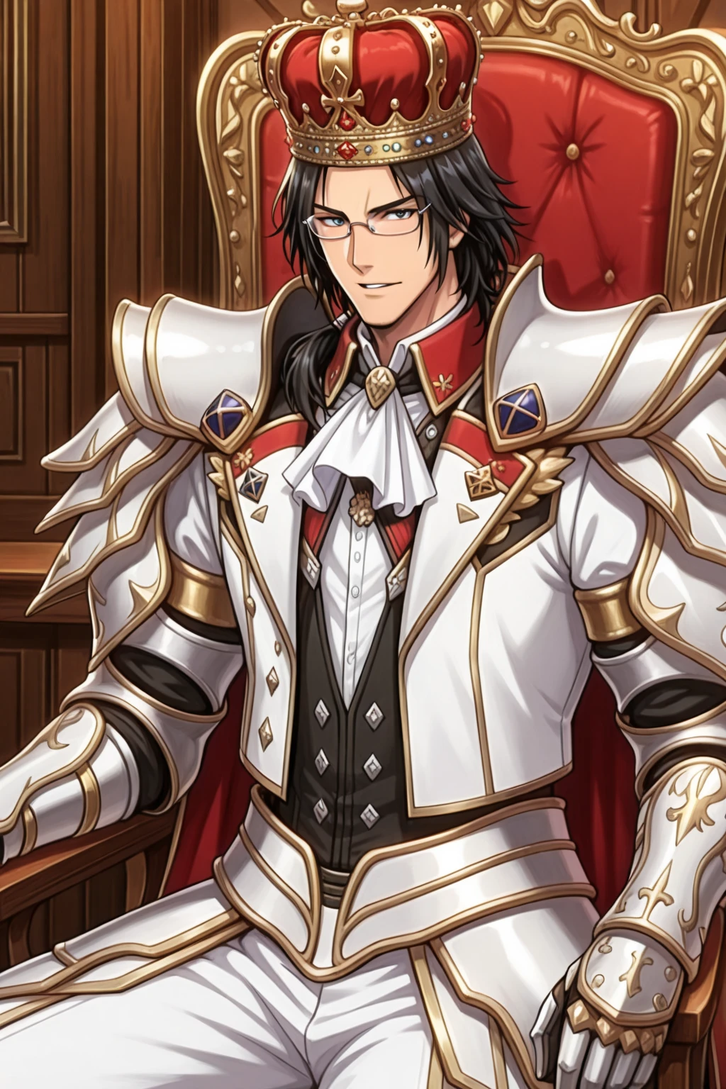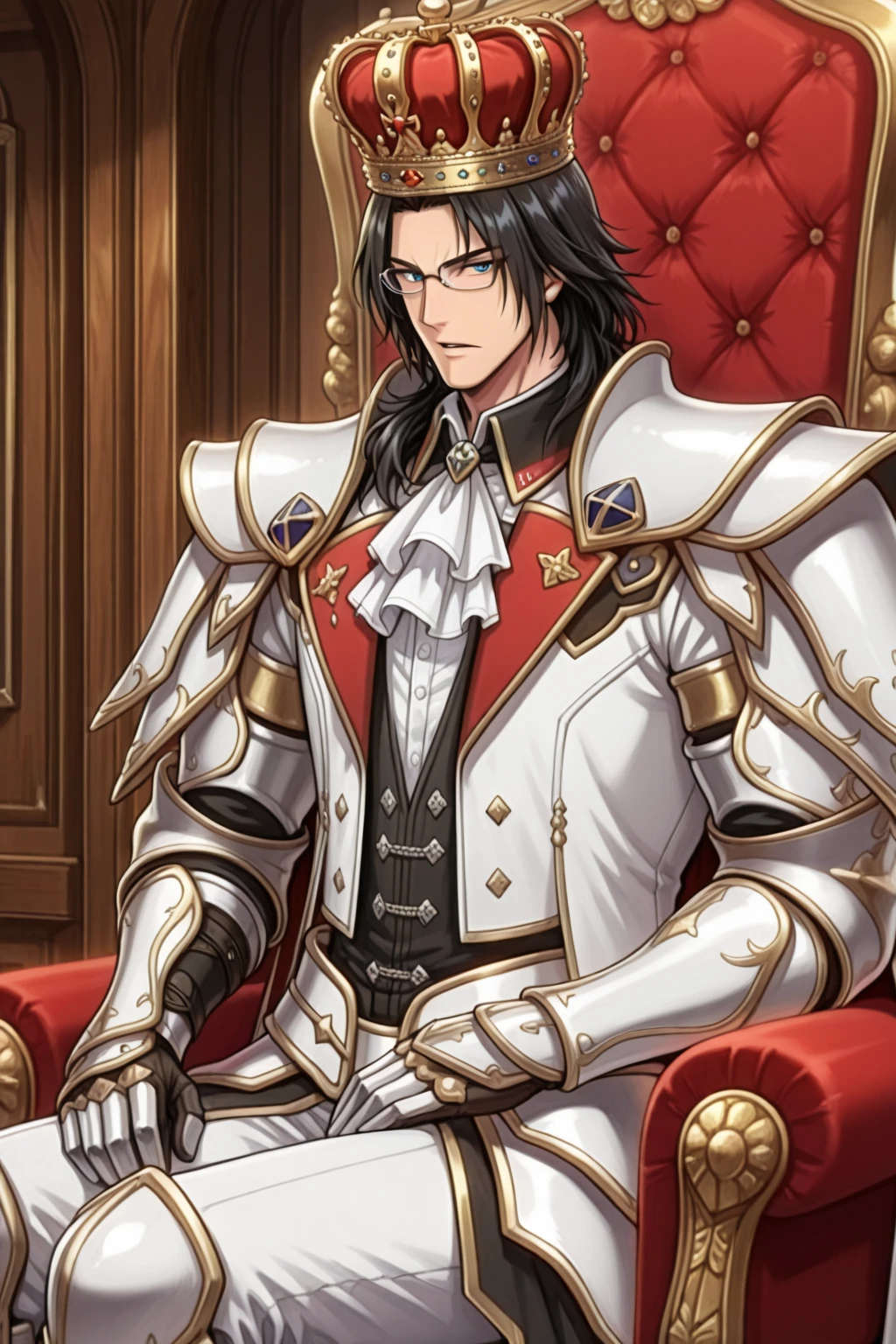 Black hair, medium hair, glasses, cape, crown, velvet crowe,