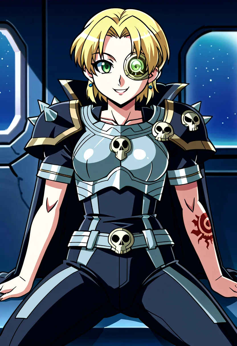 Prompt is "ryzzart", for her outfit "bionic eye,shoulder armor,armor,pauldrons,pants,cape".