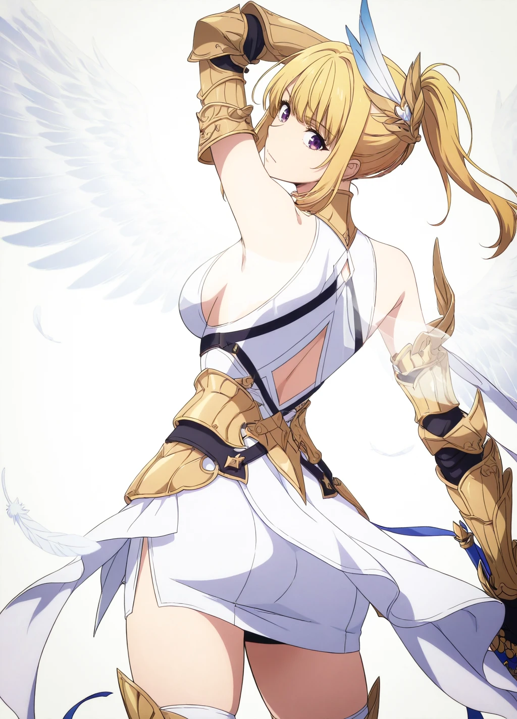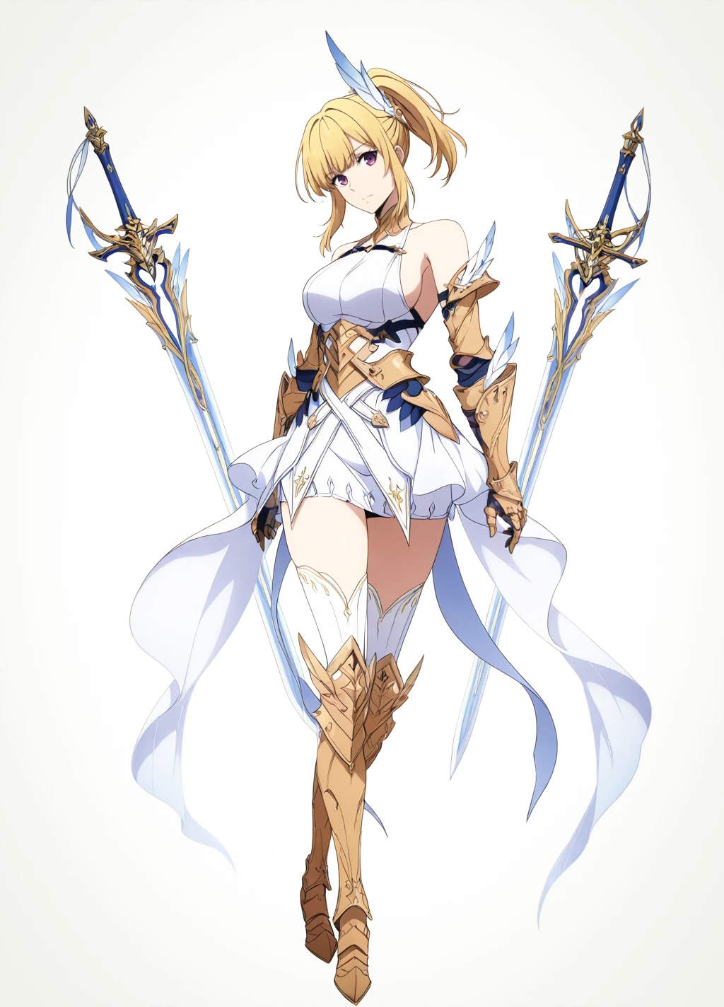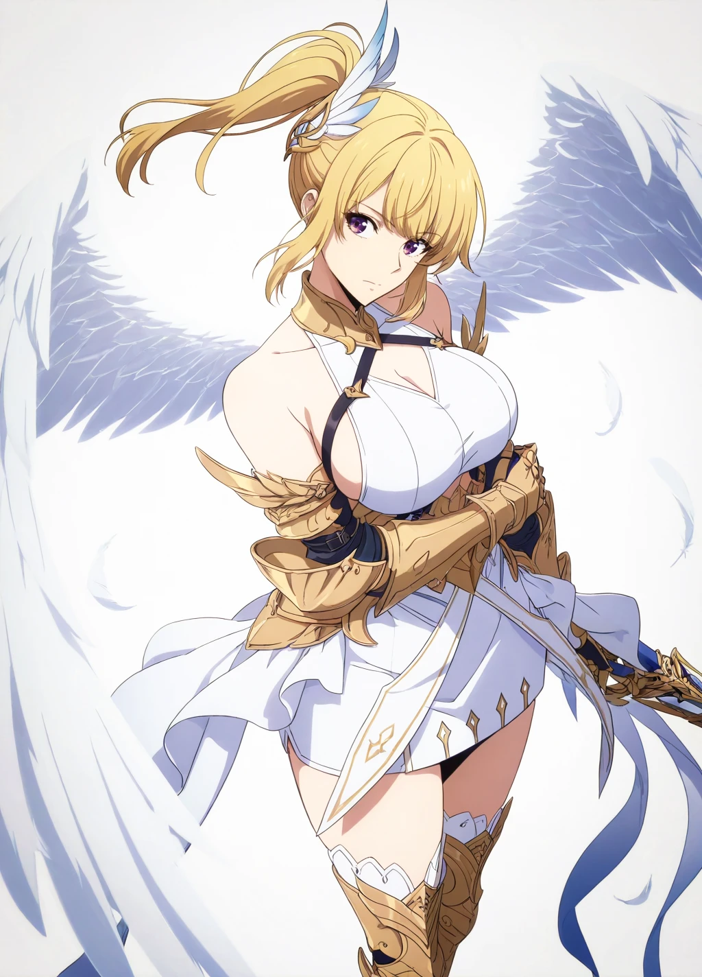 chapure, 1girl, blonde hair, weapon,gauntlets, hair ornament, bare shoulders, ponytail, holding weapon, white dress, dress, sword, holding, armor, bangs,purple eyes, feathers, feather hair ornament, thighs, long hair, large breasts, holding sword, sleeveless, sideboob, sidelocks, thighhighs, boots, armored boots, white thighhighs, thighs, greaves, armored dress,