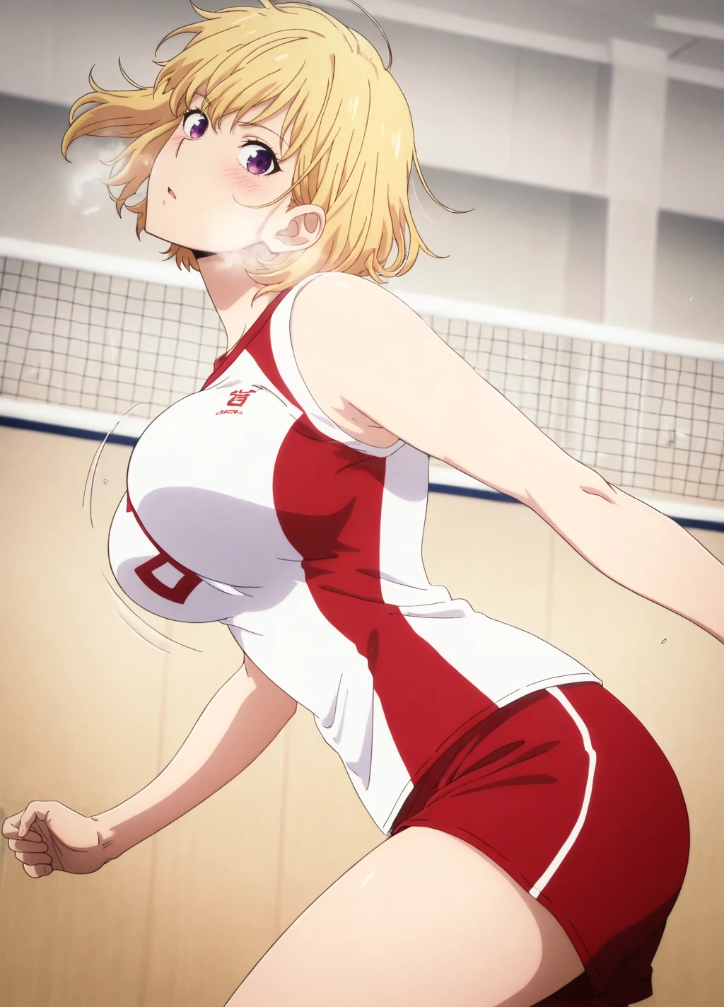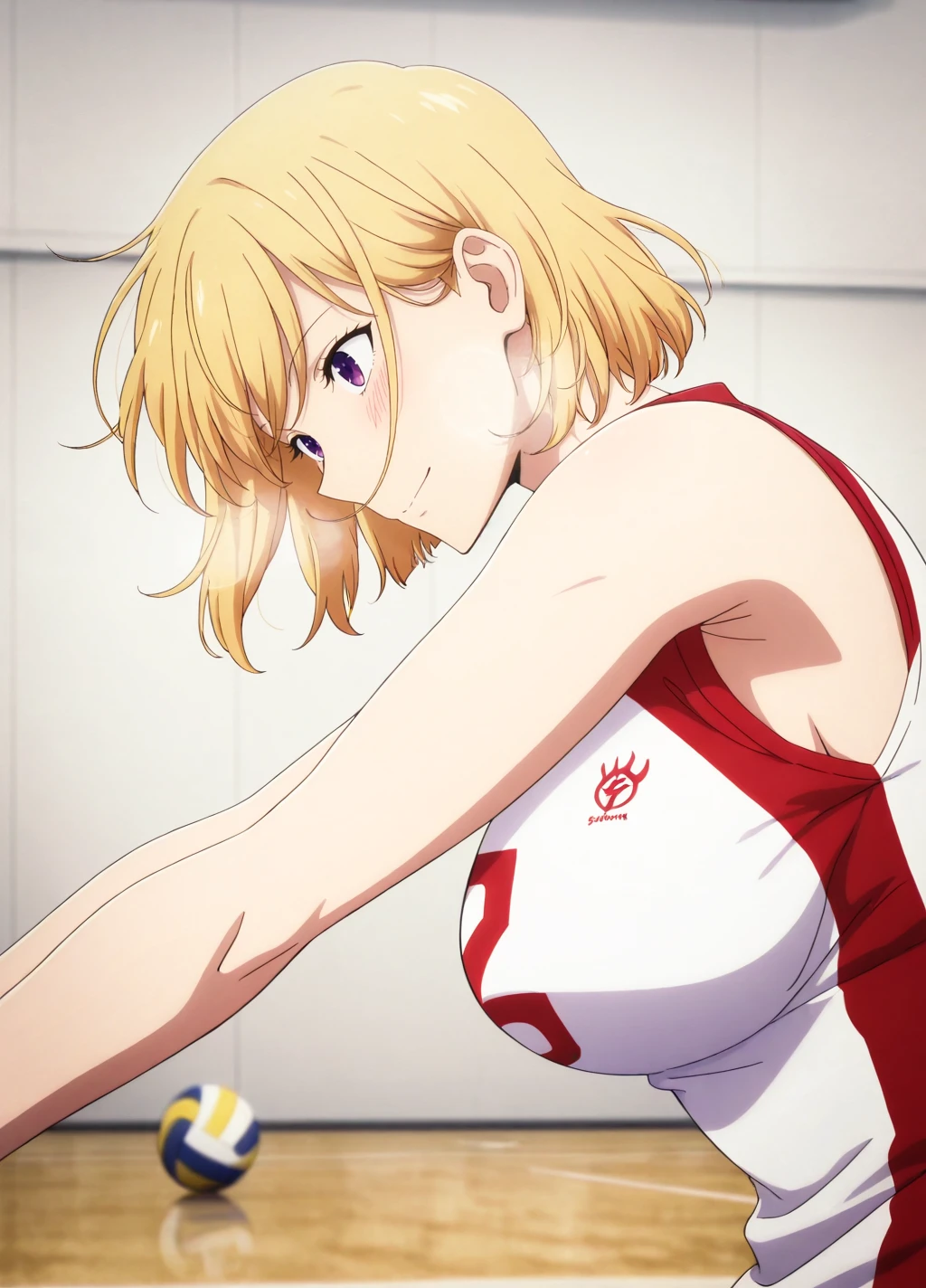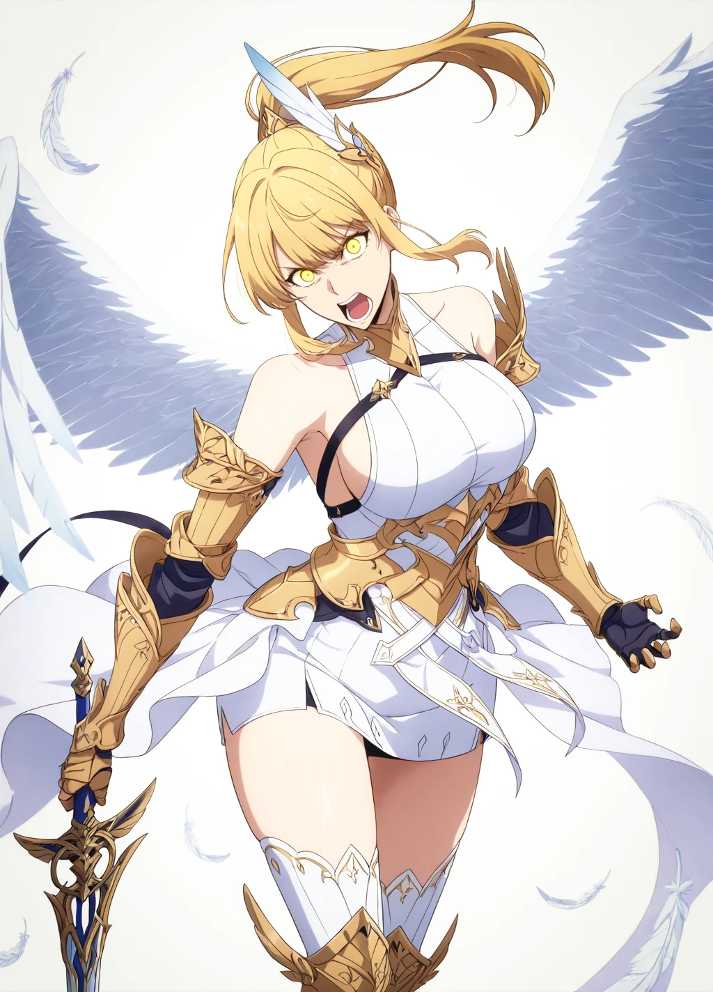 chapure, 1girl, blonde hair, weapon,gauntlets, hair ornament, bare shoulders, ponytail, holding weapon, white dress, dress, sword, holding, armor, bangs,purple eyes, feathers, feather hair ornament, thighs, long hair, large breasts, holding sword, sleeveless, sideboob, sidelocks, thighhighs, boots, armored boots, white thighhighs, thighs, greaves, armored dress,