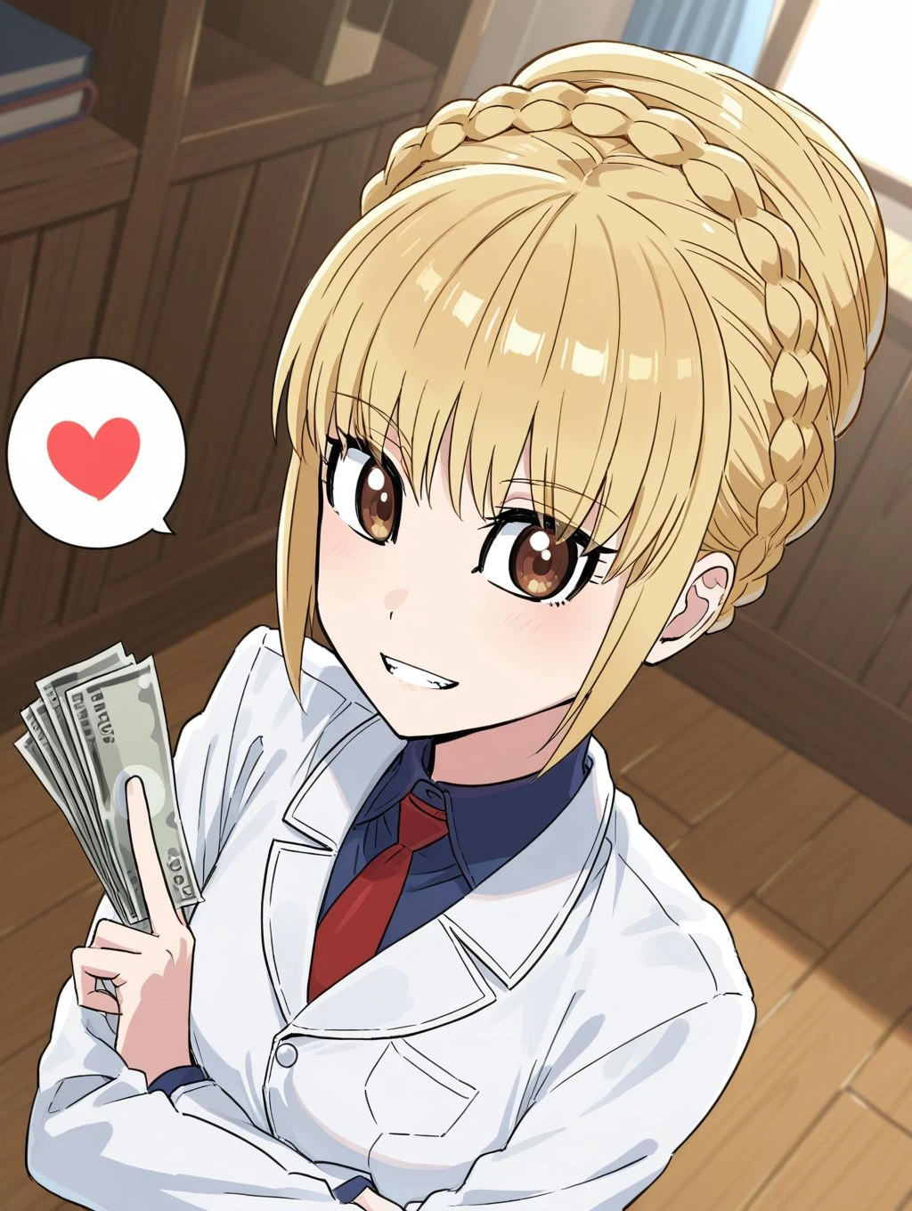 yurika: yuricachan,short hair,bangs,blonde hair,sidelocks, single hair bun, crown braid