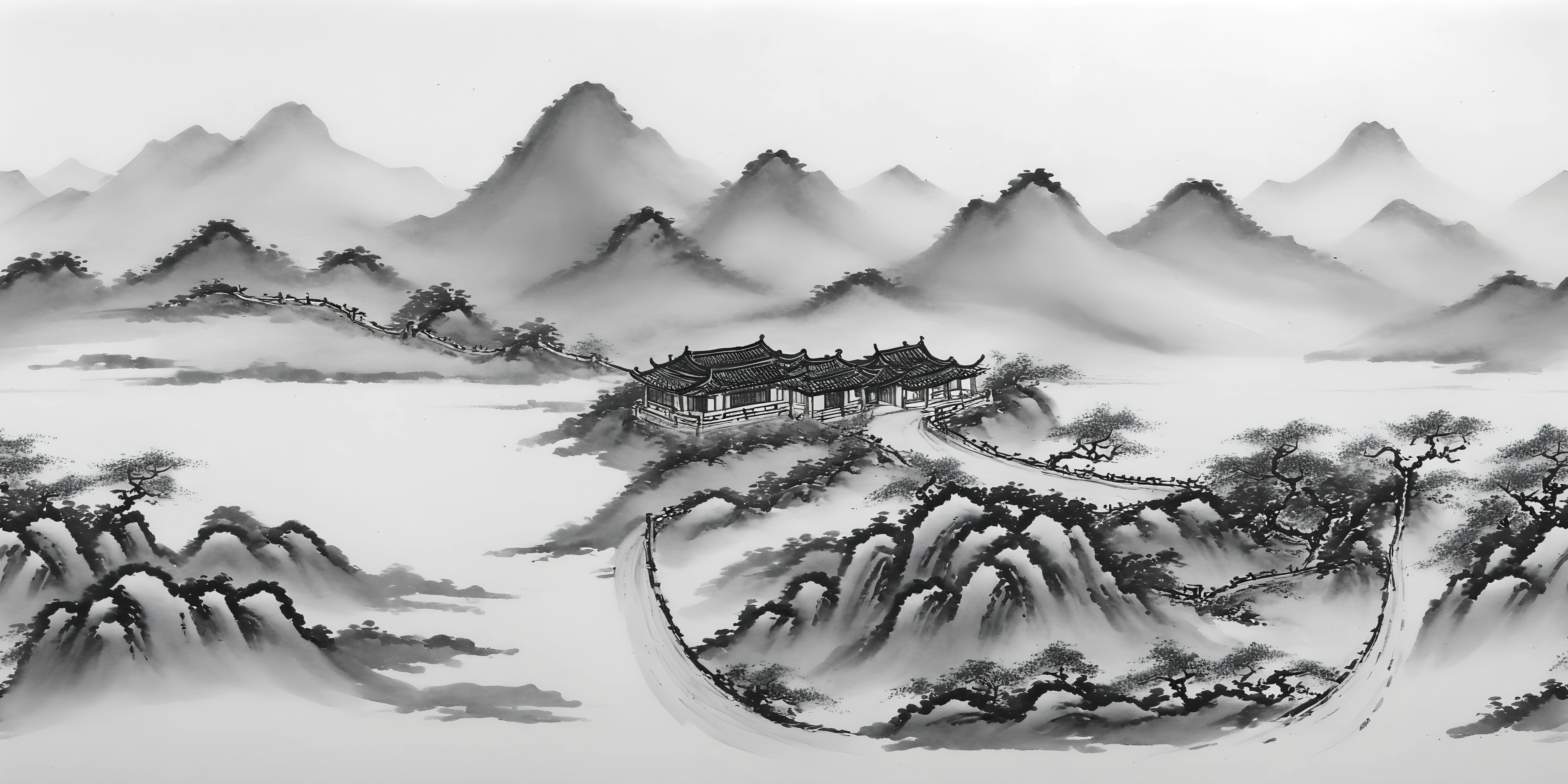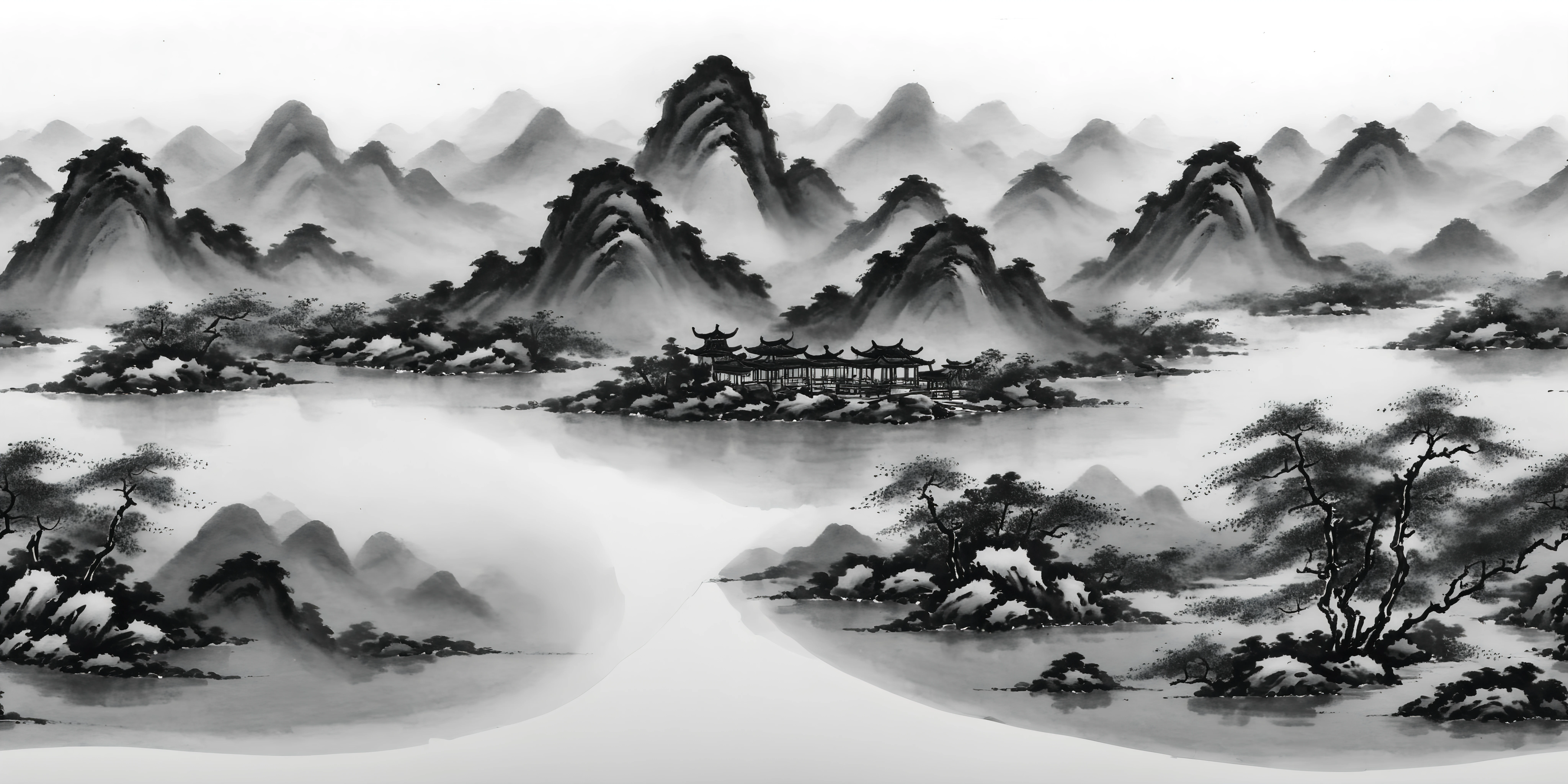 水墨山水画风格,可以结合HMSG全景XL绘制出全景图。